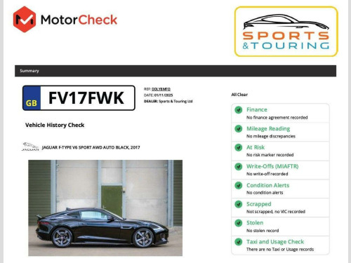 STUNNING CONDITION | PREMIUM 400 SPORT LEATHER with YELLOW STITCHING| PERFORMANCE SEATS | MERIDIAN SOUND | PANORAMIC ROOF | HEATED & COOLED SEATS | HEATED FLAT-BOTTOMED STEERING WHEEL | PERFECT 20-INCH ALLOY WHEELS in JAGUAR TECHNICAL GREY | ELECTRICALLY HEATED WINDSCREEN WITH TIMER | FRONT & REAR PARKING SENSORS | REVERSING CAMERA | CONFIGURABLE AMBIENT LIGHTING | PERFORMANCE BRAKES | SWITCHABLE ACTIVE SPORTS EXHAUST | POWER TAILGATE | DYNAMIC i | FRESHLY MAIN-DEALER SERVICED | We are delighted to list this stunning 400 SPORT, the most powerful V6 F-Type that Jaguar has ever produced. This example has been carefully maintained and presents in superb condition. The bodywork is in bright and clean ULTIMATE BLACK paint with TECHNICAL GREY accents, contrasted with the unique 400 SPORT badging and yellow stitch on the leather. The perfect 20-inch wheels wear the correct PIRELLI P-ZERO TYRES. This F-Type is superbly specified with HEATED & COOLED PERFORMANCE SEATS, HEATED FLAT-BOTTOMED STEERING WHEEL, MERIDIAN SOUND, DYNAMIC-i, ELECTRICALLY HEATED FRONT WINDSCREEN, FRONT & REAR PARKING SENSORS, REVERSING CAMERA, and many more extra-cost features, please see the full listing. This Coupe comes with a comprehensive MAIN DEALER and INDEPENDENT SPECIALIST service history. It will be supplied with two remote key fobs and owners wallet with handbook set. The registration is FV17 FWK. You can chat to us live via text or WhatsApp on 07831 445521. Were open seven days a week, from 8am until 8pm, by appointment. Please read our reviews on AutoTrader and Google - we are very proud of our achievements. Contact us for access to the Google drive for any of our cars, with high-resolution photos, service history, and full build specification, or request a video viewing. All of our cars are supplied with a comprehensive MotorCheck report and pre-delivery inspection. We provide a three-month, 3,000 mile warranty free of charge and twelve and twenty-four-month options are also available. Please ask us about trading-in; we will give you sound advice.