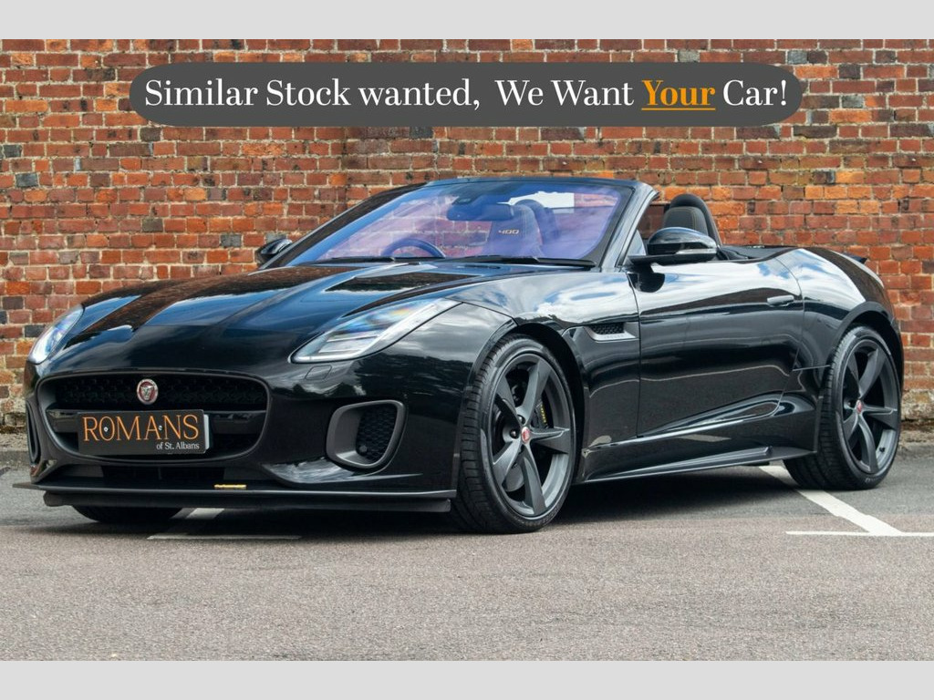 DEPOSIT TAKEN-SIMILAR WANTED! Romans of St Albans are delighted to present this beautiful 1 owner Santorini Black Jaguar F-Type 400 Sport. Optional Extras to include: Reverse Park Camera, Heated and Cooled Front Seats, Heated Front Windscreen and more... FINANCE AVAILABLE. A £299 admin fee applies to third party finance companies being used. ULEZ COMPLIANT. FREE ON-SITE PARKING (ASK FOR DETAILS.) Romans after care package includes: Romans warranty for 6 months (12,24 & 36 months are available), Main dealer cover available, Free breakdown cover for warranty duration, Full Romans service prior to delivery, 84 point vehicle inspection, 12 months MOT, Free Life time MOT when servicing with us (ask for details), Total value of package: £2000 - ALL INCLUSIVE IN THE PRICE. All of our clients have the added peace of mind that we have our own workshop facilities with free courtesy cars. Part Exchange very welcome, nationwide delivery also available. To avoid a wasted journey we highly recommend making an appointment, so call us now to get yours booked! Romans provide the highest of quality vehicles, and have at least 80 cars in stock at any one time. This means not all cars can be kept on site. This will also allow us to give you our fully undivided attention when viewing the vehicle you are interested in, WE ARE LOOKING TO BUY YOUR TOP SPEC, LOW MILEAGE, FULL SERVICE HISTORY PRESTIGE, SPORTS, AND 4X4 VEHICLES. GET MORE FOR YOUR VEHICLE BY EITHER SELLING TO US, OR ASK 12-Way Electric Front Seats with Memory, 20in Alloy Wheels - 5 Spoke Style 5060 w, 4 Airbags, 400 SPORT Branded Flat-Bottom Leather St, 400 Sport Badge, 400 Sport Performance Seats, 5in Display with Instrument Panel - 190m, 8in Touchscreen, ABS - Anti-locking Braking System, Adaptive Dynamics, Aluminium Gearshift Paddles, Analogue Dials, Auto-Dimming Interior Rear View Mirror, Autonomous Emergency Braking, Black Brake Calipers with Yellow 400 Spo, Black Brushed Aluminium Centre Console w, Black Grille, Black Vent Surrounds, Bluetooth Connectivity, Boot Entrapment Release Lever, Bright Metal Pedals, Carpet Mats - Nubuck Edged, Configurable Ambient Interior Lighting, Configurable Dynamics, Con