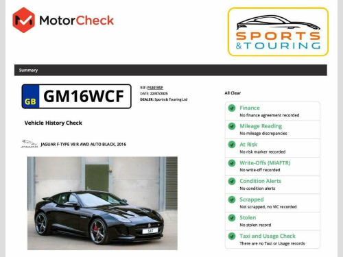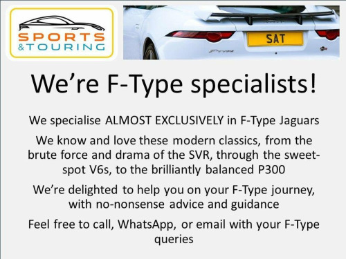 Please note: we do not accept reservations made without direct customer contact first! LOW MILEAGE | BEAUTIFUL CONDITION | EXCELLENT SPECIFICATION | FRESHLY SERVICED | PANORAMIC ROOF | PREMIUM LEATHER with RED STITCHING | 20-inch BLADE PATTERN ALLOY WHEELS with CARBON INSERTS | SPORT DESIGN PACK | RED SEAT BELTS | HEATED PERFORMANCE SEATS | HEATED STEERING WHEEL | FULL 14-WAY MEMORY SEATS | DYNAMIC-I | CONFIGURABLE AMBIENT LIGHTING | SMART KEY SYSTEM with KEYLESS ENTRY | MERIDIAN SOUND | BLACK PACK | REVERSING CAMERA | ELECTRICALLY HEATED WINDSCREEN with TIMER | HEATED POWERFOLD AUTODIMMING MIRRORS | POWER TAILGATE | FRONT & REAR PARKING SENSORS | BLIND SPOT MONITOR | VALET MODE As F-Type specialists we are delighted to offer this stunning V8R Coupe, in ULTIMATE BLACK (SANTORINI BLACK) METALLIC paint with BLACK DESIGN PACK, and featuring a striking JET LEATHER INTERIOR with RED CONTRAST STITCHING and RED SEAT BELTS, and HEATED PERFORMANCE SEATS, and sitting on THE MOST EXPENSIVE WHEEL OPTION, 20-inch BLADE ALLOYS with PIRELLI P-ZERO TYRES (we can offer other wheel and tyre combinations, please ask). The options list is very extensive, please see the full description for all the extra-cost features on this Jaguar. This Coupe has been diligently cared for, and comes with extensive service history, and will be freshly serviced for its new keeper. Inside and outside, everything is in superb order, and this Jaguar car drives perfectly. This V8R will be supplied with two remote key fobs and owners wallet with handbook set. The registration is GM16 WCF. You can chat to us live via text or WhatsApp on 07831 445521! Were open seven days a week, from 8am until 8pm, by appointment. Please read our reviews on AutoTrader and Google - we are very proud of our achievements. Ask us about part-exchange, we will give you sound advice.