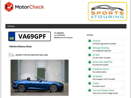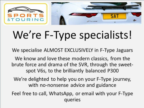 PLEASE NOTE: We do not accept deals through AutoTrader. Please contact us directly. Were F-Type Specialists! | BEAUTIFUL CONDITION | RARE BLUEFIRE paint | PERFECT STYLE 1066 20-INCH ALLOY WHEELS (other wheels available) | BLACK PACK | DESIGN PACK in BODY COLOUR | HEATED & COOLED 12-way SEATS with MEMORY | HEATED STEERING WHEEL | PREMIUM EXTENDED JET LEATHER cockpit with CONTRAST LIGHT OYSTER STITCH | STAINLESS STEEL PEDALS | POWERFOLD MIRRORS | KEYLESS ENTRY & START | ELECTRICALLY HEATED WINDSCREEN with TIMER | DUAL-ZONE CLIMATE CONTROL | REVERSE CAMERA | FRONT & REAR PARKING SENSORS | BLACK INTERIOR PACK | CONFIGURABLE DYNAMICS | APPLE CARPLAY/ANDROID AUTO | CONFIGURABLE AMBIENT LIGHTING | PIRELLI P-ZERO TYRES (talk to us about other tyre options) | As F-Type specialists, it is a rare pleasure to offer this beautiful F-Type V8R AWD Convertible, in rare and eye-catching BLUEFIRE paint. This gorgeous roadster is in perfect condition and is brilliantly specified with a huge range of optional extras including DESIGN PACK in BODY COLOUR, HEATED & COOLED 12-way SEATS with MEMORY, HEATED STEERING WHEEL, PREMIUM EXTENDED JET LEATHER cockpit with CONTRAST LIGHT OYSTER STITCH and much more. This Jaguar is in excellent condition inside and out and has a comprehensive service history from JAGUAR MAIN DEALERS and will be serviced prior to handover. It is supplied with two remote key fobs and owners documentation. The registration is VA69 GPF. You can chat to us live via text or WhatsApp on 07831 445521. Were open seven days a week, from 8am until 8pm, by appointment. Please read our reviews. Contact us for access to the Google drive for any of our cars, with high-resolution photos, service history, and full build specification, or request a video viewing. All our cars are supplied with a comprehensive MotorCheck report and pre-delivery inspection. Please ask us about trading-in; we will give you sound advice.