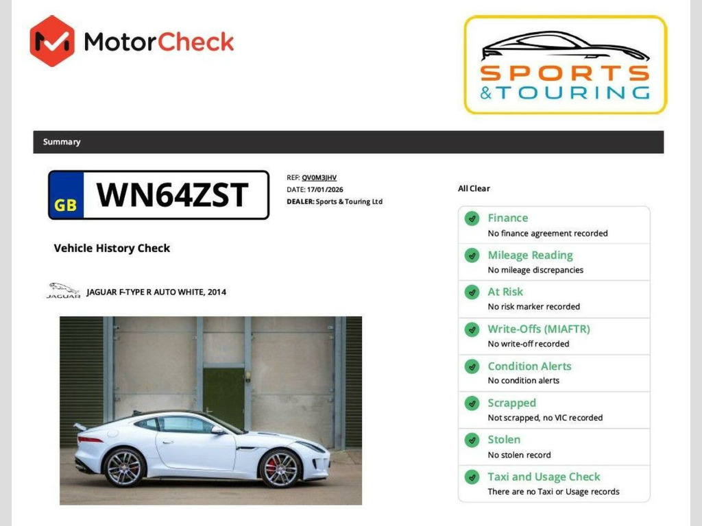RARE & COLLECTABLE REAR-WHEEL DRIVE V8R | BRILLIANT CONDITION | PANORAMIC ROOF | BRIGHT POLARIS WHITE | JET LEATHER R PERFORMANCE SEATS WITH RED STITCHING | HEATED SEATS | 14-WAY MEMORY SEATS with ADJUSTABLE SIDE BOLSTER & LUMBAR SUPPORT | POWERED TAILGATE | PERFECT 20-INCH GYRODYNE WHEELS in LIGHT SHADOW CHROME | ELECTRICALLY HEATED WINDSCREEN WITH TIMER | FRONT & REAR PARKING SENSORS | REVERSING CAMERA | CONFIGURABLE AMBIENT LIGHTING | PIRELLI P-ZERO TYRES | MERIDIAN SOUND | As acknowledged F-Type specialists, we are delighted to list another rare and collectable F-Type R in rare Rear-Wheel Drive configuration, perhaps the connoisseurs variant of this modern classic. This example is in fabulous condition belying its mileage and looks brilliantly eye-catching in POLARIS WHITE paint with CHROME PACK and resting on freshly factory-refurbished 20-INCH GYRODYNE WHEELS in LIGHT SHADOW CHROME (other wheels are available). This Coupe is packed with options including PANORAMIC ROOF, HEATED R PERFORMANCE MEMORY SEATS, MERIDIAN SOUND, POWERED TAILGATE and many more extra-cost features, please see the full listing. This F-Type comes with a very comprehensive service history and is supplied with two remote key fobs and owners wallet with handbook set. The registration is WN64 ZST. You can chat to us live via text or WhatsApp on 07831 445521. Were open seven days a week, from 8am until 8pm, by appointment. Please read our reviews on AutoTrader and Google - we are very proud of our achievements. Contact us for access to the Google drive for any of our cars, with high-resolution photos, service history, and full build specification, or request a video viewing. All our cars are supplied with a comprehensive MotorCheck report and pre-delivery inspection. We provide a three-month, 3,000 mile warranty free of charge and twelve and twenty-four-month options are also available. Please ask us about trading-in; we will give you sound advice.