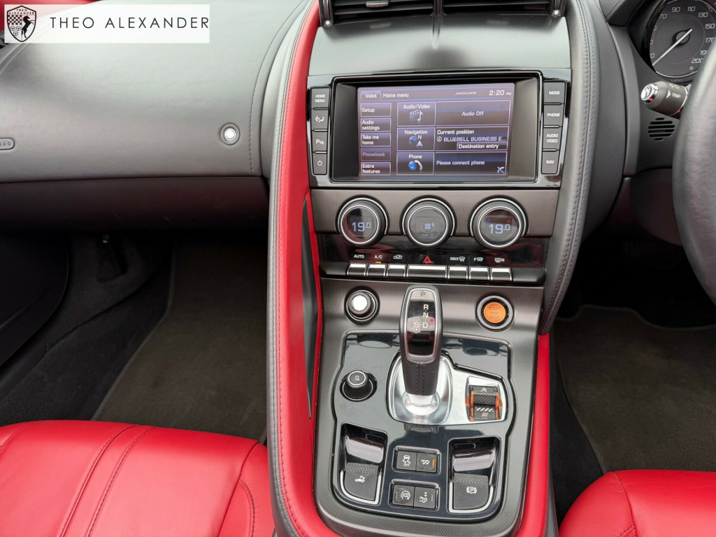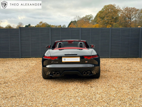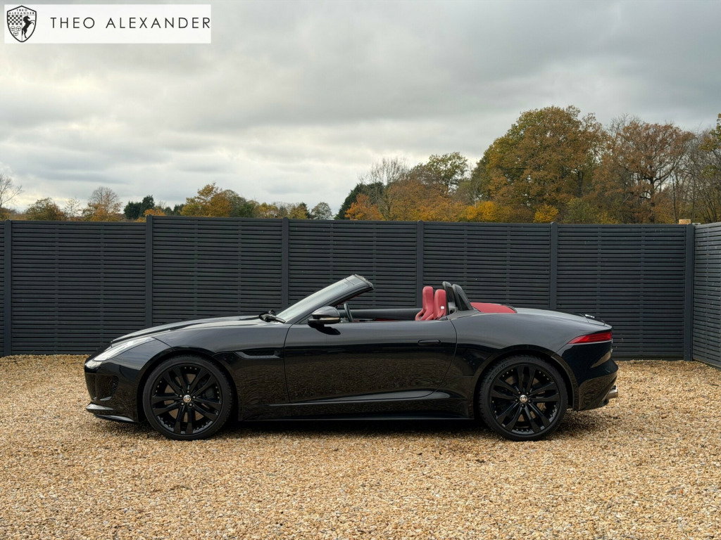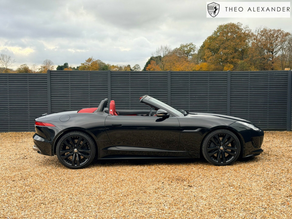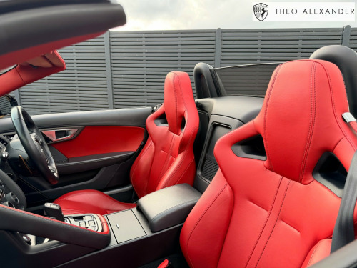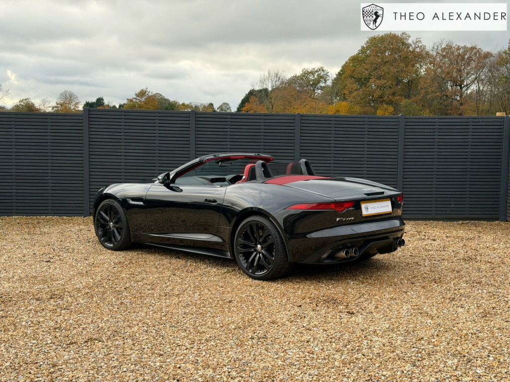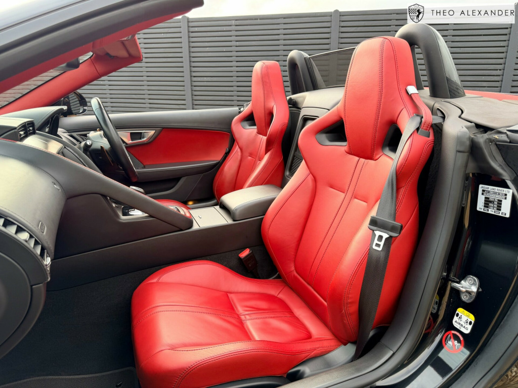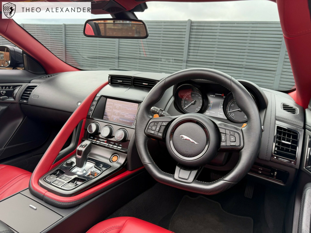 Theo Alexander are pleased to offer this Jaguar F-type S 5.0 V8 Supercharged., presented in Black Metallic with Red Premium leather interior, complete with full service history.This Car Comes With Ultimate Black Metallic Red premium Red LeatherRed Cabriolet Roof Meridian Sound Black Pack 20' Tornado Wheels in BlackExtended Leather Switchable Sports Exhaust Jaguar Super Performance Brakes with Black callipers Reverse Camera Bluetooth DABFront Parking sensors Heated windscreen Rain sensing wipers Seat memory pack 2 in alloy wheels - silver turbine, active sports exhaust, convertible roof - full electric black, door mirrors - electric adjustment-heated with side repeaters, electric windows - front with one touch open and close-anti trap, jaguar tyre repair system, rear spoiler - body coloured, s badge, tinted rear window, abs - anti-locking braking system, airbags - driver, airbags - front side, airbags - passenger, airbags - side curtain, dynamic stability control and winter mode, eba - emergency brake assist, ebd - electronic brake-force distribution, epb - electronic parking brake - drive away release, jaguar super performance braking system with red calipers, pedestrian contact sensing and deployable bonnet, remote control central locking with dead locking and drive-away locking, roll over protection bars - gloss black, volumetric sensing, asl - automatic speed limiter, adaptive dynamics, cruise control, electronic active differential, power steering - speed sensitive, rear parking aid with touch screen visual indicator, sports suspension, air particle and odour filtration, auto-dimming interior rear view mirror, centre console - dark hex aluminium with s graphic, configurable ambient interior lighting - dual colour with mixing pallete, header and headlining - jet, seats - electric driver-passenger adjustment - 6x6 way, single zone automatic climate control, sports sunvisor, steering column - electrically adjustable, steering wheel - 3-spoke-leather-shift paddles, twin front cupholders, automatic headlight washers, headlights - bi-function hid xenon with led daytime running lights, auxiliary power sockets, bluetooth telephone connectivity, cd player - am/fm radio, dab radio receiver, jaguar 180w sound system - 6 speakers, navigation with route guidence with traffic messaging channel, usb and aux socket in centre cubby box