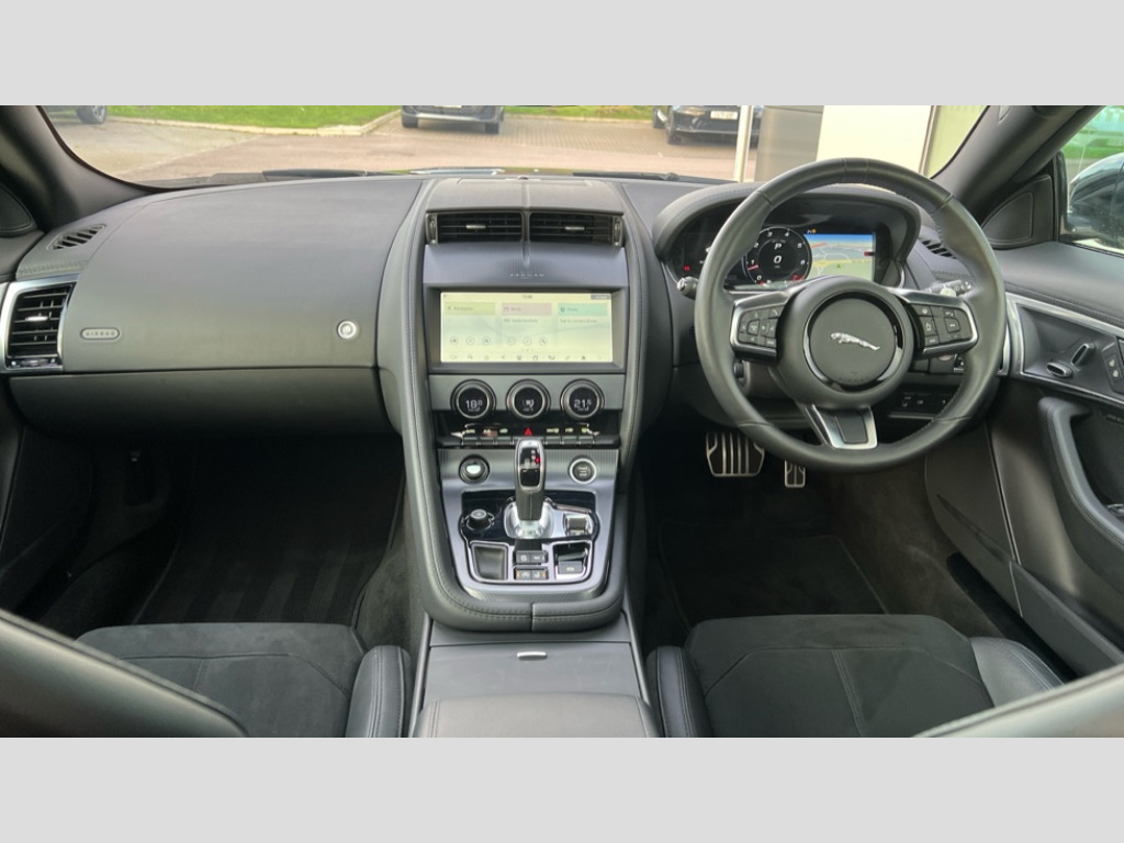 Jaguar F-Type 2.0 P300 R-Dynamic 2dr Auto 10" touch screen, Android Auto, Apple CarPlay preparation, Bluetooth telephone connectivity, Boot entrapment release lever, Connected navigation pro, Cruise control + speed limiter, Driver condition monitor, Incontrol pro service, InControl remote premium, Interactive driver display, Lane departure warning system, Lane keep assist, PAS, Push button start, Rear view camera, Stop/start system, Traffic sign recognition with adaptive speed limiter, Trip computer, Open differential with torque vectoring by braking, Passive suspension, Audio remote control, Digital Audio Broadcast radio-DAB, InControl app, InControl protect, Auto dimming rear view mirror, Automatic headlights, Body coloured door mirror caps, Chrome exhaust finisher, Deployable boot lid spoiler, Electric front windows, F-Type badge, Flush exterior door handles, Headlight washers, Infra red reflective glass, LED tail lights, Quad outboard mounted exhaust pipes, R Dynamic badge, Rain sensing windscreen wipers, Solar attenuating windscreen, Switchable active exhaust, Tinted glass, Bright metal foot pedals, Deployable front air vents, Front centre armrest, Front headrests, Jaguar sense, Low line cubby box, Lumbar support, Overhead console, Pollen filter, Power socket, Rain, Ice and snow mode, Twin front cupholders, USB with 12V socket in centre console, Online pack - F-Type, Smartphone pack - F-Type, 4 airbags in front, Anti-lock braking system (ABS), DSC - Dynamic Stability Control, Electronic brake force distribution, Electronic parking brake, Emergency brake assist, Emergency braking, Front/rear seatbelt pre-tensioners, Pedestrian contact sensing and deployable bonnet, Seatbelt reminder for driver and front passenger, Tyre pressure monitoring system, Deadlocks, Drive away door locking, Engine immobiliser, Locking wheel nuts, Perimetric and volumetric anti theft alarm, Remote central locking, Two stage unlocking, Valet mode