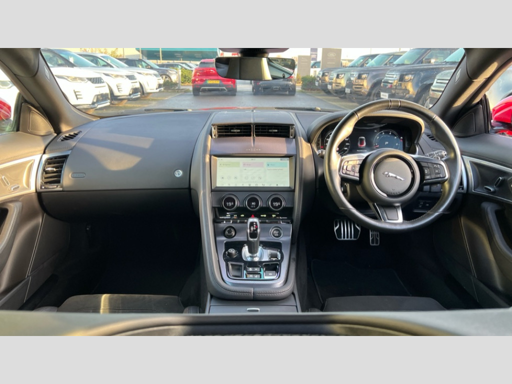 Jaguar F-Type 2.0 P300 R-Dynamic 2dr Auto 10" touch screen, Android Auto, Apple CarPlay preparation, Bluetooth telephone connectivity, Boot entrapment release lever, Connected navigation pro, Cruise control + speed limiter, Driver condition monitor, Incontrol pro service, InControl remote premium, Interactive driver display, Lane departure warning system, Lane keep assist, PAS, Push button start, Rear view camera, Stop/start system, Traffic sign recognition with adaptive speed limiter, Trip computer, Open differential with torque vectoring by braking, Passive suspension, Audio remote control, Digital Audio Broadcast radio-DAB, InControl app, InControl protect, Auto dimming rear view mirror, Automatic headlights, Body coloured door mirror caps, Chrome exhaust finisher, Deployable boot lid spoiler, Electric front windows, F-Type badge, Flush exterior door handles, Headlight washers, Infra red reflective glass, LED tail lights, Quad outboard mounted exhaust pipes, R Dynamic badge, Rain sensing windscreen wipers, Solar attenuating windscreen, Switchable active exhaust, Tinted glass, Bright metal foot pedals, Deployable front air vents, Front centre armrest, Front headrests, Jaguar sense, Low line cubby box, Lumbar support, Overhead console, Pollen filter, Power socket, Rain, Ice and snow mode, Twin front cupholders, USB with 12V socket in centre console, Online pack - F-Type, Smartphone pack - F-Type, 4 airbags in front, Anti-lock braking system (ABS), DSC - Dynamic Stability Control, Electronic brake force distribution, Electronic parking brake, Emergency brake assist, Emergency braking, Front/rear seatbelt pre-tensioners, Pedestrian contact sensing and deployable bonnet, Seatbelt reminder for driver and front passenger, Tyre pressure monitoring system, Deadlocks, Drive away door locking, Engine immobiliser, Locking wheel nuts, Perimetric and volumetric anti theft alarm, Remote central locking, Two stage unlocking, Valet mode