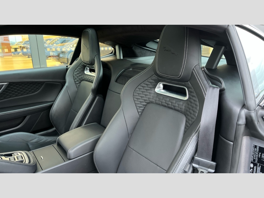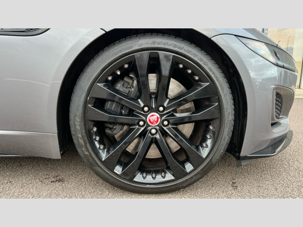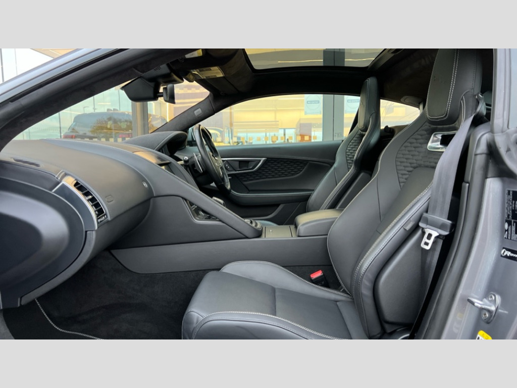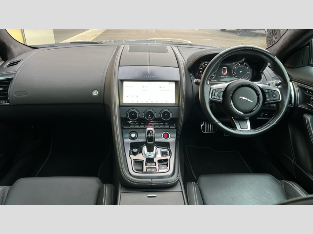 Jaguar F-Type 5.0 P450 S/C V8 R-Dynamic Black 2dr Auto AWD 10" touch screen, Android Auto, Apple CarPlay preparation, Bluetooth telephone connectivity, Boot entrapment release lever, Connected navigation pro, Cruise control + speed limiter, Driver condition monitor, E-call, Incontrol pro service, InControl remote premium, Interactive driver display, Lane departure warning system, Lane keep assist, PAS, Push button start, Rear view camera, Stop/start system, Traffic sign recognition with adaptive speed limiter, Trip computer, Adaptive dynamics, Configurable dynamic mode, Electronic active differential with torque vectoring by braking, Audio remote control, Digital Audio Broadcast radio-DAB, InControl app, InControl protect, Auto dimming rear view mirror, Auto dimming/power fold heated door mirrors with memory function, Automatic headlights, Body colour bonnet louvres, Body coloured door mirror caps, Body coloured roof, Chrome exhaust finisher, Deployable boot lid spoiler, Electric front windows, Flush exterior door handles, Headlight washers, Illuminated metal treadplates with brand name script, Infra red reflective glass, LED 3rd brake light, LED tail lights, Metallic paint, Quad outboard mounted exhaust pipes, R Dynamic badge, R-Dynamic exterior body kit, Rain sensing windscreen wipers, Rear boot, Solar attenuating windscreen, Switchable active exhaust, Tinted glass, 12 way heated and cooled electric memory front seats, Aluminium gear shift paddles, Bright metal foot pedals, Deployable front air vents, Ebony door release, Electrically adjustable steering column with memory, Front centre armrest, Front headrests, Jaguar sense, Limited Edition interior, Low line cubby box, Lumbar support, Monogram embossed Suedecloth binnacle, Monogram embroidery on seats and door insert, Nubuck edged carpet mats, Overhead console, Pollen filter, Power socket, R-Dynamic black leather steering wheel, Rain, Ice and snow mode, Single front passenger seat, Suede cloth headlining - Ebony, Suedecloth sun visors with mirrors, Twin front cupholders, USB with 12V socket in centre console, Windsor leather upholstery with performance seats, Black exterior pack - F-Type - R Dynamic AWD Coupe, Online pack - F-Type, Smartphone pack - F-Type, 380mm Front and 376mm Rear brakes, 6 airbags - Driver, front passenger, curtain and side airbags, Anti-lock braking system (ABS), DSC - Dynamic Stability Control, Electronic brake force distribution, Electronic parking brake, Emergency brake assist, Emergency braking, Front/rear seatbelt pre-tensioners, Pedestrian contact sensing and deployable bonnet, Seatbelt reminder for driver and front passenger, Tyre pressure monitoring system, Deadlocks, Drive away door locking, Engine immobiliser, Keyless entry, Locking wheel nuts, Perimetric and volumetric anti theft alarm, Remote central locking, Two stage unlocking, Valet mode, 20" 5 split spoke gloss black alloy wheels - style 5039