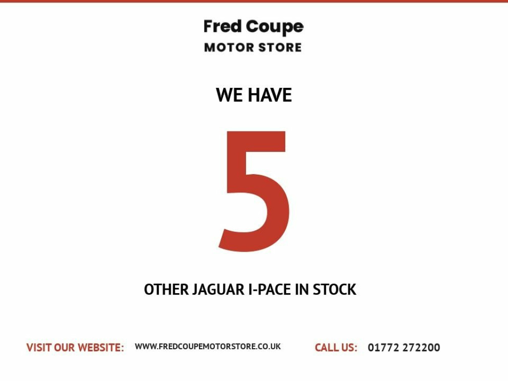 Don't miss this awesome example of Jaguar's 278 mile range 100% electric i-Pace. This 2021 four wheel drive All-Electric 90 KWH executive car is finished in the striking Corris Grey with a luxury Ebony leather interior. The front seats are electric, memory, heated and cooled and the steering wheel, front windscreen and rear seats are heated. Specification includes; satellite navigation, rear colour parking camera and front and rear parking sensors. There is automatic headlights and wipers, electric tailgate , i-key and sun protection glass. Full Jaguar service history. Fred Coupe's were chosen in 2010 by Nissan to be a pioneer electric vehicle specialists and have highly trained sales advisers and technical staff with years of experience. Because of this we have a huge knowledge of electric vehicles to compliment our specialist workshops . WE ONLY ADVERTISE SOME OF OUR STOCK ON AUTOTRADER see www.fredcoupe.co.uk FOR FULL CURRENT STOCK. Fred Coupe is a NISSAN and INFINITI authorised repairer and a multiple global award winner for customer service as well as a 4th generation family business. We pride ourselves on quality, reliability, great service and good value. *Buy online, visit www.fredcoupe.co.uk * 12V Power Socket in Loadspace, 12V Power Sockets, 16-Way Heated and Cooled Electric - Driv, 2-Zone Climate Control, 20in Alloy Wheels - Style 5068 with Glos, 3 Rear Headrests, 3-Flash Lane Change Indicators, 40-20-40 Folding Heated Rear Seats with , 40-20-40 Split Fold Rear Seat, 6 Airbags, ABS - Anti-locking Braking System, ASPC - All Surface Progress Control, Acoustic Laminated Windscreen, Active Sound Design, Active Vanes, Adaptive Cruise Control with Steering As, Air Quality Sensor, Android Auto, Animated Directional Indicators, Apple CarPlay, Auto-Dimming Interior Rear View Mirror, Black Exterior Pack, Blind Spot Assist, Bluetooth Connectivity, Brake Pad Wear Indicator, Cabin Lighting,