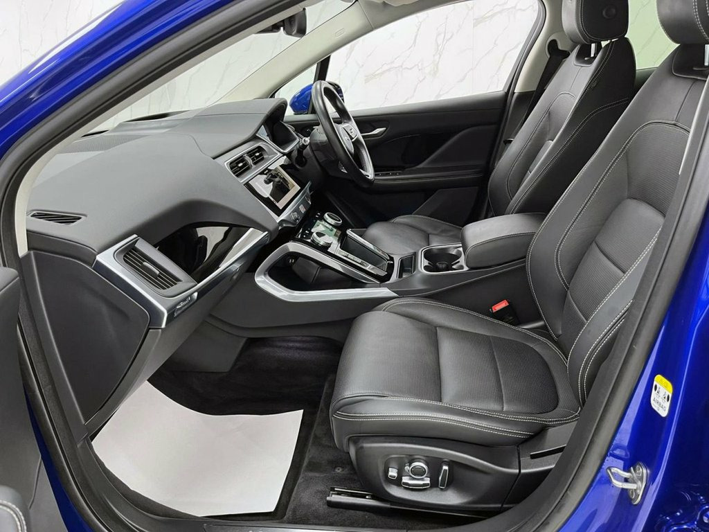 This 2021 Jaguar I-PACE 400 HSE has been meticulously maintained by its single owner, boasting a full service history and an MOT valid until August 2026. As a fully electric vehicle, it offers a sophisticated driving experience with its Four Wheel Drive system and a substantial 90 kWh battery, providing a maximum range of 280 miles when new. The HSE trim level ensures a premium feel, complemented by notable features such as a heated steering wheel for those colder mornings, advanced Matrix LED headlights with signature Daytime Running Lights for enhanced visibility, and Adaptive Cruise Control with Steering Assist for effortless journeys. Connectivity is seamless with Apple CarPlay integration, and convenience is further enhanced by Keyless Entry.  Experience the exhilarating performance of this I-PACE, capable of accelerating from 0 to 60mph in a swift 4.5 seconds, a testament to its electric power. This impressive acceleration, combined with its 280 mile range, positions it favourably against other electric vehicles. Furthermore, the generous boot space offers practicality for all your needs, whether it's for daily errands or longer trips. Charging is convenient, with a full charge taking approximately 12 hours and 36 minutes at home using a 7kW charger, and a rapid 50 minutes to reach 80% charge at a public charging station. Fixed Panoramic Roof, Windsor Leather - Light Oyster with Ebon, Caesium Blue, 12V Power Socket in Loadspace, 12V Power Sockets, 16-Way Heated and Cooled Electric - Driv, 2-Zone Climate Control, 20in Alloy Wheels - 5 Spoke - Style 5068, 3 Rear Headrests, 3-Flash Lane Change Indicators, 3-Phase 11kW AC Onboard Charger, 40-20-40 Folding Heated Rear Seats with , 40-20-40 Split Fold Rear Seat, 6 Airbags, ABS - Anti-locking Braking System, AM-FM Radio, ASPC - All Surface Progress Control, Acoustic Laminated Windscreen, Active Sound Design, Active Vanes, Adaptive Cruise Control with Steering As, Android Auto, Animated Directional Indicators, Apple CarPlay, Auto-Dimming Interior Rear View Mirror, Bl