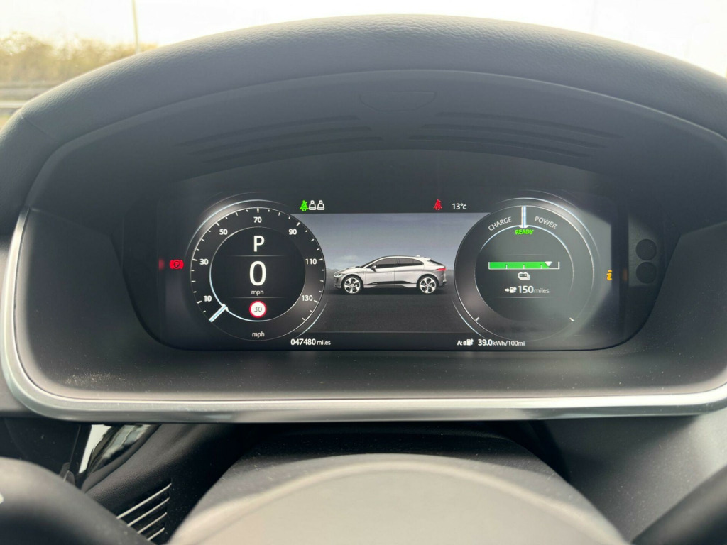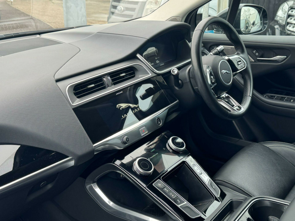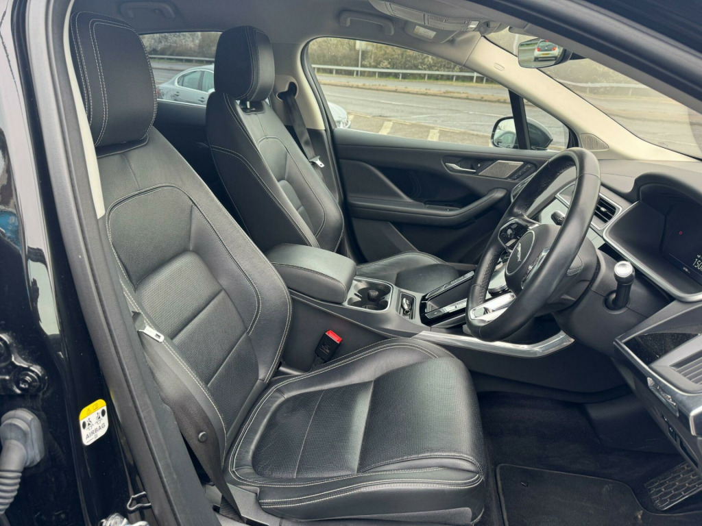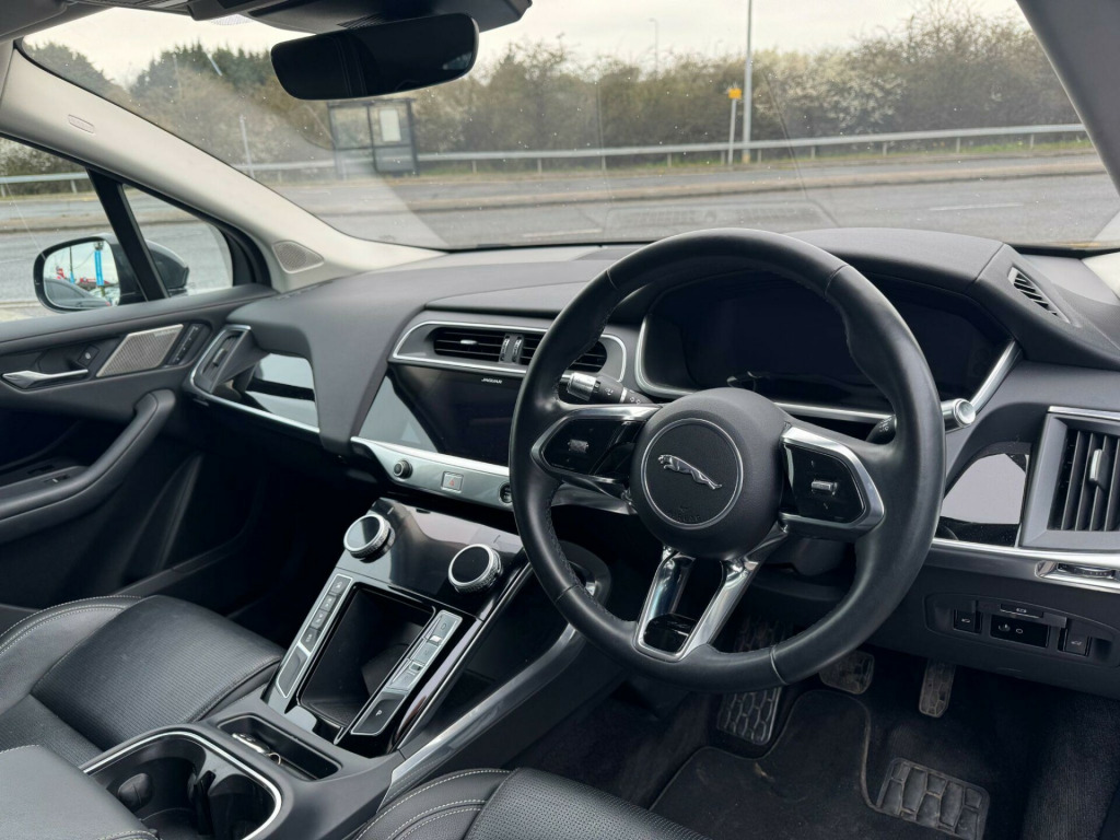 This 2019 Jaguar I-PACE 400 SE is presented with a clear vehicle history check, offering peace of mind for its next owner. As an all electric, four wheel drive vehicle, it combines advanced technology with Jaguar's renowned style. The SE trim level ensures a premium experience, complemented by notable features such as Premium LED Headlights with Signature Daytime Running Lights, a Rear Camera, and the Park Pack which includes both front and rear parking sensors. For enhanced driving convenience, the Drive Pack adds Adaptive Cruise Control and Blind Spot Assistance, while Bluetooth connectivity keeps you connected on the go.Experience impressive performance with the I-PACE, capable of accelerating from 0 to 60mph in just 4.5 seconds, a highlight that sets it apart from many other vehicles. This electric SUV boasts a substantial 90 kWh battery, providing a maximum range of 292 miles when new, indicating its suitability for both daily commutes and longer journeys. Charging is convenient, with a full charge taking approximately 12 hours and 36 minutes at home using a 7kW charger, and a rapid charge to 80% achievable in around 50 minutes at a public charging station. Furthermore, the I-PACE offers generous large boot space, making it a practical choice for families and those needing ample storage.. 10-Way Electric Memory Front Seats, 10in Touch Pro, 12V Power Socket in Loadspace, 2-Zone Climate Control, 20in Alloy Wheels - 6 Spoke - Style 6007 Gloss Sparkle Silver, 3 Rear Headrests, 3-Flash Lane Change Indicators, 6 Airbags, 60-40 Split Fold Rear Seat, ABS - Anti-locking Braking System, AM-FM Radio, ASPC - All Surface Progress Control, Acoustic Laminated Windscreen, Air Quality Sensor, Ambient Interior Lighting, Auto-Dimming - Power Fold - Heated Door Mirrors with Memory and Approach Lights, Auto-Dimming Interior Rear View Mirror, Bluetooth Connectivity, Body Coloured Door Mirror Caps, Body Coloured Roof, Brake Pad Wear Indicator, Chrome Side Window Surround, Coil Suspension, Cold Climate Pack, Connect Pro, Digital Audio Broadcast - DAB - Radio, Drive Pack, Driver Condition Monitor, Dynamic Stability Control - DSC, EBA - Emergency Brake Assist, EPB - Electric Parking Brake, EV400 Badge, Ebony Carpet, Electric Cabin Pre-Conditioning, Electric Windows - Front and Rear with One-Touch Open-Close and Anti-Trap, Emergency Braking, Flush Exterior Door Handles, Follow Me Home Lighting, Front Storage Compartment, Front and Rear Cupholders, Global Lock-Unlock Switch on Driver Door, Gloss Black Grille with Satin Chrome Surround, Gloss Black Lower Front Blades, Gloss Black Trim Finisher, Grained Black Door Claddings, Headlight Power Wash, Headlights - Automatic Levelling, Heated Rear Window with Timer, Hill Launch Assist, Home Charging Cable, Hooks in Loadspace, Interactive Driver Display, Interior Front Door Handles with Separate Locking Switches, Intrusion Sensor, Jaguar Script and Leaper, JaguarDrive Control, Keyless Entry, LED Rear Reading Light, LED Tail Lights, Lane Keep Assist, Light Oyster Morzine Headlining, Lock Only Switch on Front Passenger Door, Lockable Glovebox, Locking Wheel Nuts, Low Power Mode, Low Traction Launch, Luggage Tie Downs in Loadspace, Meridian Sound System, Metal Treadplates with Jaguar Script, Navigation Pro System, Open Differential with Torque Vectoring by Braking, Outside Temperature Gauge, Overhead Lighting Console, Overhead Stowage for Sunglasses, Park Assist, Park Pack, Passive Suspension, Power Operated Child Locks, Power Sockets, Powered Tailgate, Premium LED Headlights with Signature DRL, Public Charging Cable, Rain Sensing Windscreen Wipers, Range for Route, Rear Bike Carrier Preparation Kit, Rear Camera, Rear Fog Lights, Remote, S Rear Bumper with Gloss Black Valance, SE Badge, Screw-in Recovery Eye, Seat Belt Reminder, Seats - Rear Centre Armrest, Secure Tracker, Smartphone Pack, Soft Grain Leather Sport Steering Wheel, Solar Attenuating Rear Windscreen, Solar Attenuating Windscreen, Speed Proportional Electronic Power Assisted Steering - EPAS, Start Up Sequence with Movement - Dials and Lighting, Storage Under Rear Seats, Sunvisors with Illuminated Vanity Mirrors, Tailgate Spoiler, Touch Pro Duo, Touch Pro System, Traffic Sign Recognition with Adaptive Speed Limiter, Tyre Pressure Monitoring System, Tyre Repair System, Variable Intermittent Wipers, Voice Control.