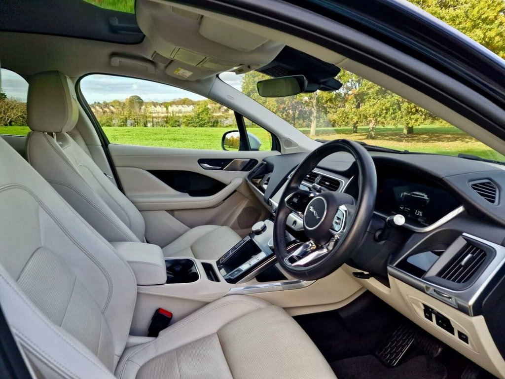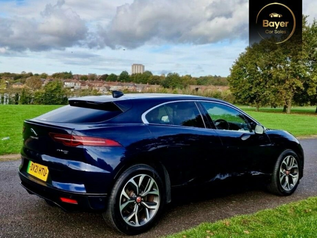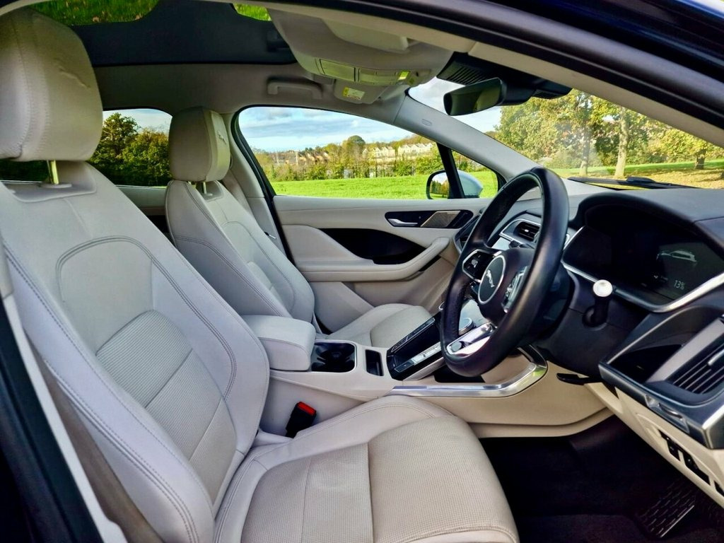 VERY RARE AIR SUSPENSION! This 2021 Jaguar I-PACE 400 SE offers an exceptional blend of performance and luxury, boasting a substantial 90 kWh battery that provides a maximum range of 280 miles when new. This electric vehicle features a sophisticated Four Wheel Drive drivetrain, ensuring confident handling in various conditions. Inside, you'll find exquisite Windsor Leather in Light Oyster with an Ebony and Light Oyster interior, complemented by supportive Performance Seats. The SE trim also includes striking 20 inch Alloy Wheels in a 5 split spoke Technical Grey design with a polished finish, and an Electronic Air Suspension for a smooth ride. Experience exhilarating acceleration with the I-PACE, capable of reaching 0-60mph in just 4.5 seconds, a performance that sets it apart from many other vehicles. Further enhancing the driving experience is the Fixed Panoramic Roof, which floods the cabin with natural light. Comfort is paramount, with 12 way heated electric front seats featuring driver memory and 2 way manual headrests. For convenient charging, a full charge at home using a 7kW charger takes approximately 12 hours and 36 minutes, while rapid public charging can replenish the battery from empty to 80% in as little as 50 minutes. VAT Qualifying. 10in PiVI Pro, 12-Way Heated Electric - Driver Memory F, 12V Power Socket in Loadspace, 12V Power Sockets, 2-Zone Climate Control, 20in Alloy Wheels - 5 Split-Spoke - Styl, 20in Alloy Wheels - 6 Spoke - Style 6007, 3 Rear Headrests, 3-Flash Lane Change Indicators, 3-Phase 11kW AC Onboard Charger, 360 Degree Surround Camera, 40-20-40 Folding Rear Seats with Centre , 6 Airbags, ABS - Anti-locking Braking System, Acoustic Laminated Windscreen, Active Sound Design, Active Vanes, AM-FM Radio, Android Auto, Apple CarPlay, ASPC - All Surface Progress Control, Auto-Dimming - Power Fold - Heated Door , Auto-Dimming Interior Rear View Mirror, Blind Spot Assist, Bluetooth Connectivity, Body Coloured Ro