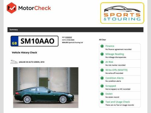 BEAUTIFUL CONDITION | LOW MILEAGE | STUNNING EMERALD FIRE PAINT | GORGEOUS CARAMEL LEATHER with BURR WALNUT VENEER | FRESHLY REFURBISHED CARAVELA WHEELS | BRAND NEW DUNLOP SP SPORT MAXX TYRES | 10-WAY MEMORY SEATS | HEATED SEATS | HEATED STEERING WHEEL | FRONT & REAR PARKING SENSORS | ACTIVE HEADLAMPS | SPACESAVER SPARE WHEEL | NEW HEADLINING PROFESSIONALLY INSTALLED | CARPLAY/ANDROID UPGRADE available | FRESH MAJOR SERVICE for handover | As Performance Jaguar specialists, it is a rare privilege to list this hugely impressive XK, in perhaps the most sought-after combination of EMERALD FIRE METALLIC PAINT and CARAMEL LEATHER with BURR WALNUT VENEER, and with only 26,479 miles on the odometer. This Grand Tourer is in utterly brilliant condition and has obviously been cherished by its three keepers, in addition to which it has received extensive attention in our workshop including a full restorative paint treatment, new headlining, refurbished wheels, and brand new DUNLOP SP SPORT MAXX TYRES all round. It comes with excellent service history and will have a fresh major service in our workshop ready for its new owner, in addition to which we have replaced the front brake discs and pads. It will be supplied with two remote key fobs and owners wallet with handbook set. The registration is SM10 AAO. You can chat to us live via text or WhatsApp on 07831 445521. Were open seven days a week, from 8am until 8pm, by appointment. Please read our reviews on AutoTrader and Google - we are very proud of our achievements. Contact us for access to the Google drive for any of our cars, with high-resolution photos, service history, and full build specification, or request a video viewing. All our cars are supplied with a comprehensive MotorCheck report and pre-delivery inspection. We provide a three-month, 3,000 mile warranty free of charge and twelve and twenty-four-month options are also available. Please ask us about trading-in; we will give you sound advice.