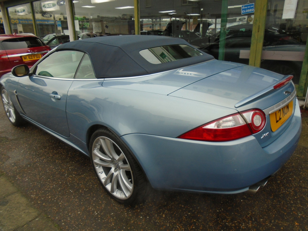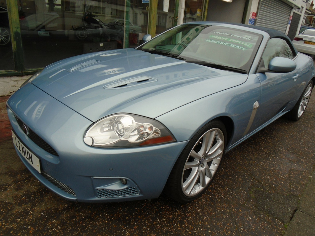 Jaguar XKR 4.2 CONVERTIBLE,2008 Finished in frost blue with the lovely special order maritime colour interior of Ivory white with reggata blue 2 tone interior with a navy mohair hood,and light grey carpets with overmats,stunning looking car with freshly refurbished 20 split rim staggered alloys and new tyres,lovely spec,heated seats,alpine sound,PDC,touch screen navigation,quad exhaust,power folds,keyles go,memory seats,auto xenons and winter pack, lovely car for the approaching summer. ULEZ COMPLIANT CAR