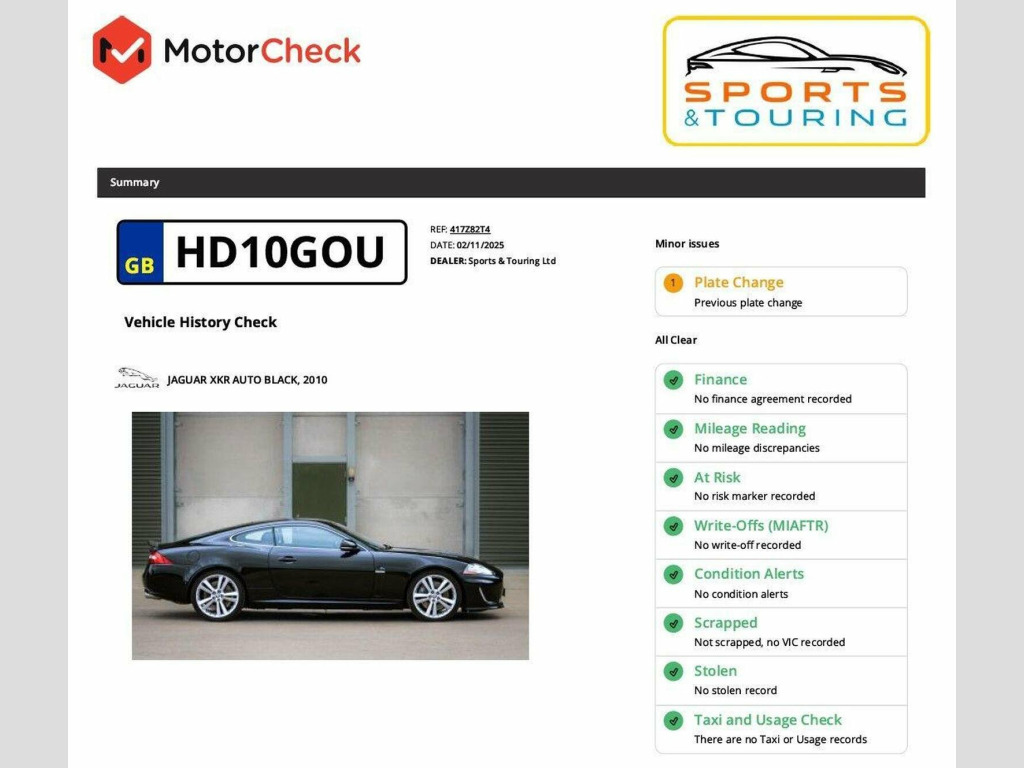 EXTRAORDINARY COLLECTIBLE CONDITION | ONE OWNER | ALWAYS GARAGED | NEVER DRIVEN IN THE WET | EXTREMELY LOW MILEAGE | with ORIGINAL MODEL YEAR BROCHURE & PRICE LIST, ORIGINAL BILL OF SALE, HUGE FILE OF DOCUMENTS, even the ORIGINAL KEY RINGS from the supplying dealer | STUNNING ULTIMATE BLACK over WARM CHARCOAL LEATHER with CRANBERRY STITCHING and PIANO BLACK VENEER | PERFECT KALIMNOS WHEELS | DUNLOP SP SPORT MAXX TYRES | ACTIVE HEADLIGHTS | ADAPTIVE CRUISE CONTROL | 16-WAY MEMORY SEATS | HEATED & COOLED SEATS | HEATED STEERING WHEEL | FRONT & REAR PARKING SENSORS | EXCELLENT COMPREHENSIVE SERVICE HISTORY | CarPlay/Android Auto available As Performance Jaguar specialists, it is a rare honour to offer this stunning XKR Coupe, in a refined palette of ULTIMATE BLACK over beautiful WARM CHARCOAL leather with CRANBERRY STITCHING and PIANO BLACK VENEER and with fewer than 7,500 miles on the odometer. This car is in Concours dElegance condition and has been cherished by its previous owner, and comes with comprehensive service history. It will be supplied with two remote key fobs and owners wallet with handbook set. The registration is HD10 GOU. You can chat to us live via text or WhatsApp on 07831 445521. Were open seven days a week, from 8am until 8pm, by appointment. Please read our reviews on AutoTrader and Google - we are very proud of our achievements. Contact us for access to the Google drive for any of our cars, with high-resolution photos, service history, and full build specification, or request a video viewing. All our cars are supplied with a comprehensive MotorCheck report and pre-delivery inspection. We provide a three-month, 3,000 mile warranty free of charge and twelve and twenty-four-month options are also available. Please ask us about trading-in; we will give you sound advice. Please note: reservation of this car through AutoTraders Deal Builder attracts a £200 administration fee.