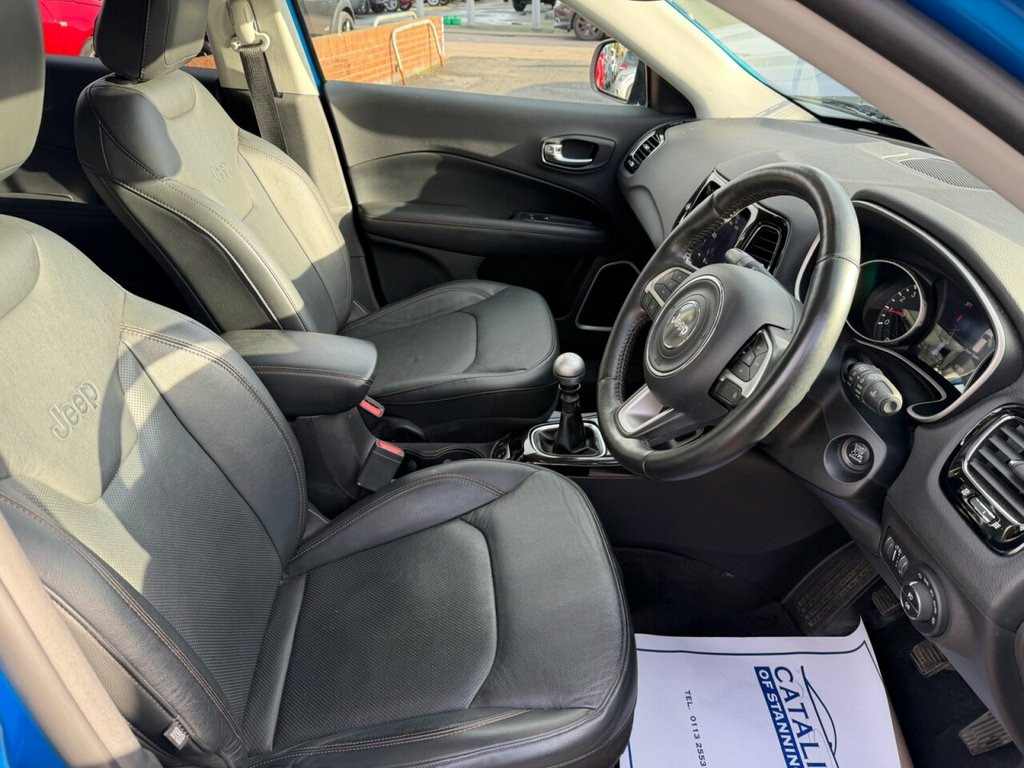 Jeep Compass 1.4T MultiAirII Limited – Heated Leather | Beats Audio | Great History Petrol | Manual | Euro 6 | 140 PS | 57,910 Miles | MOT Until 11-11-2026 This Jeep Compass 1.4T MultiAirII Limited is a stylish, well-maintained example of Jeep's premium compact SUV. With just 57,910 miles from new, only two owners, and seven services up to 57k, it has been cared for to a high standard throughout. Powered by the smooth and responsive 1.4-litre turbo petrol engine producing 140 PS, it offers comfortable performance and refined driving characteristics. Being Euro 6 compliant, it's ideal for modern clean-air zones and everyday use. Finished in a striking blue with a dark leather interior, this Limited model comes packed with premium features including satellite navigation, Bluetooth, a touchscreen system, heated seats, electric memory seats, alloy wheels, and the desirable Beats sound system for enhanced audio quality. A high-spec, low-mileage example of the Jeep Compass Limited — offering comfort, technology, and standout styling in a versatile SUV package. 2019 (68) JEEP COMPASS 1.4T MultiAirII Limited SUV 5dr is offered to you for sale in Pudsey, Leeds, finished in blue JEEP COMPASS 1.4T MultiAirII Limited SUV 5dr is one of many handpicked used cars that used car dealer, Catalina of Stanningley, Pudsey, Leeds have available for sale. 12V Auxiliary Power Outlet - Front, 18in Alloy Wheels - Silver and Tech Grey, 230v Auxiliary Power Outlet, 60-40 Rear Seat with Trunk Pass-Thru, Active Speed Limiting Device, Advanced Brake Assist, Airbags - Advanced Multistage Front - Fr, Alarm - Premium, All Speed Traction Control, All-Weather Floor Mats with Jeep Logo, Ambient LED Interior Lighting, Anti Lock 4 Wheels Disc Brake - ABS, Apple CarPlay and Android Auto Integrati, Auto Dimming Rear View Mirror, Autonomous Emergency Braking, Auxiliary 12v Power Outlet In Cargo Area, Beats Audio 9-Speaker System, Black Roof Rails with Chrome Inserts, Black and Chrome Front Grille, Blind Spot Monitoring and Cross-Path Det, Body Colour Exterior M