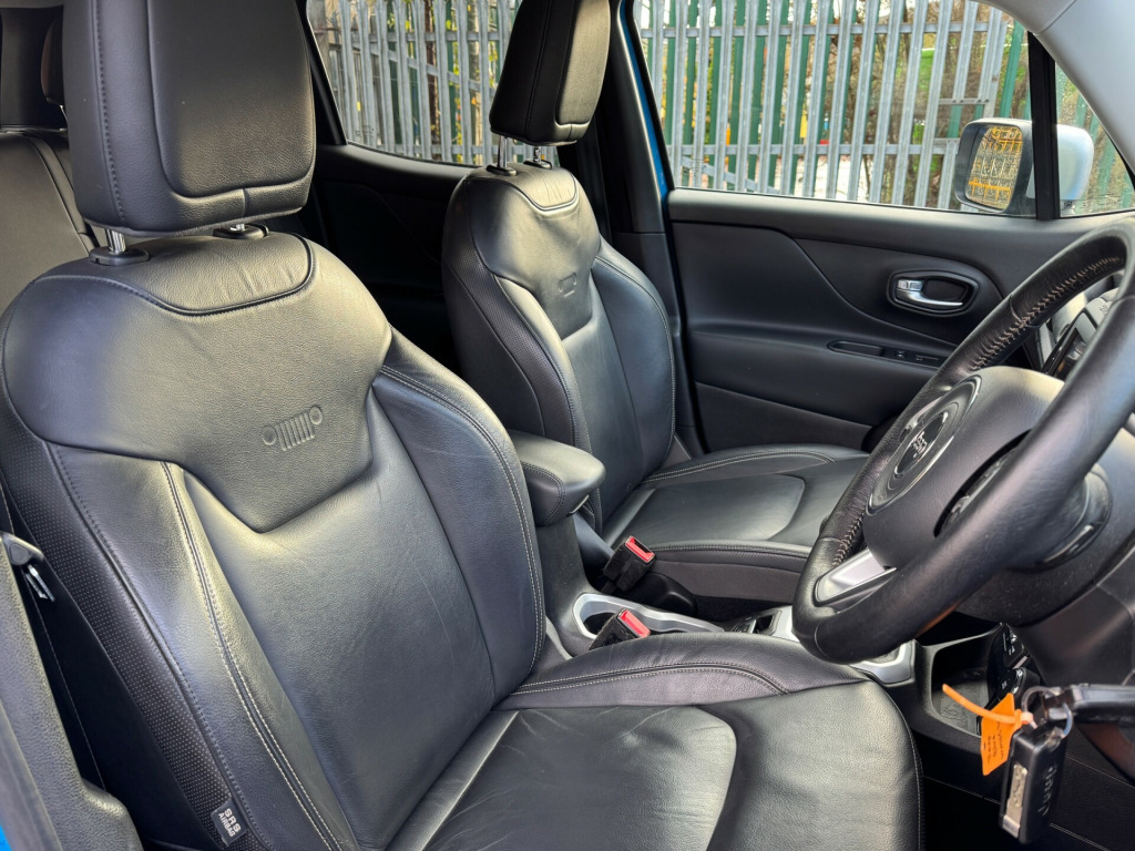 This 2015 Jeep Renegade 2.0 MultiJetII Limited SUV with 80910 miles is a reliable and efficient Diesel vehicle that is ULEZ compliant, making city driving hassle-free. This 5-door SUV comes with 5 seats, offering ample space for passengers and luggage. The Euro 6 engine with 140 ps provides a smooth and powerful drive, especially with the 4WD capability for off-road adventures. The Sierra Blue exterior is complemented by a luxurious black leather interior with satin silver bezel accents and stitching. The car also includes convenient features such as a full-size temporary spare tyre, reversible and height adjustable luggage compartment floor, and a 12V power socket. This Jeep Renegade is a reliable and stylish choice for those seeking a versatile and capable SUV.UK delivery available.Part exchange welcome.AA extended warranty partner.AA standards approved dealership.Trading standards approved dealership.Autotrader highly rated dealership. v power socket, aux-in, satellite navigation system, speakers x6, touchscreen - 6.5in, uconnect bluetooth, usb connectivity, uconnect dab radio, uconnect live, 18in alloy wheels - silver painted, adaptive rear brake lights, body coloured door handles, door mirrors - electric and heated, door mirrors - silver, electric windows - front one touch, exhaust tailpipes - chrome, grille - front in silver, privacy glass, roof rails - silver, abs - anti-lock brakes, airbags - drivers advanced multi stage, airbags - front curtain, airbags - passenger advanced multi stage, airbags - rear curtain, airbags - seat-mounted front side thorax, alarm - premium, autonomous emergency braking, erm - electronic roll mitigation, esc - electronic stability control, electric park brake, hill start assist, isofix child seat restraint system, passenger airbags deactivation, remote central locking, traction control, trailer sway damping - control, air conditioning - dual zone with automatic temperature control, ambient led interior lighting, armrest - rear, heated front seats, heated steering wheel, instrument cluster - 7in tft colour display, leather wrapped steering wheel, pollen filter, seats - 40-20-40 split folding rear, seats - drivers electric lumbar adjustment, steering column - tilt and telescopic, steering wheel - mounted audio controls, trunk pass-thru, cruise control, ecodrive - drive monitoring system, forward collision warning plus, lane departure warning plus, parking sensors - rear, power steering, speed limiter, trip computer, tyre pressure monitoring - warning display, daytime running lights, front fog lights