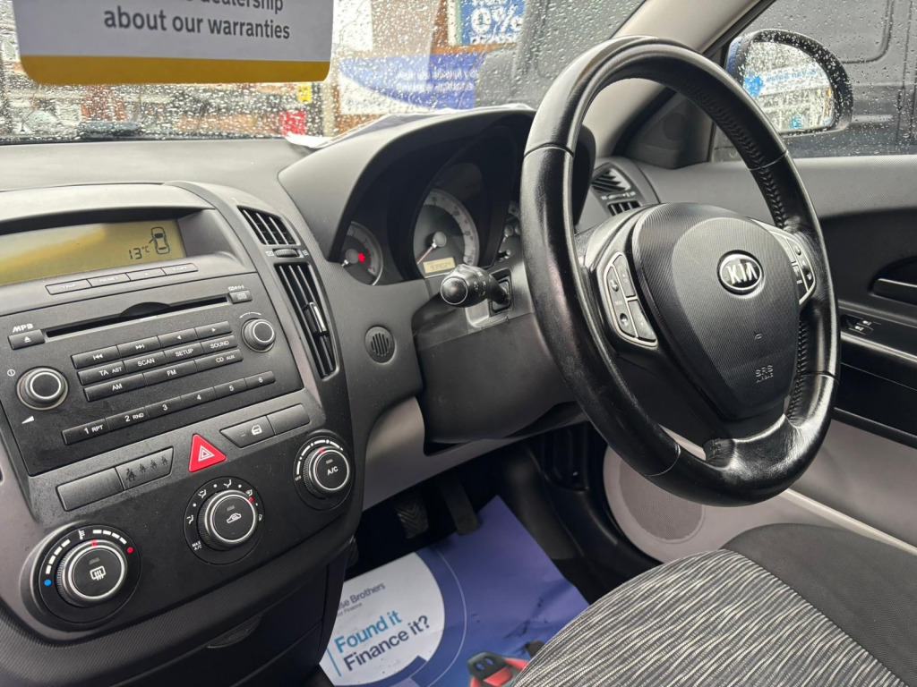 TO SEE OUR FULL RANGE OF OF OVER 20 CARS VISIT OUR WEBSITE: DEPOSIT THIS VEHICLE TODAY FROM LITTLE AS £99- RESERVE ONLINE TODAY!3 MONTHS AA APPROVED WARRANTY INCLUDED OPTIONAL EXTENDED PACKAGES AVAILABLENATIONWIDE DELIVERYFinanceable with our lender CLOSEBROTHERS MOTOR FINANCE- Apply with us today with the lowest APR Rates in our area!Low insurance and reliable car look no further! Just had new front discs and pads fitted by Nathan john car and van sales, previous lady owned, serviced every 5000 miles and over 9 service stampsHere we have a ULEZ compliant 2009 Kia Ceed 1.6 GS Estate boasts a manual transmission with full service history, 93847 miles on the clock, and MOT validity until 15/08/2026. Cars had have the timing done at 76642, With a 154 g/km emission rating and 120 bhp, this petrol-powered vehicle offers both power and efficiency. This vehicle is one of the most reliable cars in the range Kia did in 2009 and online people boast about how reliable these vehicles are. The spacious estate body style includes 5 doors and 5 seats, along with features like an adjustable steering column/wheel, air-conditioning, armrest, and cup holder. Ideal for those in need of a practical and reliable car, this Kia Ceed is ready to hit the road.Manufacturers database has been used in the cars preparation, including an interior engine cleaner added to the old oil prior to being drained, an anti-corrosion treatment applied to callipers, discs, and pads to protect against salt and water, and a fuel system cleaner designed reduce emissions and improve fuel consumption. We hope this description demonstrates the attention to detail that ensures this car, like all our cars are of a consistently high quality. Specialist routine servicing and aftercare backup is on hand should you require it, we thrive on family-based business standards alongside meeting FCA guidelines to make sure all our clients receive the best out of all our vehicles. We offer discounted warranty packages sold to clients at trade rates for that extra piece of mind. justable steering column/wheel, air-conditioning, armrest, clock, cup holder, electric windows (front), extra storage, gear knob leather, heated rear screen, in car entertainment (radio/cd/mp3), seat height adjustment, seat lumbar support, seats split rear, speakers, steering wheel leather, steering wheel mounted controls, sun visor, tinted glass, trip computer, upholstery cloth, air bag driver, air bag passenger, air bag side, alarm, anti-lock brakes, central door locking, centre rear seat belt, deadlocks, electronic brake force distribution, head restraints, immobiliser, power-assisted steering, seat - isofix anchorage point, seat belt pre-tensioners, third brake light, alloy wheels (16in), body coloured bumpers, mirrors external, rear wash/wipe, roof rails, spare wheel (space saver), external temperature display, power socket