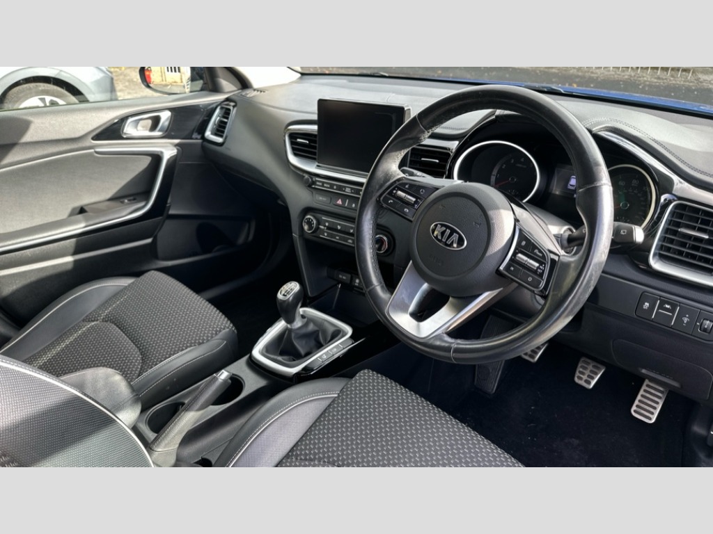 Kia Ceed 1.4T GDi ISG Blue Edition 5dr 3.5" supervision cluster display, 8" touchscreen satellite navigation with European mapping and traffic messaging channel, Apple car play/Android Auto, Bluetooth with Voice Recognition & Music Streaming, Cruise control + speed limiter, Driver attention warning, Emergency stop signalling system, Kia connected services featuring TomTom live, Lane keep assist, Motor driven power steering, Outside temperature gauge, Rear parking sensor, Reversing camera with dynamic guide lines, Service interval indicator, Trip computer, Intelligent Stop and Go, 6 speaker audio system, DAB Radio with MP3, Illuminated USB & aux ports, Steering wheel mounted controls, USB & AUX Ports for Connection of a Media Device, USB Fast Charger in Front Centre Console, All-round Electric Windows with Front Auto Up & Down Function, Automatic headlights, Body colour bumpers, Body colour door mirrors, Body colour exterior door handles, Chrome window surround, Electric adjustable/heated/folding door mirrors with LED Indicators and Kerbside Lights, Front fog lights, Front wiper de-icer, Heated rear window with timer, High beam assist, High gloss black radiator grille, LED Bi-Function Headlights with Cornering Lights, LED daytime running lights, LED High-mounted Brake Light, LED rear lights, Metallic paint, Privacy glass (rear side windows and rear screen), Rear spoiler, Rear wash/wipe, Tinted glass, Wide view drivers door mirror, Windscreen Washer Level Warning, 3 x passenger assist grips, 60/40 split folding rear seat, Air conditioning, All-round height adjustable headrests, Centre console storage box/armrest, Cloth/faux leather upholstery, Cupholders in centre console, Cupholders in rear armrest, Dash illumination dimmer switch, Driver & Front Passenger Sunvisors with Vanity Mirror Illumination & Ticket Holder, Driver's seat height adjuster, Dual Height Luggage Area Floor, Faux leather door trim, Front and rear door storage, Front map light with sunglasses case, Front Passenger Seat Height Adjuster, Front seat and rear pockets, Gear shift indicator, Headlining in Light grey, Illuminated ignition key hole, Interior door lock/unlock function, ISOFIX Child seat top tethers and anchor fixings, Leather handbrake, Leather steering wheel and gearshift, Luggage area light, Luggage area parcel shelf, Luggage hooks, Rear centre armrest, Rear coat hooks, Satin chrome interior door handles, Stainless steel pedals, Tilt/telescopic adjustable steering wheel, ABS with Electronic Brakeforce Distribution (EBD) and Brake Assist System (BAS), All round 3-point seatbelts, Dual front side airbags, Dual horn, Electronic stability control (ESC) and vehicle stability management (VSM), Front passenger airbag deactivation, Height adjustable front seatbelts, Hill start assist control (HAC), Impact sensing auto door unlocking, Rear door child safety locks, Seatbelt reminder warning, Traction control, Twin curtain airbags, Twin front airbags, Tyre pressure monitoring system, Alarm system, Engine Immobiliser & Deadlocks, Locking wheel nuts, Remote central door locking with fold away key, Speed sensitive auto door locking, Black high gloss front console tray garnish & door trim, Satin Chrome Fascia Trim, 17" Alloy wheels, Tyre repair kit