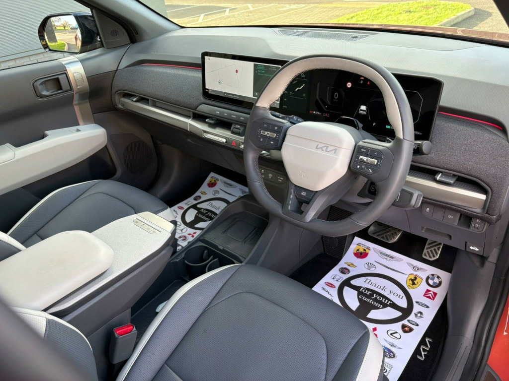 tificial leather - black - grey, 12.3in driver display screen, 12.3in touchscreen navigation, 12v power socket - front, 19in alloy wheels with gt-line styling, 5.3in climate control screen, 6-speaker audio system, 60-40 split folding rear seats, airbags - curtain, airbags - rear, airbags - side, all-round 3-point seatbelts, all-round height adjustable headrests, alloy pedals, anti-lock braking system with emergency stop signalling, artificial leather steering wheel, automatic air conditioning, automatic defog system, automatic flush door handles, automatic headlight control, blind-spot collision avoidance assist, bluetooth, body coloured bumpers, centre console with underneath storage, customisable ambient lighting, customisable automatic door locking, customisable automatic door unlocking, dbc - downhill brake control, digital key, drive mode select - eco-sport-mydrive and snow, driver attention warning - daw, driver and passenger sunvisors with vanity mirror and illumination, epb - electronic parking brake with autohold, esc - electronic stability control, electric drivers seat lumbar support, electric one-touch front windows, electrically adjustable - heated and folding door mirrors with led indicators, forward collision-avoidance assist - fca 2.0 city-pedestrian-cyclist-junction turning and junction crossing, free 7-year kia connect services, front - airbags, front passenger airbag cut off switch, front passenger usb-c charging ports x 2, front and rear door storage, front and rear parking sensors, frunk, gt-line exterior styling pack, gt-line interior styling, gloss black door mirrors, gloss black roof rails, gloss black side sills, gloss black wheel arches, gloss black window surround, glovebox, grey headlining, heated front seats, heated rear window, heated steering wheel, height adjustable front seatbelts, highway driving assist - hda 2.0 with hands-on detection, hill-start assist control - hac, isofix child seat top tethers and anchor fixings rear, intelligent speed limit assist - isla, led daytime running lights, led front cabin and rear lights, led headlights with adaptive driving beam, led headlights with small cube design, led high mounted brake light, led luggage compartment lights, led rear fog light, led rear lights, lane follow assist 2.0 with hands-on detection, lane keep assist - lka, locking wheel nuts, luggage board, luggage compartment - load cover, luggage compartment under floor storage, luggage net hooks, manual adjustable drivers seat, manual child lock, manual passengers seat adjustment, manual steering wheel adjustment, multi-collision braking system - mcb, over-the-air ota - software update, power steering, privacy glass - rear windows and tailgate, rain sensing front wipers, rear centre armrest with cupholders, rear occupant alert, rear passenger usb-c charging ports x 2, rear spoiler, rear wiper, rear-cross traffic collision avoidance assist, regenerative braking paddle shifters with ipedal functionality, reversing camera system, sew - safe exit warning, seatbelt reminder warning, sliding console, smart cruise control 2.0 with stop and go functionality, smart key with motion sensor, speed limiter, start-stop button with smart entry system, tmk - tyre mobility kit, thatcham category 1 security alarm and immobiliser with interior protection, type 2 charging cable, tyre pressure monitoring system - tpms, usb-c port for media device connection, vsm - vehicle stability management, visible vehicle identification number - vin, wireless apple carplay and android auto, wireless mobile phone charger, ecall system