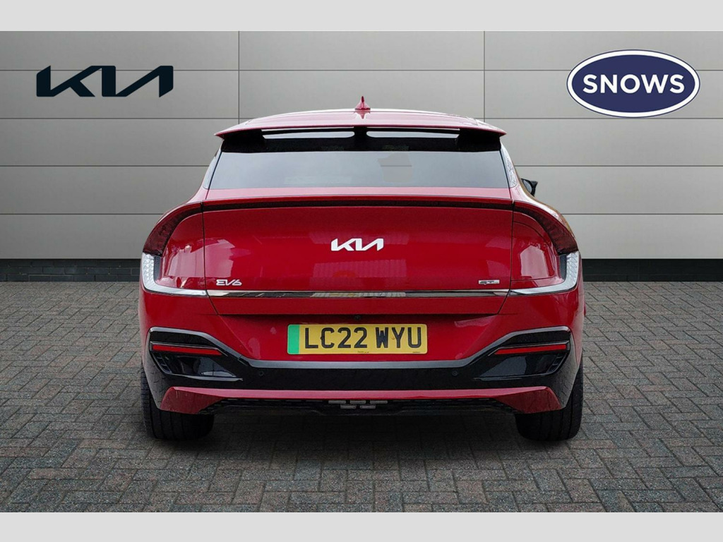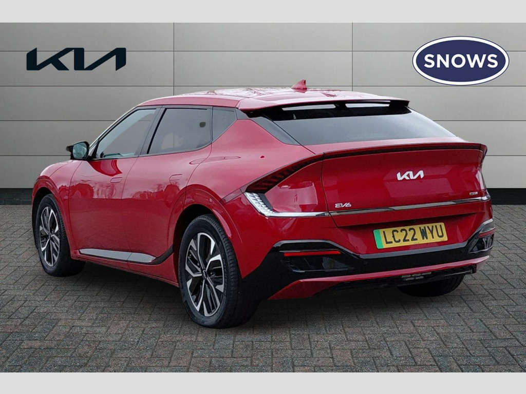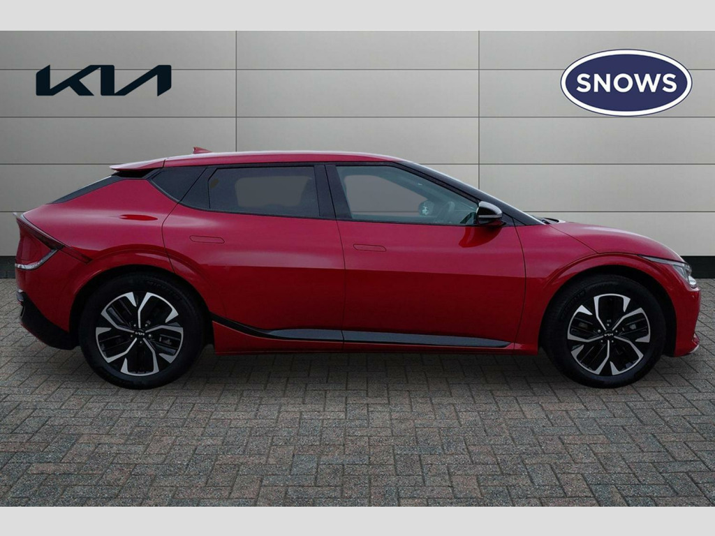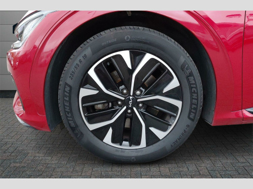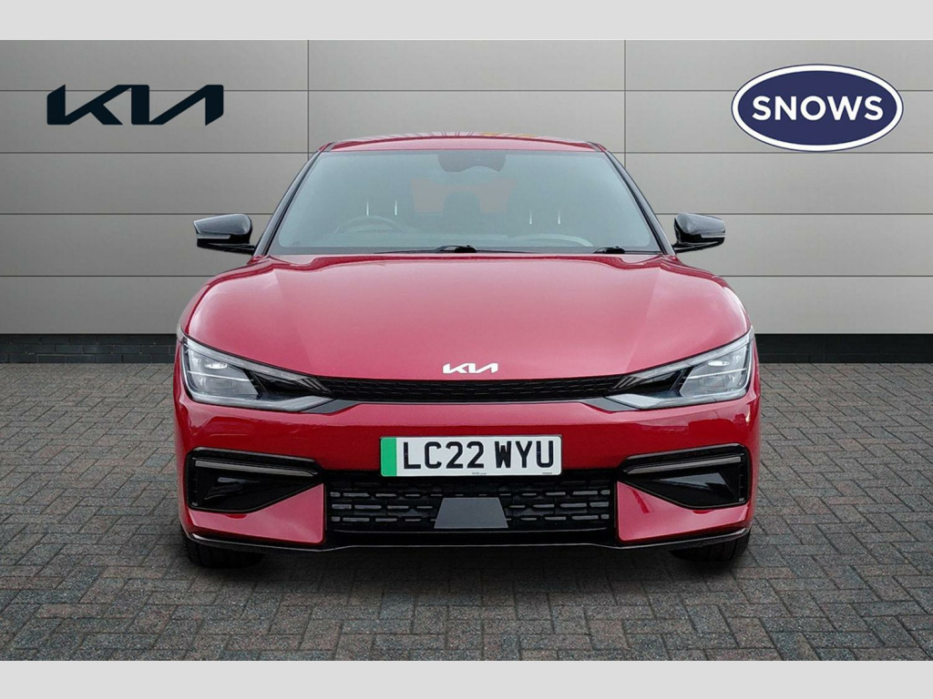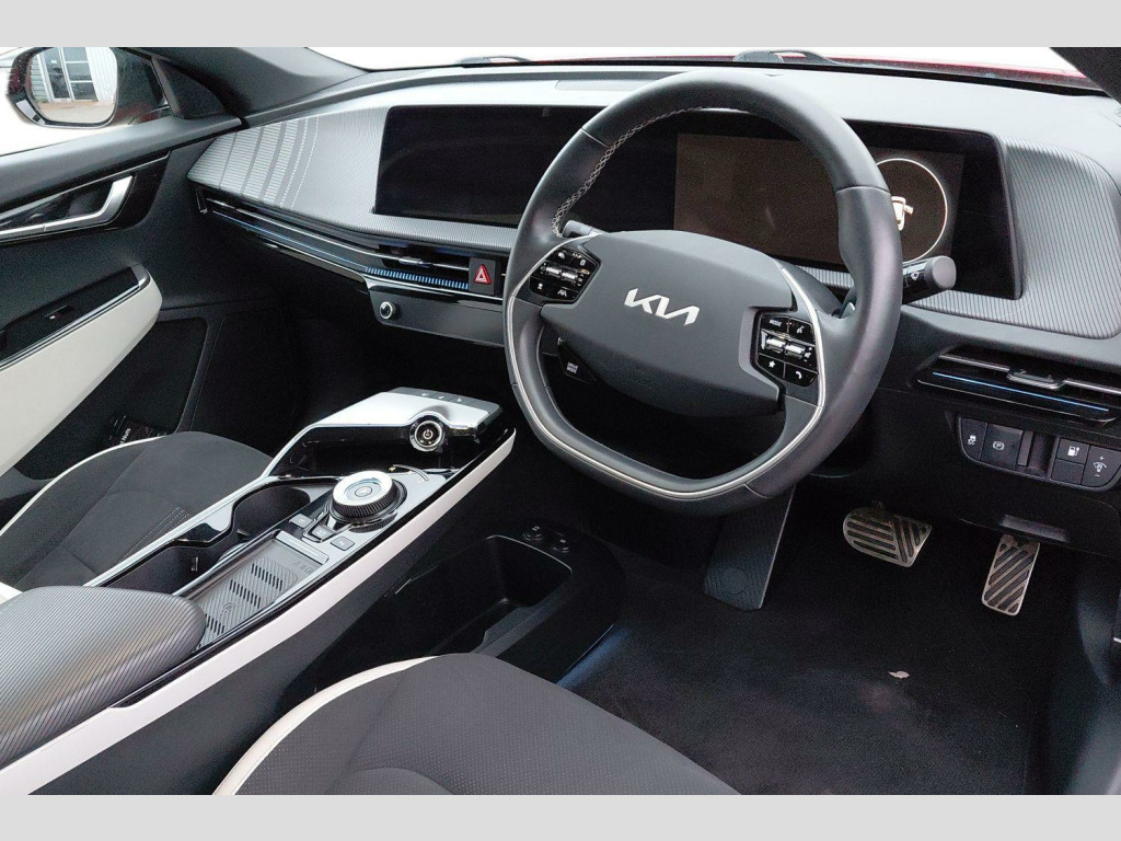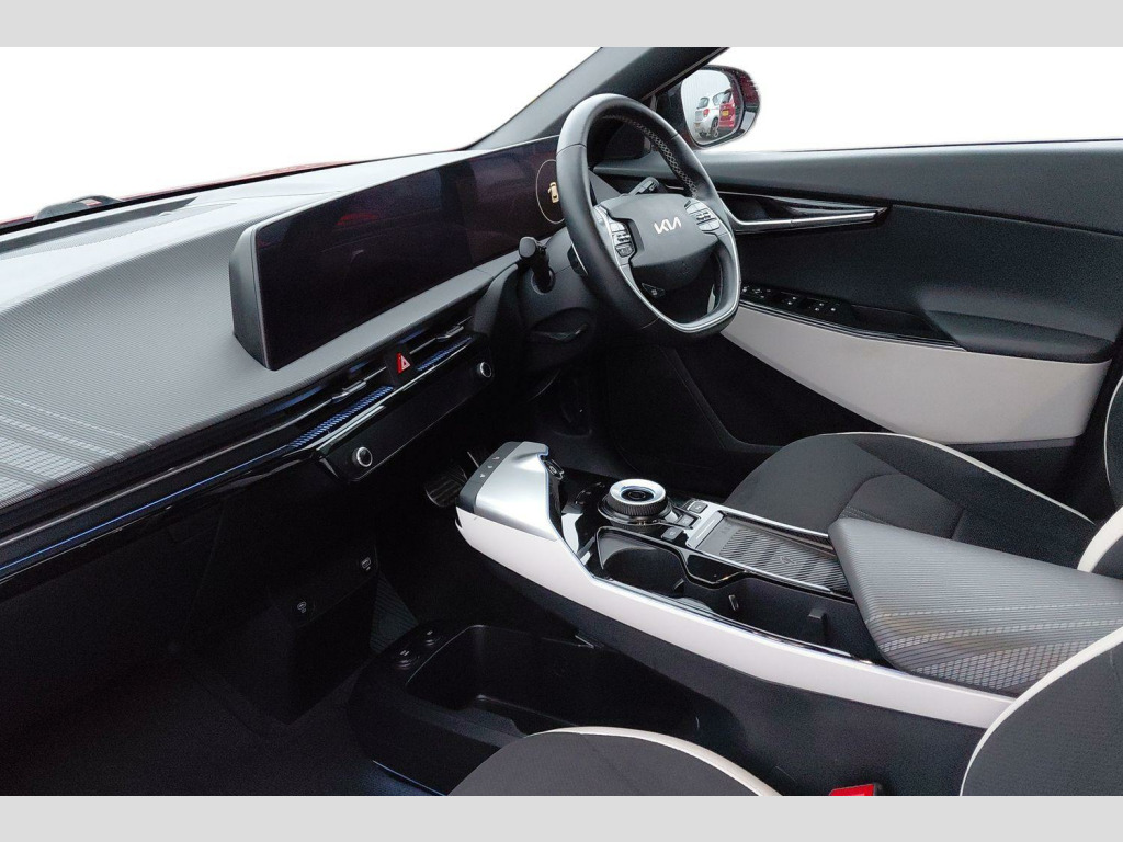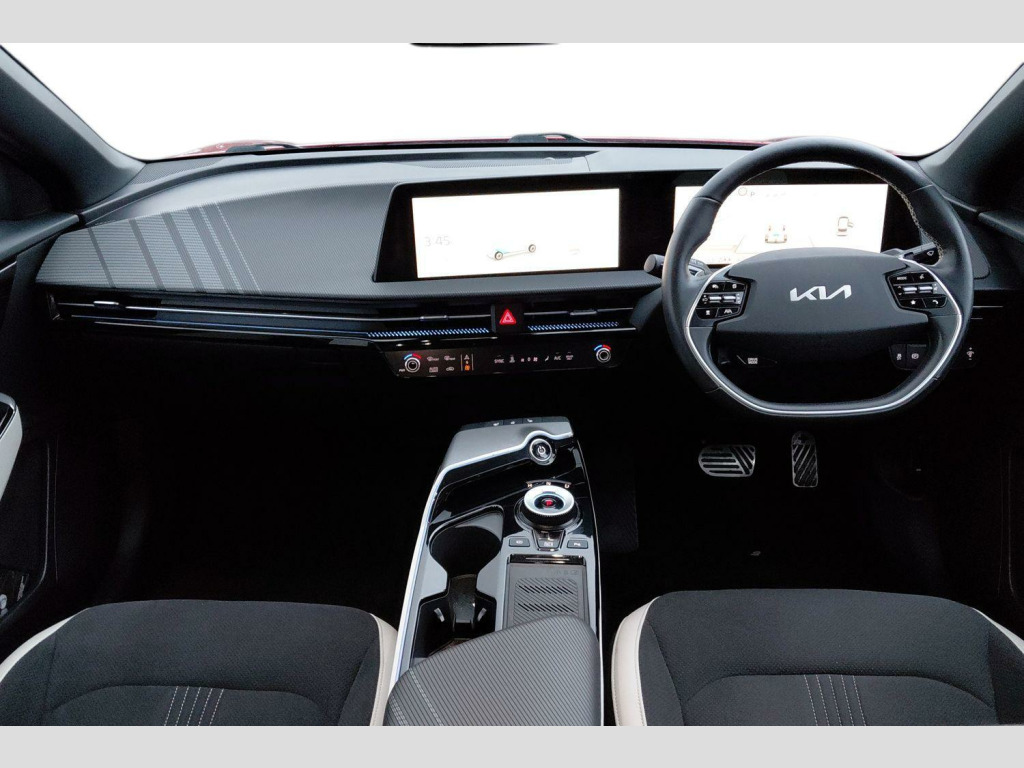 The Kia EV6 GT Line stands out with its impressive performance and practicality. Its acceleration is a notable highlight, achieving 0-62mph in just 5.2 seconds, demonstrating its dynamic capabilities. This electric vehicle also offers a generous boot space, making it a practical choice for everyday use and longer journeys. When it comes to charging, you can achieve a full charge at home using a 7kW charger in approximately 12 hours and 30 minutes. For quicker top ups, the fastest public charging time allows you to charge from empty to 80% in as little as 20 minutes, indicating its advanced charging technology compared to many other electric cars. 19' Alloy wheels, 12.3' Curved driver display screen, 12.3' Curved touchscreen navigation, Kia connect (UVO), Black suede seats with white vegan leather bolsters, Vehicle-2-load (3.5kw power outlet), Wireless mobile phone charger, Dual LED headlights with adaptive driving beam, Driver & front passenger premium relaxion seats, GT-Line exterior styling, Rear privacy glass, Solar glass windshield, Body coloured door garnish, Driver power adjusted memory seat with front passenger power seat with 2-way electric lumbar, Alloy pedals, Deluxe door scuff plates, Front parking sensors, Blind-spot collision avoidance assist (BCA) with rear-cross traffic assist (RCTA) & safe exit assist (SEA), Heated front seats and heated steering wheel, High gloss black door mirrors, Navigation-based smart cruise control with stop & go functionality, Body coloured exterior flush door handles, Engine start/stop button with smart entry system, Ecall, Electrically folding, adjustable & heated door mirrors with integrated LED indicator lights, LED headlights, rear lights and daytime running lights, Rear spoiler, High gloss black beltline, Black side sill moldings, High gloss black door garnish, Heated front seats, Heated steering wheel, Rear parking sensors, Dual automatic air conditioning, All-round electric windows with auto up & down function, Electronic parking brake (EPB) with auto hold function, Rain sensing front wipers, Power adjustable lumbar support - drivers seat, Metal painted interior door handles, Steering wheel mounted controls, Forward collision avoidance assist (FCA) - city/pedestrian/cyclist/junction turning, Highway driving assist (HDA), Drive mode select, Auto-dimming rear-view mirror, 60:40 split remote folding rear seats, Ambient lighting, 4 x Front USB charge port, 3 x Front 12V socket, Tyre mobility kit (TMK), Dual motor with 321bhp