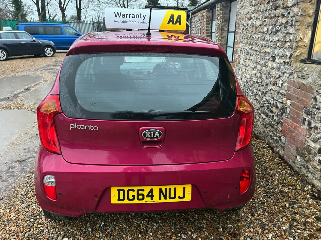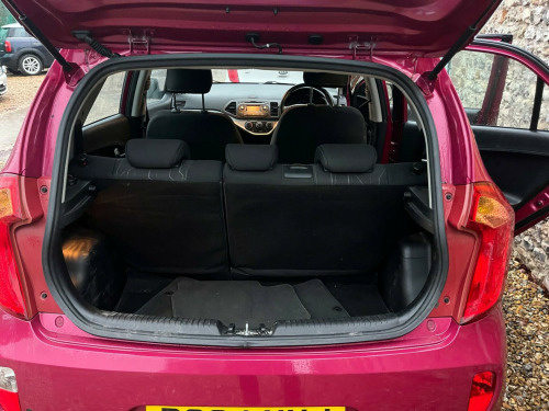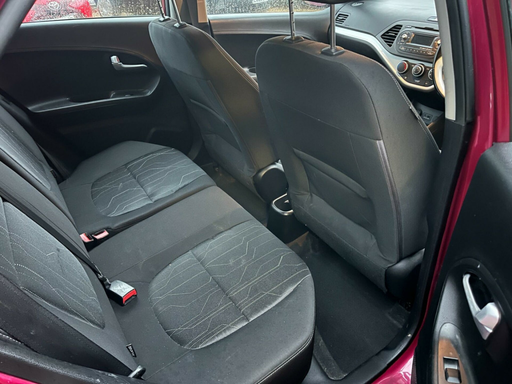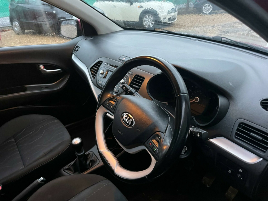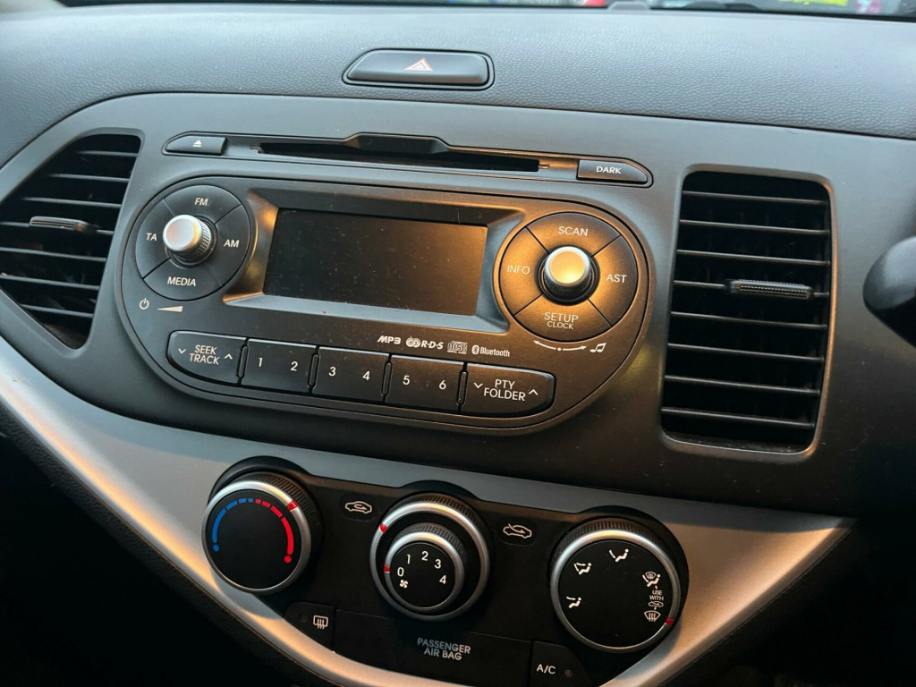 WE ARE DELIGHTED TO OFFER YOU THIS EXCELLENT KIA PICANTO 1.0 2 5 DOOR HATCH, THE CAR DRIVES SUPERBLY HAS A SERVICE HISTORY + WILL BE SUPPLIED FRESHLY SERVICED, THE NEW MOT, HAS 2 X ADVISORY NOTICES WHICH ARE TYRES, THESE ARE BEING CHANGED FOR NEW ONES, THE CAR IS IN GREAT SHAPE INSIDE AND OUT, BUT PLEASE NOTE HAS NOT YET BEEN VALETED, THE CAR IS SUPPLIED WITH 6 MONTHS AA PARTS AND LABOUR WARRANTY AND 12 MONTHS AA BREAKDOWN COVER ( NOT THAT YOU'LL BE USING IT, THIS IS A KIA PICANTO !! )......IN THE MEANTIME PLEASE FEEL FREE TO RESERVE THIS CAR FOR £100, THIS IS FULLY REFUNDABLE IF YOU ARE NOT 100% HAPPY ONCE YOU HAVE SEEN AND DRIVEN IT........PLEASE NOTE THE ROAD TAX IS £20 PER ANNUM, AND THE CAR DOES AN AVERAGE OF 67.3 MPG ! v power socket, 14in alloy wheels, 3 x passenger assist grips, 4-speaker system, 60-40 split folding 2nd row seats, abs - anti lock braking system, adaptive brake lights, air conditioning, airbags - curtain, airbags - driver, airbags - passenger, airbags - side, alarm system, all-round height adjustable headrests, bas - brake assist system, black radiator grille with chrome surround, bluetooth with voice recognition, body coloured bumpers, body coloured door mirrors, centre fascia - metallic, child safety rear door locks, coat hooks - rear, cupholders - centre console with ambient lighting, day and night rear-view mirror, daytime running lights, door handles - chrome, door handles - interior - chrome finish, drivers seat height adjuster, ebd - electronic brakeforce distribution, esc - electronic stability control, electric windows - front and rear, electrically adjustable and heated door mirrors, electrically folding door mirrors, emergency stop signalling - ess, engine immobiliser, front cabin map light, front door map pockets, front fog lights, front passenger airbag cut off switch, front passenger seat undertray, front seatback pockets, glovebox, headlight levelling system, heated rear window, high mounted brake light, hill-start assist control - hac, isofix child seat top tethers and anchor fixings, impact sensing auto door unlocking, inside handle over ride, instant mobility tyre inflation system, integrated indicator lights led in door mirrors, leather trimmed gear shift, leather trimmed steering wheel, locking wheel nuts, luggage area light, luggage compartment - load cover, motor driven power steering - mdps, rds radio with cd and mp3, rear combination lights, remote central locking with folding key, seatbelt reminder warning, side impact protection system, speed sensing auto door locking, speed/impact sensing, steering wheel mounted audio controls, sunvisors with vanity mirrors and ticket holder, tilt steering wheel adjustment, tinted glass, trip computer, tyre repair kit, usb and aux ports, vsm - vehicle stability management, ipod connectivity, cloth - premium black