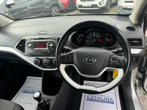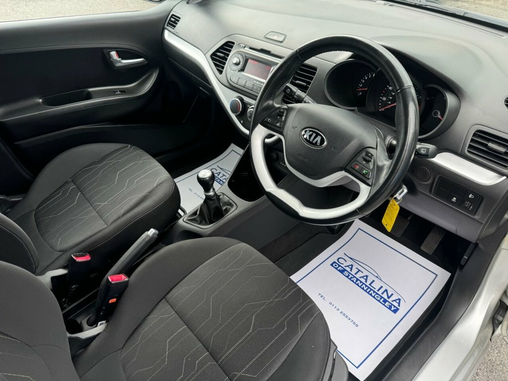 Kia Picanto 1.0 2 – Low Miles | £20 Tax | Excellent History Petrol | Manual | Euro 5 | 68 BHP | 43,500 Miles | MOT Until 04-06-2026 This Kia Picanto 1.0 2 is a smart, efficient city hatchback that combines reliability, economy, and style. With just 43,500 miles from new and two former keepers, it's a well-maintained, low-mileage example that's ideal for both new drivers and those seeking a dependable small car. It boasts an excellent service record, having been serviced at PDI, 7k, 28k, 34k, 37k, 38k, and 41k, ensuring it's been regularly cared for throughout its life. Powered by a 1.0-litre petrol engine, it delivers great fuel efficiency with low running costs — including just £20 annual road tax. The cabin is both comfortable and practical, with dark cloth upholstery and a well-laid-out dashboard offering simplicity and ease of use. The five-door design adds to its everyday practicality, making it perfect for city driving or short commutes. Finished in silver with a dark cloth interior, this Picanto stands out as a clean, economical, and well-maintained car — offering excellent value and the trusted quality expected from Kia. 2014 KIA PICANTO 1.0 2 Hatchback 5dr is offered to you for sale in Pudsey, Leeds, finished in silver this KIA PICANTO 1.0 2 Hatchback 5dr is one of many handpicked used cars that used car dealer, Catalina of Stanningley, Pudsey, Leeds have available for sale. 12V Power Socket, 14in Alloy Wheels, 3 x Passenger Assist Grips, 4-Speaker System, 60-40 Split Folding 2nd Row Seats, ABS - Anti Lock Braking System, Adaptive Brake Lights, Air Conditioning, Airbags - Curtain, Airbags - Driver, Airbags - Passenger, Airbags - Side, Alarm System, All-Round Height Adjustable Headrests, BAS - Brake Assist System, Black Radiator Grille with Chrome Surrou, Bluetooth with Music Streaming, Bluetooth with Voice Recognition, Body Coloured Bumpers, Body Coloured Door Mirrors, Centre Console Cupholders, Centre Fascia - Metallic, Child Safety Rear Door Locks, Coat Hooks - Rear, Day and Night Rear-View Mirror, Daytime Running Lights, Door Handles - Chrome, Door Handles -
