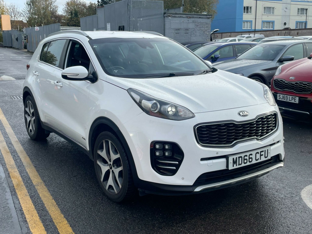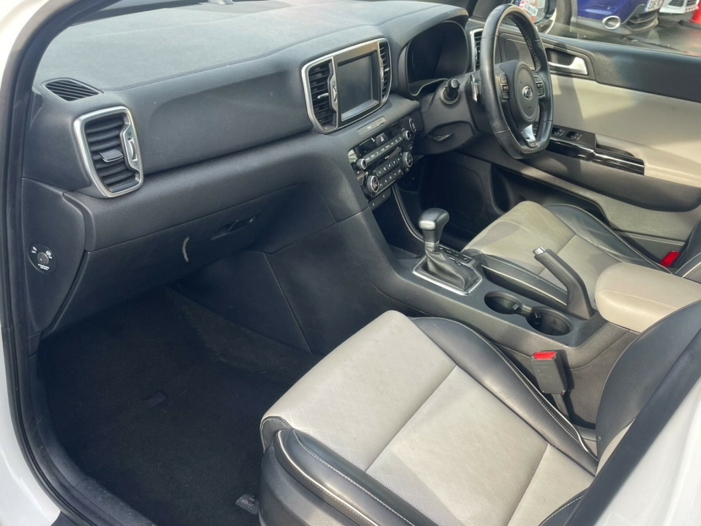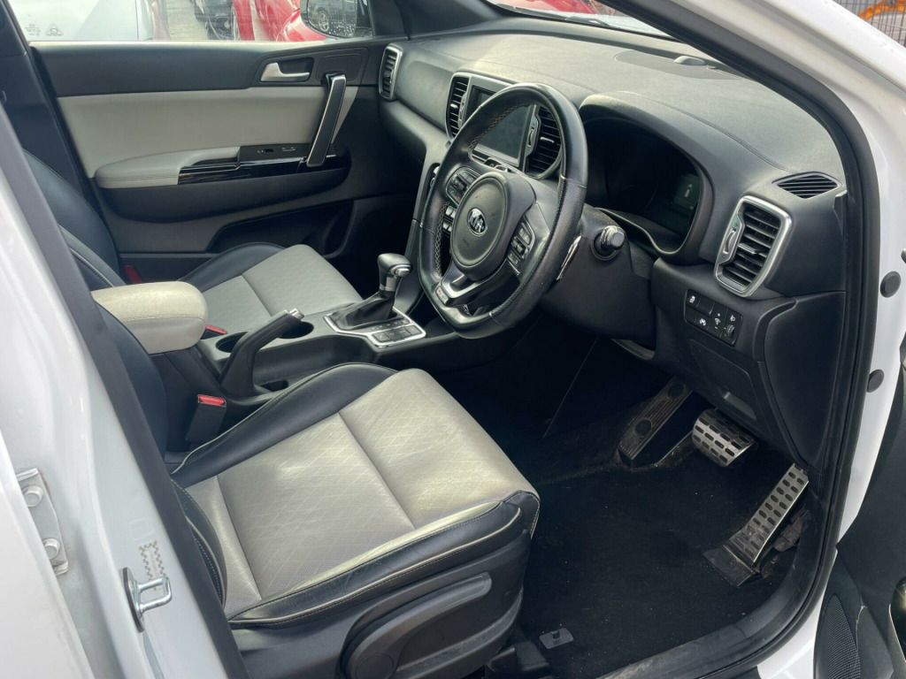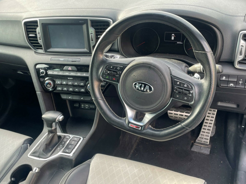 This 2017 Kia Sportage T GDi GT Line stands out with its single owner and comprehensive full service history, offering excellent provenance for its age. This stylish SUV is equipped with a responsive 1.6 litre petrol engine and a capable four wheel drive system, meeting Euro 6 emissions standards. Inside, you'll find comfortable heated front and rear outer seats, perfect for any weather. For convenience and safety, it features Bluetooth connectivity for music streaming, rear parking sensors, and a reversing camera system, making manoeuvring in tight spaces much easier.With only 59,000 miles on the clock, this Sportage represents low mileage for its year, further enhanced by a 12 month MOT provided on purchase and a 3 month warranty for your peace of mind. Its performance is notable, achieving 0 to 60 miles per hour in just 8.8 seconds, demonstrating its brisk acceleration compared to similar vehicles. This model also benefits from a low insurance group, making it an economical choice, and boasts generous boot space, providing ample room for luggage or shopping, setting it apart from many other SUVs in its class. v power socket - front - centre console, 12v power socket - rear - centre console, 19in alloy wheels b-type, 3 x passenger assist grips, 4.2in supervision cluster with lcd tft colour display, 6-speaker system, 60-40 split folding 2nd row seats, 7in touchscreen, abs - anti lock braking system, airbags - driver, airbags - front side, airbags - passenger, airbags - twin curtain, alarm system, all-round 3-point seatbelts, all-round height adjustable headrests, ambient light - front centre console tray illumination, armrest - front centre console storage with silver stitching, armrest - rear centre, auto dimming rear-view mirror, automatic headlight control, automatic windscreen de-fog, aux connectivity, bluetooth with music streaming, body coloured door mirrors, centre cabin light, centre console storage, centre fascia - black high gloss, child safety rear door locks, coat hooks - rear, connected services with tomtom, cornering lights, cruise control, cupholders - rear, dab radio, dbc - downhill brake control, deadlocks, digital clock, door handles - body colour with satin chrome insert, door handles - body coloured and chrome, drive mode select, drivers seat height adjuster, drivers seat power lumbar support, drivers wide view door mirror, dual automatic air conditioning with ioniser, ebd - electronic brakeforce distribution, esc - electronic stability control, electrically folding door mirrors, emergency stop signalling - ess, engine immobiliser, engine start-stop button, european mapping, exhaust - dual, fog lights - led ice-cube, front cabin map light, front door courtesy reflectors, front grille - satin chrome surround, front parking sensors, front passenger airbag cut off switch, front seatback pockets, front wiper de-icer, front and rear electric windows with drivers auto up-down function, gt-line badge - rear, gt-line exterior styling pack, gt-line interior styling pack, glovebox - cooled, glovebox with illumination, grab-type exterior door handles, head rests - front active, headlight levelling system, headlights - follow me home function, headlights - high beam assist - hba, headlining - black, heated front seats, heated outer rear seats, hill-start assist control - hac, isofix child seat top tethers and anchor fixings, impact sensing auto door unlocking, integrated indicator lights led in door mirrors, internal door lock - unlock function, led daytime running lights, lane keep assist system - lkas, leather trimmed door armrests, leather trimmed gear shift, locking wheel nuts, luggage area light, luggage compartment - chrome sill guard, luggage compartment - hooks, luggage compartment - load cover, motor driven power steering - mdps, mouldings - side sill - black with satin chrome insert, mouldings - waistline - satin chrome, pollen filter, privacy glass - rear windows and tailgate, radiator grille - gloss black blade mesh, radio - mp3 compatiblity, rain sensing front wipers, rear air ventilation, rear lights - led, rear parking sensors, rear spoiler, reversing camera system, roll-over sensor, roof rails, satellite navigation, satellite navigation display - colour, satin chrome interior door handles, seatbelt - front with height adjustment, shark fin antenna, skid plates - front and rear - silver, smart key entry system, speed limit information function - slif, speed limiter, speed sensing auto door locking, stainless steel door scuff plates, stainless steel pedals, steering wheel - d-shaped sports leather with perforated inserts and gt-line logo, steering wheel - paddle shift, steering wheel mounted audio controls, storage - front doors, storage - rear doors, sunvisors with vanity mirrors illumination, tsa - trailer stability assist, tailgate - satin chrome insert, temporary spare wheel, tilt and telescopic steering wheel adjustment, tinted glass, traction control, traffic message channel - tmc, trip computer, tyre pressure monitoring system - tpms, usb connection, upholstery with silver stitching, visible vehicle identification number - vin, wheel arch - black with satin chrome insert, ipod connectivity