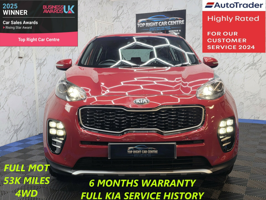 *** NIL DEPOSIT FINANCE AVAILABLE *** ***HPI CLEAR ***6 MONTHS WARRANTY AND BREAKDOWN COVER WITH THIS CAR.(0% interest 9 months payment plan for extended warranty options are available for 1 or 2 years).Low mileage 53k miles only. 4 wheel drive.FULL KIA DEALER SERVICE HISTORY. FULL MOT ON SALE no advisories on previous mots. Recently serviced by Kia Dealer at 51k miles.This stunning Kia Sportage has been sourced directly from its Previous Private Owner. Every now and again, a car comes into stock at Top Right Car Centre, that you cannot help but fall in love with.Top Spec GT Line has massive centre touch screen, SATNAV, full leather interior with front and rear heated seats, apple car play, android auto, reversing camera, all electric windows, auto-folding electric side mirrors, day time running LED lights, privacy glass, parking sensors, cruise control. Clean Car in Red colour. Great comfortable family car. Well maintained body work and interior. Bullet fast response. Checked by our engineers. Professionally detailed. Good reliable runner. Price checked. We've just completed a full pre delivery inspection on the car to give you complete piece of mind. 2 central locking keys. Smooth gear box. Clean alloy wheels. Excellent condition tyres. Spare wheel. Multimedia has Bluetooth DAB RADIO USB AUX mp3. Run with no fault strong reliable engine. Good fuel economy. First to see will buy it this well looked after car. p/x welcome.We do price our cars/van as competitively as possible and because of this we sell cars/vans very quickly. BE QUICK! MISS IT - MISS OUT. With so much variety, quality and highly rated award winner 2024 and 2025, it is no wonder we are super busy all the time.Why Buy From Top Right Car Centre?Thoroughly Inspected Cars. All our vehicles are quality-checked and HPi verified, giving you peace of mind with every purchase.Multi Award-Winning Family Business. As a trusted family-run business, we have earned awards for our customer service and expertise.Hand-Picked, Quality Cars. We carefully select only the finest cars with full service histories, so you can drive away with confidence.Test Driven for Assurance. Each car is personally test-driven by our team, ensuring it meets our high standards. v power sockets - front and rear consoles, 4.2in supervision cluster with lcd tft colour display, 6-speaker system, 7in touchscreen satellite navigation with european mapping with traffic message channel - tmc, apple carplay and android auto, bluetooth with voice recognition and music streaming, dab radio with mp3 compatibility, kia connected services featuring tomtom - traffic - speed cameras - local search and weather updates, shark fin antenna, usb and aux ports for connection of an audio media device - ipod - memory stick, 19in alloy wheels b-type, all-round electric windows with drivers auto up-down function, black side sill and wheel arch body mouldings with satin chrome insert, body coloured door mirrors, body coloured exterior door handles with satin chrome insert, drivers wide view door mirror, electrically folding-adjustable and heated door mirrors with led indicators, exhaust - dual, front grille - satin chrome surround, locking wheel nuts, privacy glass - rear windows and tailgate, radiator grille - gloss black blade mesh, rear spoiler, roof rails, satin chrome beltline mouldings, stainless steel door scuff plates, tailgate - satin chrome insert, temporary spare wheel, tinted glass, 3 x passenger assist grips, 60-40 split folding 2nd row seats, all-round height adjustable headrests, auto dimming rear-view mirror, automatic windscreen de-fog, centre cabin light, centre console storage box, centre fascia - black high gloss, chrome boot sill guard, coat hooks - rear, cupholders in rear armrest, driver and passenger sunvisors with vanity mirror and illumination, drivers seat height adjuster, drivers seat power lumbar support, dual automatic air conditioning, front cabin map light, front door courtesy reflectors, front seatback pockets, front and rear centre armrests, front and rear door storage, glovebox with illumination, head rests - front active, headlining - black, heated front and outer rear seats, leather trimmed door armrests, leather trimmed gear shift, luggage area light, luggage area load cover, luggage net hooks, rain sensing front wipers, rear ventilation duct, satin chrome interior door handles, silver stitching - front centre armrest and upholstery, stainless steel pedals, steering wheel - d-shaped sports leather with perforated inserts and gt-line logo, steering wheel mounted audio controls, tilt and telescopic steering wheel adjustment, advanced anti-theft system including immobiliser and alarm, all-round 3-point seatbelts, anti-lock braking system - abs with electronic brakeforce distribution - ebd, child safety rear door locks, door deadlocks, electronic stability control - esc - with downhill brake control - dbc, emergency stop signalling - ess, engine start-stop button with smart entry system, front passenger airbag cut off switch, front seatbelt height adjusters, hill-start assist control - hac, isofix child seat top tethers and anchor fixings, impact sensing auto door unlocking, interior door lock-unlock function, lane keep assist system - lkas, silver painted front and rear skid plates, speed limit information function - slif, speed sensing auto door locking - dealer-activated feature, tsa - trailer stability assist, twin curtain airbags with roll-over sensor, twin front airbags, twin side airbags - front, visible vehicle identification number - vin, automatic headlight control, headlights - high beam assist - hba, led daytime running lights, led ice-cube front fog lights, led rear tail lights, manual headlight levelling device, welcome and follow-me-home light functionality, cruise control with speed limiter, digital clock, front parking sensors, gear shift indicator, rack mounted motor driven power steering - r-mdps, rear parking sensors, reversing camer
