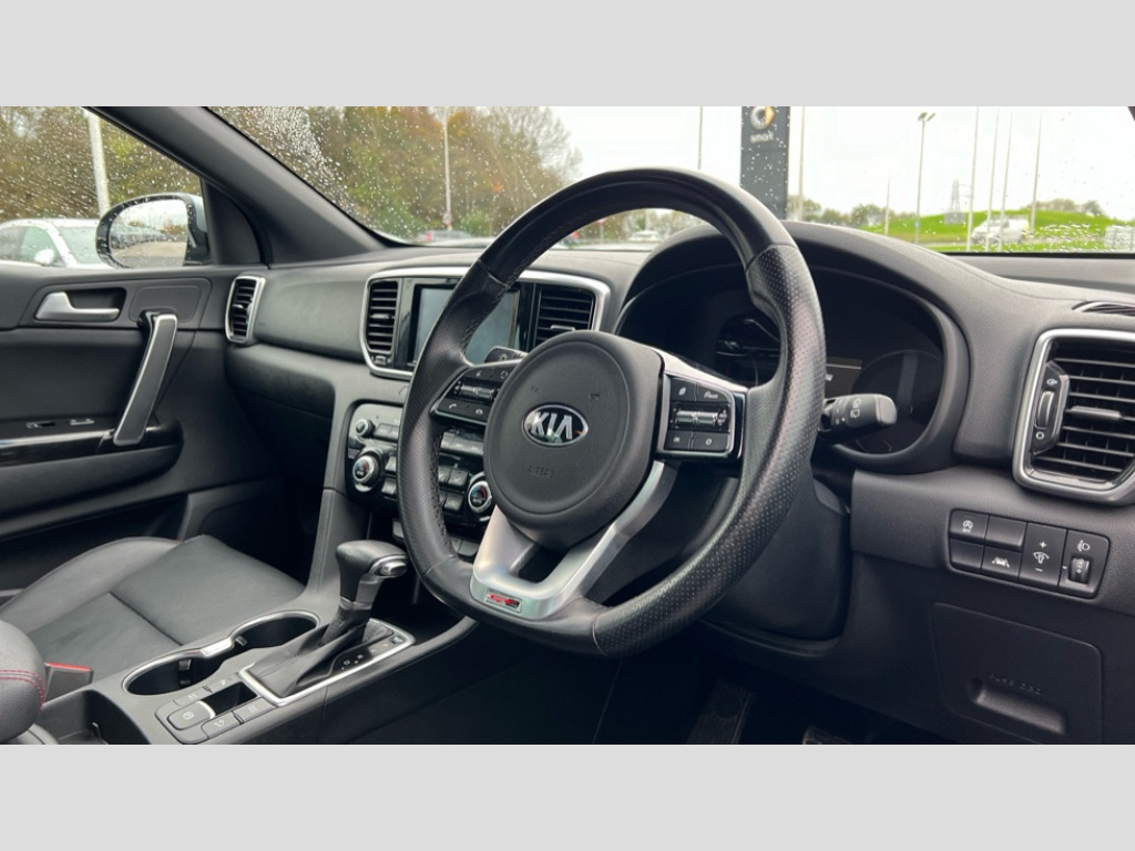 Kia Sportage 1.6 CRDi 48V ISG GT-Line 5dr DCT Auto 4.2" supervision colour cluster display, 7" touchscreen satellite navigation with European mapping and traffic messaging channel, Android auto with voice control, Apple car play with voice control, Bluetooth connectivity with voice control, Cruise control + speed limiter, Drive mode selector, Driver attention warning, Emergency stop signalling system, Front parking sensor, Kia connected services featuring TomTom live, Lane keep assist, Rear parking sensor, Reversing camera, Speed limit information, Speed sensitive power steering, Trip computer, Windscreen washer level indicator, Intelligent Stop and Go, 6 speaker audio system, Bluetooth audio streaming, DAB Radio with MP3, Rear USB port, Steering wheel mounted audio controls, USB/iPod/auxiliary input connections, All round electric windows with drivers auto up/down function, Auto dimming rear view mirror, Automatic headlights, Automatic lighting control, Black wheel arch body mouldings and side sills with dark chrome insert, Body colour door handles with chrome inserts, Body colour door mirrors, Chrome window surround, Dark chrome front bumper insert, Dark chrome grille surround, Dual exhaust pipes, Electrically adjustable/heated/folding door mirrors with LED indicators, Front wiper de-icer, High beam assist, High gloss black blade mesh radiator grille, LED Bi-Function headlights, LED daytime running lights, LED ice cube front fog lights, LED rear lights, Privacy glass (rear side windows and rear screen), Rain sensing front wipers, Rear spoiler, Rear wiper, Roof rails, Shark fin antenna, Silver painted front and rear skid plates, Speed sensitive front wipers, Tinted glass, Trailer stability assist, Welcome and follow-me home light functionality, Wide view drivers door mirror, Windscreen wiper de-icer, 12V power in front and rear centre console, 3 x passenger assist grips, 60/40 split folding rear seat, Air filter, All-round height adjustable headrests, Aluminium door scuff plates, Aluminium pedals, Black headlining, Centre cabin light, Centre console storage box, Chrome boot sill guard, D-Shaped sports leather steering wheel and perforated inserts with GT-Line logo, Door armrest in leather, Driver and front passenger side sunvisors with illuminated vanity mirrors, Driver's seat manual height adjust, Drivers seat power lumbar support, Dual zone automatic air conditioning, Front and rear door storage, Front cabin LED map light with sunglasses case, Front door courtesy reflectors, Front seat and rear pockets, Front/rear centre armrests, Gear shift indicator, Glovebox illumination, Heated front and outer rear seats, Interior door lock/unlock function, ISOFIX Child seat top tethers and anchor fixings, Leather trimmed gearshift, Leather upholstery, Luggage area light, Luggage area load cover, Luggage net with hooks, Paddle shift controls, Rear centre armrest with cupholder, Rear coat hooks, Satin chrome interior door handles, Tilt/telescopic adjustable steering wheel, Ventilation ducts to rear compartment, Active front headrests, All round 3-point seatbelts, Anti-lock braking system with electronic brakeforce distribution, Dual front side airbags, Electronic parking brake, Electronic stability control with downhill brake control, ESP + traction control, Front passenger airbag cut-off switch, Front seatbelt pretensioners + load limiters, Height adjustable front seatbelts, Hill start assist control (HAC), Impact sensing auto door unlocking, Rear door child safety locks, Twin curtain airbags with roll over sensor, Twin front airbags, Tyre pressure monitoring system, Advanced anti-theft system including immobiliser and alarm, Door deadlocks, Engine Start/Stop Button with Smart Entry System, Locking wheel nuts, Speed sensitive auto door locking, Visible vehicle identification number, High gloss black centre fascia, 19" alloy Wheels B-type, Tyre mobility kit