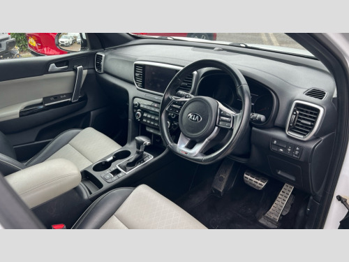 Kia Sportage 1.6 CRDi 48V ISG GT-Line 5dr DCT Auto 4.2" supervision colour cluster display, 8" touchscreen satellite navigation with European mapping and traffic messaging channel, Android auto with voice control, Apple car play with voice control, Cruise control + speed limiter, Drive mode selector, Driver attention warning, Emergency stop signalling system, Front parking sensor, Kia connected services featuring TomTom live, Lane keep assist, Rear parking sensor, Reversing camera, Speed limit information, Speed sensitive power steering, Telematics system with UVO connect services, Trip computer, Windscreen washer level indicator, Intelligent Stop and Go, 6 speaker audio system, Bluetooth audio streaming, DAB Radio with MP3, Rear USB port, Steering wheel mounted audio controls, USB/iPod/auxiliary input connections, All round electric windows with drivers auto up/down function, Auto dimming rear view mirror, Automatic lighting control, Automatic window defogger, Black wheel arch body mouldings and side sills with dark chrome insert, Body colour door handles with chrome inserts, Body colour door mirrors, Chrome window surround, Dark chrome front bumper insert, Dark chrome front grille surround, Dual exhaust pipes, EcoDynamics + Badge, Electrically adjustable/heated/folding door mirrors with LED indicators, Front wiper de-icer, High beam assist, High gloss black blade mesh radiator grille, LED Bi-Function headlights, LED daytime running lights, LED ice cube front fog lights, LED rear lights, Privacy glass - Rear windows and tailgate, Rain sensing front wipers, Rear spoiler, Rear wiper, Roof rails, Shark fin antenna, Silver painted front and rear skid plates, Tinted glass, Trailer stability assist, Welcome and follow-me home light functionality, Wide view drivers door mirror, 12V power in front and rear centre console, 3 x passenger assist grips, 60/40 split folding rear seat, Air filter, All-round height adjustable headrests, Aluminium door scuff plates, Aluminium pedals, Black headlining, Centre cabin light, Centre console storage box, Chrome boot sill guard, D-Shaped sports leather steering wheel and perforated inserts with GT-Line logo, Driver and front passenger side sunvisors with illuminated vanity mirrors, Driver's seat manual height adjust, Drivers seat power lumbar support, Dual zone automatic air conditioning, Front and rear door storage, Front cabin LED map light with sunglasses case, Front door courtesy reflectors, Front seat and rear pockets, Front/rear centre armrests, Gear shift indicator, Glovebox illumination, Heated front and outer rear seats, Interior door lock/unlock function, ISOFIX Child seat top tethers and anchor fixings outer rear seats, Leather trimmed door armrests, Leather trimmed gearshift, Luggage area light, Luggage area load cover, Luggage net with hooks, Paddle shift controls, Rear centre armrest with cupholder, Rear coat hooks, Satin chrome interior door handles, Tilt/telescopic adjustable steering wheel, Two tone leather upholstery, Ventilation ducts to rear compartment, Active front headrests, All round 3-point seatbelts, Anti-lock braking system with electronic brakeforce distribution, Dual front side airbags, Electronic parking brake, Electronic stability control with downhill brake control, Front passenger airbag cut-off switch, Front seatbelt pretensioners + load limiters, Height adjustable front seatbelts, Hill start assist control (HAC), Impact sensing auto door unlocking, Rear door child safety locks, Traction control, Twin curtain airbags with roll over sensor, Twin front airbags, Tyre pressure monitoring system, Advanced anti-theft system including immobiliser and alarm, Door deadlocks, Engine Start/Stop Button with Smart Entry System, Locking wheel nuts, Speed sensitive auto door locking, Visible vehicle identification number, High gloss black centre fascia, 19" alloy Wheels B-type, Tyre mobility kit