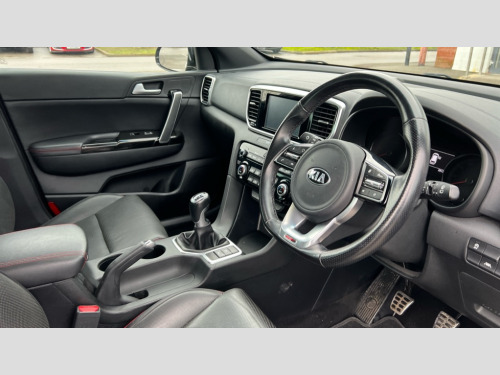 Kia Sportage 1.6 CRDi ISG GT-Line 5dr 4.2" supervision colour cluster display, 7" touchscreen satellite navigation with European mapping and traffic messaging channel, Android auto with voice control, Apple car play with voice control, Bluetooth connectivity with voice control, Cruise control + speed limiter, Digital clock, Driver attention warning, Emergency stop signalling system, Front parking sensor, Kia connected services featuring TomTom live, Lane keep assist, Rear parking sensor, Reversing camera, Speed limit information, Speed sensitive power steering, Trip computer, Windscreen washer level indicator, Intelligent Stop and Go, 6 speaker audio system, Bluetooth audio streaming, DAB Radio with MP3, Steering wheel mounted audio controls, USB/iPod/auxiliary input connections, All round electric windows with drivers auto up/down function, Auto dimming rear view mirror, Automatic defog system, Automatic headlights, Black wheel arch body mouldings and side sills with dark chrome insert, Body colour door handles with chrome inserts, Body colour door mirrors, Chrome window surround, Cornering light, Dark chrome front bumper insert, Dark chrome grille surround, Dual exhaust pipes, Electrically adjustable/heated/folding door mirrors with LED indicators, High beam assist, High gloss black blade mesh radiator grille, LED Bi-Function headlights, LED daytime running lights, LED ice cube front fog lights, LED rear lights, Privacy glass (rear side windows and rear screen), Rain sensing front wipers, Rear spoiler, Rear wiper, Roof rails, Shark fin antenna, Silver painted front and rear skid plates, Speed sensitive front wipers, Tinted glass, Trailer stability assist, Welcome and follow-me home light functionality, Wide view drivers door mirror, Windscreen wiper de-icer, 12V power in front and rear centre console, 3 x passenger assist grips, 60/40 split folding rear seat, Air filter, All-round height adjustable headrests, Black headlining, Centre cabin light, Centre console storage box, Chrome boot sill guard, D-Shaped sports leather steering wheel and perforated inserts with GT-Line logo, Door armrest in leather, Driver and front passenger side sunvisors with illuminated vanity mirrors, Drivers seat power lumbar support, Dual zone automatic air conditioning, Front and rear door storage, Front cabin LED map light with sunglasses case, Front door courtesy reflectors, Front seat and rear pockets, Front/rear centre armrests, Gear shift indicator, Glovebox illumination, Heated front and outer rear seats, Illuminated glovebox, Interior door lock/unlock function, ISOFIX Child seat top tethers and anchor fixings, Leather trimmed gearshift, Leather upholstery, Luggage area light, Luggage area load cover, Luggage net with hooks, Perforated leather sports steering wheel, Rear centre armrest with cupholder, Rear coat hooks, Rear headrests, Satin chrome interior door handles, Stainless steel pedals, Stainless Steel Scuff Plates, Tilt/telescopic adjustable steering wheel, Ventilation ducts to rear compartment, 3x3 point rear seatbelts, Active front headrests, All round 3-point seatbelts, Anti-lock braking system with electronic brakeforce distribution, Dual front side airbags, Electronic stability control with downhill brake control, ESP + traction control, Front passenger airbag cut-off switch, Front seatbelt pretensioners + load limiters, Height adjustable front seatbelts, Hill start assist control (HAC), Impact sensing auto door unlocking, Rear door child safety locks, Twin curtain airbags with roll over sensor, Twin front airbags, Tyre pressure monitoring system, Advanced anti-theft system including immobiliser and alarm, Door deadlocks, Engine Start/Stop Button with Smart Entry System, Locking wheel nuts, Speed sensitive auto door locking, Visible vehicle identification number, High gloss black centre fascia, 19" alloy Wheels B-type, Temporary spare wheel