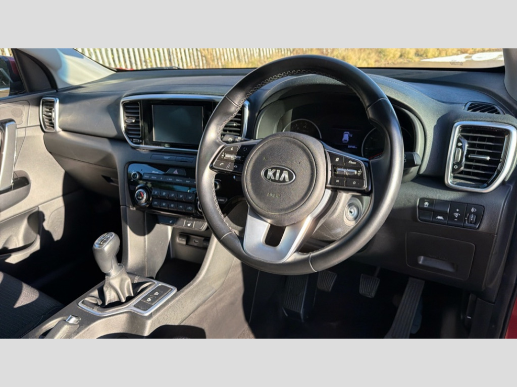Kia Sportage 1.6 GDi ISG 2 5dr 3.5" supervision cluster display, 7" touchscreen satellite navigation with European mapping and traffic messaging channel, Android auto with voice control, Apple car play with voice control, Bluetooth connectivity with voice control, Cruise control + speed limiter, Digital clock, Driver attention warning, Emergency stop signalling system, Kia connected services featuring TomTom live, Lane keep assist, Rear parking sensor, Reversing camera, Speed limit information, Speed sensitive power steering, Trip computer, Windscreen washer level indicator, Intelligent Stop and Go, 6 speaker audio system, Bluetooth audio streaming, DAB Radio with MP3, Steering wheel mounted audio controls, USB/iPod/auxiliary input connections, All round electric windows with drivers auto up/down function, Auto dimming rear view mirror, Automatic defog system, Automatic headlights, Bi-Function halogen headlights, Black wheel arch body mouldings and side sills with chrome insert, Body colour door handles with chrome inserts, Body colour door mirrors, Chrome front bumper insert, Chrome grille surround, Chrome window surround, Cornering light, Electrically adjustable/heated/folding door mirrors with LED indicators, Front fog lights, Headlamp levelling, High beam assist, High gloss black diamond mesh radiator grille, LED daytime running lights, Privacy glass (rear side windows and rear screen), Rain sensing front wipers, Rear spoiler, Rear wiper, Roof rails, Shark fin antenna, Speed sensitive front wipers, Tinted glass, Trailer stability assist, Welcome and follow-me home light functionality, Wide view drivers door mirror, 12V power in front and rear centre console, 3 x passenger assist grips, 60/40 split folding rear seat, Air filter, All-round height adjustable headrests, Centre cabin light, Centre console storage box, Door armrest in leather, Driver and front passenger side sunvisors with illuminated vanity mirrors, Driver's seat manual height adjust, Drivers seat power lumbar support, Dual zone automatic air conditioning, Front and rear door storage, Front cabin LED map light with sunglasses case, Front door courtesy reflectors, Front seat and rear pockets, Front/rear centre armrests, Gear shift indicator, Glovebox illumination, Heated front seats, Ignition key lock illumination, Illuminated glovebox, Interior door lock/unlock function, ISOFIX Child seat top tethers and anchor fixings, Leather steering wheel, Leather trimmed gearshift, Light grey headlining, Luggage area light, Luggage area load cover, Luggage net with hooks, Premium cloth upholstery, Rear centre armrest with cupholder, Rear coat hooks, Rear headrests, Satin chrome interior door handles, Tilt/telescopic adjustable steering wheel, Ventilation ducts to rear compartment, 3x3 point rear seatbelts, Active front headrests, All round 3-point seatbelts, Anti-lock braking system with electronic brakeforce distribution, Dual front side airbags, Electronic stability control with downhill brake control, ESP + traction control, Front passenger airbag cut-off switch, Front seatbelt pretensioners + load limiters, Height adjustable front seatbelts, Hill start assist control (HAC), Impact sensing auto door unlocking, Rear door child safety locks, Twin curtain airbags with roll over sensor, Twin front airbags, Tyre pressure monitoring system, Advanced anti-theft system including immobiliser and alarm, Door deadlocks, Locking wheel nuts, Remote central door locking with fold away key, Speed sensitive auto door locking, Visible vehicle identification number, Metallic finish centre fascia, 17" Alloy wheels, Tyre mobility system