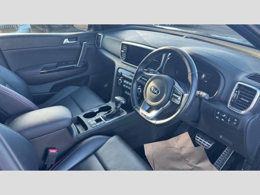 Kia Sportage 1.6T GDi GT-Line S 5dr DCT Auto [AWD] 360 degree around view monitor, 4.2" supervision colour cluster display, 8" touchscreen satellite navigation with European mapping and traffic messaging channel, Android auto with voice control, Apple car play with voice control, Blind spot collision warning, Drive mode selector, Driver attention warning, Emergency stop signalling system, Forward collision avoidance assist, Front parking sensor, Kia connected services featuring TomTom live, Lane keep assist, Rear parking sensor, Reversing camera, Smart cruise control with stop and go functionality, Smart power tailgate, Speed limit information, Speed sensitive power steering, Telematics system with UVO connect services, Trip computer, Windscreen washer level indicator, Wireless Smartphone charger, Intelligent Stop and Go, Bluetooth audio streaming, DAB Radio with MP3, JBL Premium sound system with 8 speakers, external amp, subwoofer and front centre speaker, Rear USB port, Steering wheel mounted audio controls, USB/iPod/auxiliary input connections, All round electric windows with drivers and front passenger auto up/down function, Auto dimming rear view mirror, Automatic lighting control, Automatic window defogger, Black wheel arch body mouldings and side sills with dark chrome insert, Body colour door handles with chrome inserts, Body colour door mirrors, Chrome window surround, Dark chrome front bumper insert, Dark chrome front grille surround, Electric panoramic glass sunroof (Electric one touch with safety function), Electrically adjustable/heated/folding door mirrors with LED indicators, Front wiper de-icer, High beam assist, High gloss black blade mesh radiator grille, LED Bi-Function headlights, LED daytime running lights, LED ice cube front fog lights, LED rear lights, LED third brake light, Privacy glass - Rear windows and tailgate, Rain sensing front wipers, Rear spoiler, Rear wiper, Roof rails, Shark fin antenna, Silver painted front and rear skid plates, Tinted glass, Trailer stability assist, Welcome and follow-me home light functionality, Wide view drivers door mirror, 10 way driver/8 way passenger electrically power adjustable seats, 12V power in front and rear centre console, 3 x passenger assist grips, 60/40 split folding rear seat, Air filter, All-round height adjustable headrests, Aluminium door scuff plates, Aluminium pedals, Black headlining, Centre console storage box, Chrome boot sill guard, D-Shaped sports leather steering wheel and perforated inserts with GT-Line logo, Driver and front passenger side sunvisors with illuminated vanity mirrors, Drivers seat power lumbar support, Dual zone automatic air conditioning, Front and rear door storage, Front cabin LED map light with sunglasses case, Front door courtesy reflectors, Front seat and rear pockets, Front/rear centre armrests, Gear shift indicator, Glovebox illumination, Heated front and outer rear seats, Heated steering wheel, Interior door lock/unlock function, ISOFIX Child seat top tethers and anchor fixings outer rear seats, Leather trimmed door armrests, Leather trimmed gearshift, Leather upholstery with red piping and stitching, Luggage area LED light, Luggage area load cover, Luggage net with hooks, Paddle shift controls, Rear centre armrest with cupholder, Rear coat hooks, Satin chrome interior door handles, Side cabin LED lights, Tilt/telescopic adjustable steering wheel, Ventilated front seats, Ventilation ducts to rear compartment, Active front headrests, All round 3-point seatbelts, Anti-lock braking system with electronic brakeforce distribution, Dual front side airbags, Electronic parking brake, Electronic stability control with downhill brake control, Front passenger airbag cut-off switch, Front seatbelt pretensioners + load limiters, Height adjustable front seatbelts, Hill start assist control (HAC), Impact sensing auto door unlocking, Rear door child safety locks, Traction control, Twin curtain airbags with roll over sensor, Twin front airbags, Tyre pressure monitoring system, Advanced anti-theft system including immobiliser and alarm, Door deadlocks, Engine Start/Stop Button with Smart Entry System, Locking wheel nuts, Speed sensitive auto door locking, Visible vehicle identification number, High gloss black centre fascia, 19" alloy Wheels B-type, Tyre mobility kit