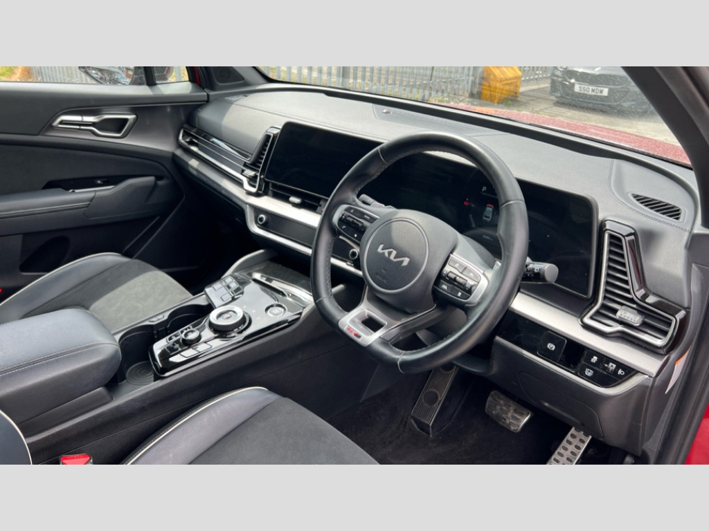 Kia Sportage 1.6T GDi HEV GT-Line 5dr Auto 12.3" Display with navigation, 4.2" supervision colour cluster display, Apple car play/Android Auto with voice control, Drive mode selector, E-call, Forward collision avoidance assist (FCA) - city/pedestrian/cyclist/junction covering, Front and rear parking sensors, Highway Driving Assist (HDA), Intelligent speed limit assist, Kia Connect (UVO), Lane Following Assist (LFA), Lane keep assist, Low washer fluid warning, Rear view monitor, Reversing camera system integrated into centre fascia screen, Smart cruise control with stop and go functionality, Speed sensitive power steering, Trip computer, Windscreen washer level indicator, Intelligent Stop and Go, 6 speaker audio system, Bluetooth audio streaming, DAB Radio with MP3, Rear USB port, Steering wheel mounted audio controls, USB port for connection of a media device, All round electric windows with drivers and front passenger auto up/down function, Automatic headlight control system, Automatic window defogger, Backlite glass heated with timer, Body colour and black bumper with silver accents, Body colour door mirrors, Body colour exterior door handles, Body colour radiator upper garnish and door garnish, Electrically adjustable/heated/folding door mirrors with LED indicators, Front and rear chrome skid plates, Gloss black radiator grille, Gloss black side sill and wheel arch body mouldings, High beam assist, Interior electrochromic mirror, LED daytime running lights, LED front fog lamps, LED headlamps (low and high beam - MFR type), LED High mounted stop light, LED rear combination lamp, Rain sensing wipers with aero blades, Rear fog lamp, Rear privacy glass, Rear side wing doors, Rear spoiler, Rear wiper, Satin finished beltline, Silver roof rack, Trailer stability assist, 12V power socket in front centre fascia and luggage compartment, 2nd row personal lamps, 3 seat bench in 2nd row, 3 x passenger assist grips, 40/20/40 split folding rear seat, All-round height adjustable headrests, Black headlining, Centre console storage box, Cupholders in rear armrest, D-Shaped sports leather steering wheel and perforated inserts with GT-Line logo, Door courtesy lamps, Drink holder at centre armrest, Driver and front passenger side sunvisors with illuminated vanity mirrors, Driver's seat manual height adjust, Drivers seat power lumbar support, Front and rear door storage, Front seat and rear pockets, Front/rear centre armrests, Gear shift indicator, Glovebox illumination, Interior door lock/unlock function, ISOFIX Child seat top tethers and anchor fixings outer rear seats, Luggage area light, Luggage area load cover, Luggage net with hooks, Metal paint interior door handles, Overhead console lamp, Paddle shift controls, Rear coat hooks, Single front passenger seat, Sports pedals, Suede leather upholstery, Three zone climate control, Tilt/telescopic adjustable steering wheel, Ventilation ducts to rear compartment, Active front headrests, All round 3-point seatbelts, Anti-lock braking system (ABS), Dual front side airbags, Dual horn, Electronic parking brake, Electronic stability control with downhill brake control, Front passenger airbag cut-off switch, Front seatbelt pretensioners + load limiters, Height adjustable front seatbelts, Hill start assist control (HAC), Impact sensing auto door unlocking, Multi collision brake assist, Rear door child safety locks, Rear seat alert system, Traction control, Twin curtain airbags, Twin front airbags, Tyre pressure monitoring system, Advanced anti-theft system including immobiliser and alarm, Door deadlocks, Engine Start/Stop Button with Smart Entry System, Locking wheel nuts, Speed sensitive auto door locking, Visible vehicle identification number, Aluminium pattern finish centre fascia and door garnish, 18" Alloy wheels, Tyre mobility kit