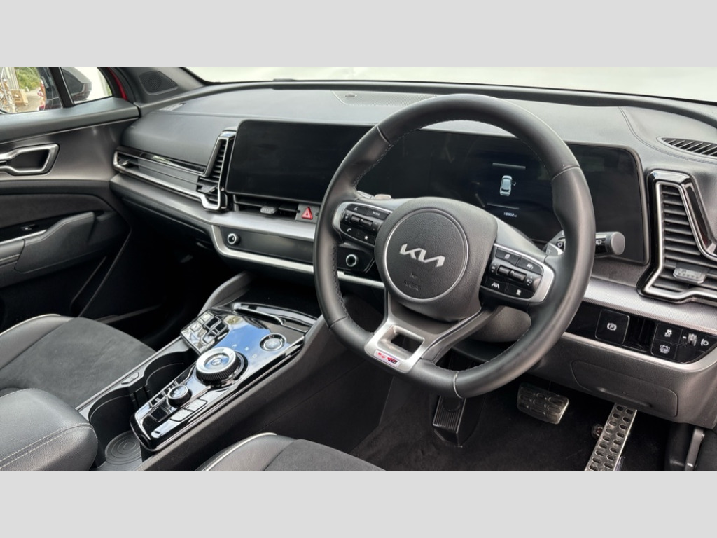 Kia Sportage 1.6T GDi HEV GT-Line 5dr Auto 12.3" Display with navigation, 4.2" supervision colour cluster display, Apple car play/Android Auto with voice control, Drive mode selector, E-call, Forward collision avoidance assist (FCA) - city/pedestrian/cyclist/junction covering, Front and rear parking sensors, Highway Driving Assist (HDA), Intelligent speed limit assist, Kia Connect (UVO), Lane Following Assist (LFA), Lane keep assist, Low washer fluid warning, Rear view monitor, Reversing camera system integrated into centre fascia screen, Smart cruise control with stop and go functionality, Speed sensitive power steering, Trip computer, Windscreen washer level indicator, Intelligent Stop and Go, 6 speaker audio system, Bluetooth audio streaming, DAB Radio with MP3, Rear USB port, Steering wheel mounted audio controls, USB C type charging ports on centre console, USB C type charging ports on side of front seats, USB port for connection of a media device, All round electric windows with drivers and front passenger auto up/down function, Automatic headlight control system, Automatic window defogger, Backlite glass heated with timer, Body colour and black bumper with silver accents, Body colour exterior door handles, Body colour radiator upper garnish and door garnish, Electrically adjustable/heated/folding door mirrors with LED indicators, Front and rear chrome skid plates, Gloss black door mirrors, Gloss black radiator grille, Gloss black side sill and wheel arch body mouldings, Glossy black roof rack, High beam assist, Interior electrochromic mirror, LED daytime running lights, LED front fog lamps, LED headlamps (low and high beam - MFR type), LED High mounted stop light, LED rear combination lamp, Rain sensing wipers with aero blades, Rear fog lamp, Rear privacy glass, Rear side wing doors, Rear spoiler, Rear wiper, Satin finished beltline, Trailer stability assist, 12V power socket in front centre fascia and luggage compartment, 2nd row personal lamps, 3 seat bench in 2nd row, 3 x passenger assist grips, 40/20/40 split folding rear seat, All-round height adjustable headrests, Black headlining, Centre console storage box, Cupholders in rear armrest, D-Shaped sports leather steering wheel and perforated inserts with GT-Line logo, Door courtesy lamps, Drink holder at centre armrest, Driver and front passenger side sunvisors with illuminated vanity mirrors, Driver's seat manual height adjust, Drivers seat power lumbar support, Front and rear door storage, Front seat and rear pockets, Front/rear centre armrests, Gear shift indicator, Glovebox illumination, Interior door lock/unlock function, ISOFIX Child seat top tethers and anchor fixings outer rear seats, Luggage area light, Luggage area load cover, Luggage net with hooks, Metal paint interior door handles, Overhead console lamp, Paddle shift controls, Rear coat hooks, Single front passenger seat, Sports pedals, Suede leather upholstery, Three zone climate control, Tilt/telescopic adjustable steering wheel, Ventilation ducts to rear compartment, Active front headrests, All round 3-point seatbelts, Anti-lock braking system (ABS), Dual front side airbags, Dual horn, Electronic parking brake, Electronic stability control with downhill brake control, Front passenger airbag cut-off switch, Front seatbelt pretensioners + load limiters, Height adjustable front seatbelts, Hill start assist control (HAC), Impact sensing auto door unlocking, Multi collision brake assist, Rear door child safety locks, Rear seat alert system, Traction control, Twin curtain airbags, Twin front airbags, Tyre pressure monitoring system, Advanced anti-theft system including immobiliser and alarm, Door deadlocks, Engine Start/Stop Button with Smart Entry System, Locking wheel nuts, Speed sensitive auto door locking, Visible vehicle identification number, Aluminium pattern finish centre fascia and door garnish, 18" Alloy wheels, Tyre mobility kit