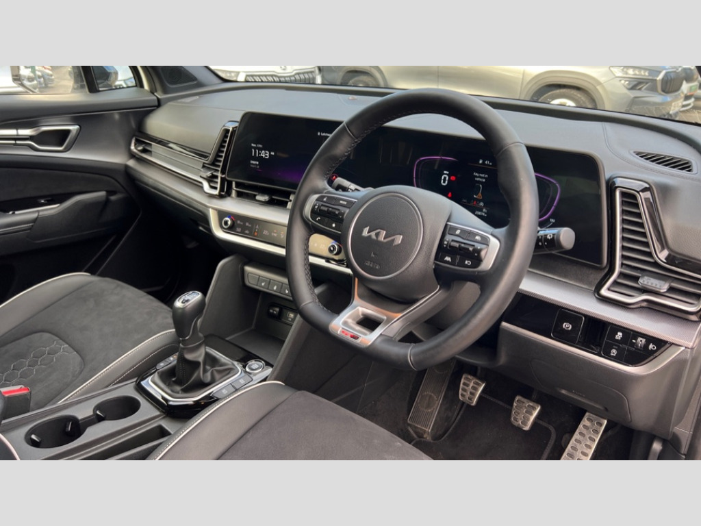 Kia Sportage 1.6T GDi ISG GT-Line 5dr 12.3" Display with navigation, 4.2" supervision colour cluster display, Apple car play/Android Auto with voice control, Cruise control + speed limiter, Drive mode selector, E-call, Forward collision avoidance assist (FCA) - city/pedestrian/cyclist/junction covering, Front and rear parking sensors, Intelligent speed limit assist, Kia Connect (UVO), Lane Following Assist (LFA), Lane keep assist, Low washer fluid warning, Rear view monitor, Reversing camera system integrated into centre fascia screen, Speed sensitive power steering, Trip computer, Windscreen washer level indicator, Intelligent Stop and Go, 6 speaker audio system, Bluetooth audio streaming, DAB Radio with MP3, Rear USB port, Steering wheel mounted audio controls, USB C type charging ports on centre console, USB C type charging ports on side of front seats, USB port for connection of a media device, All round electric windows with drivers and front passenger auto up/down function, Automatic headlight control system, Automatic window defogger, Backlite glass heated with timer, Black bumpers, Body colour and black bumper with silver accents, Body colour exterior door handles, Body colour radiator upper garnish and door garnish, Electrically adjustable/heated/folding door mirrors with LED indicators, Front and rear chrome skid plates, Gloss black door mirrors, Gloss black radiator grille, Gloss black side sill and wheel arch body mouldings, Glossy black roof rack, High beam assist, Interior electrochromic mirror, LED daytime running lights, LED front fog lamps, LED headlamps (low and high beam - MFR type), LED High mounted stop light, LED rear combination lamp, Rain sensing wipers with aero blades, Rear fog lamp, Rear privacy glass, Rear side wing doors, Rear spoiler, Rear wiper, Satin finished beltline, Silver coloured inserts to bumpers, Tinted rear glass, Trailer stability assist, 12V power socket in front centre fascia and luggage compartment, 2nd row personal lamps, 3 seat bench in 2nd row, 3 x passenger assist grips, 40/20/40 split folding rear seat, All-round height adjustable headrests, Black headlining, Centre console storage box, Cupholders in rear armrest, D-Shaped sports leather steering wheel and perforated inserts with GT-Line logo, Door courtesy lamps, Drink holder at centre armrest, Driver and front passenger side sunvisors with illuminated vanity mirrors, Driver's seat manual height adjust, Drivers seat power lumbar support, Front and rear door storage, Front seat and rear pockets, Front/rear centre armrests, Gear shift indicator, Glovebox illumination, Heated front seats, Heated steering wheel, Interior door lock/unlock function, ISOFIX Child seat top tethers and anchor fixings outer rear seats, Luggage area light, Luggage area load cover, Luggage net with hooks, Metal paint interior door handles, Overhead console lamp, Rear cabin light, Rear coat hooks, Single front passenger seat, Sports pedals, Suede leather upholstery, Three zone climate control, Tilt/telescopic adjustable steering wheel, Ventilation ducts to rear compartment, Active front headrests, All round 3-point seatbelts, Anti-lock braking system (ABS), Dual front side airbags, Dual horn, Electronic parking brake, Electronic stability control with downhill brake control, Front passenger airbag cut-off switch, Front seatbelt pretensioners + load limiters, Height adjustable front seatbelts, Hill start assist control (HAC), Impact sensing auto door unlocking, Multi collision brake assist, Rear door child safety locks, Rear seat alert system, Traction control, Twin curtain airbags, Twin front airbags, Tyre pressure monitoring system, Advanced anti-theft system including immobiliser and alarm, Door deadlocks, Engine Start/Stop Button with Smart Entry System, Locking wheel nuts, Speed sensitive auto door locking, Visible vehicle identification number, Aluminium pattern finish centre fascia and door garnish, 19" GT-Line alloy wheels, Tyre mobility kit