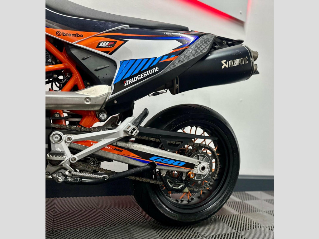 The 2019 KTM 690 SMC R is a high-performance, single-cylinder supermoto featuring a potent LC4 engine, a fully adjustable WP APEX suspension, and an advanced electronics package including riding modes, cornering ABS, traction control, and a quickshifter. Its aggressive styling, improved ergonomics, and lightweight chassis make it a pure, extreme and high performance machine designed for skilled riders who want to express their tarmac-sliding talent on both mountain roads and the track. Epic example do not sleep on this one. Extremely low mileage, plenty of service receipts,2 keys,akrapovic, QS,tail tidy and lever guards.