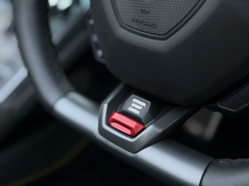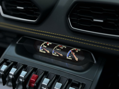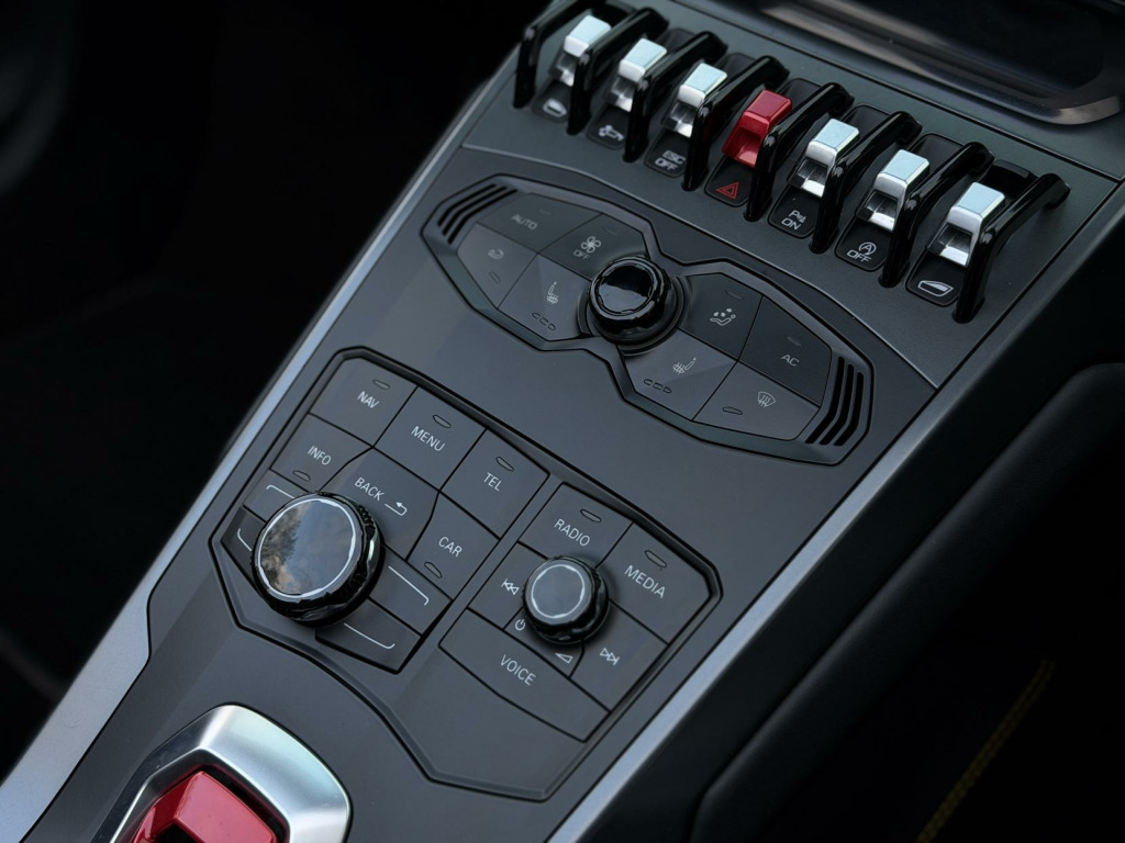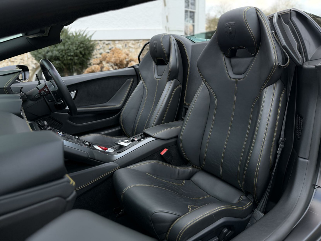 Standard specification includes the full 12.3 inch TFT instrument cluster with adaptive display, Lamborghini Infotainment System II, dual zone climate control, fully electric heated seats, multifunction steering wheel, full LED lighting, launch control with STRADA, SPORT and CORSA modes, electric power assisted steering with variable ratio, soft top in black fabric and a comprehensive suite of safety systems including ESC, multiple airbags and tyre pressure monitoring.