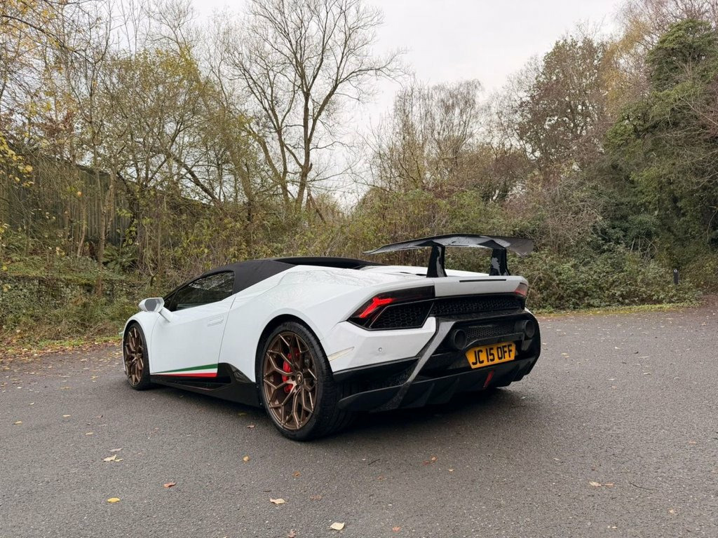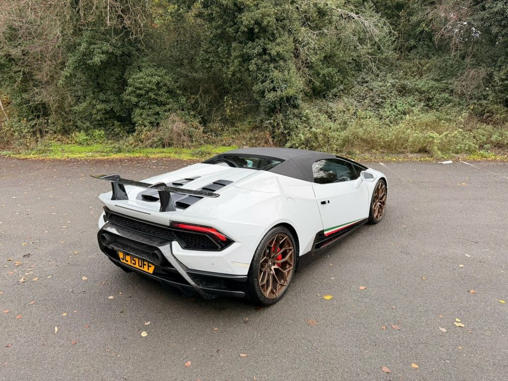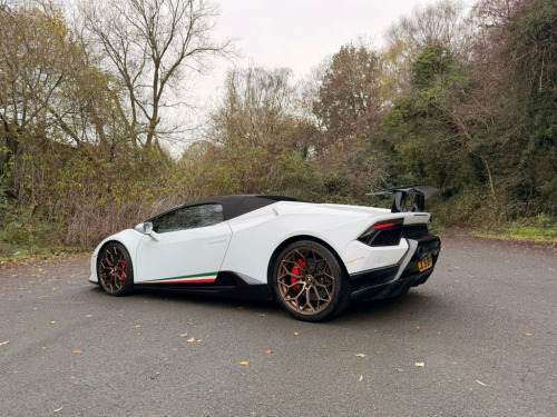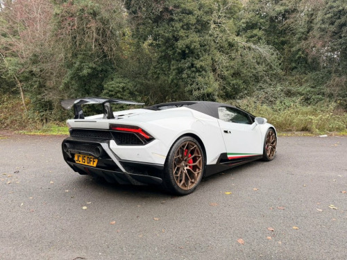 LAMBORGHINI HURACÁN LP610-4 SPYDER 5.2 V10 • LDF • 4WD • FULL OEM PERFORMANTE KIT Step into pure Italian theatre with this stunning Lamborghini Huracán LP610-4 Spyder, finished in Bianco Monocerus White and enhanced with a full OEM Performante body kit — giving the car the aggressive stance and presence of the flagship model while keeping it fully factory-correct. Sitting beautifully on factory gold lightweight alloys, this example has clearly been cherished and presents in exceptional overall condition. Key Details 2016 / 66 Reg 28,000 Miles 5.2 V10 Naturally Aspirated Lamborghini Doppia Frizione (LDF) Dual-Clutch Gearbox LP610-4 – Permanent 4WD Spyder – Electric Folding Roof Full OEM Performante Exterior Kit Bianco White with Gold Wheels Euro 6 (s/s) 2 Doors Specification Highlights Sports exhaust system with incredible V10 soundtrack Carbon fibre interior trim pack Front-end lift system MagneRide adaptive damping Sat Nav / Bluetooth / Infotainment Reversing camera & parking sensors Drive mode selector – Strada / Sport / Corsa LED headlights & signature DRLs Alcantara & leather interior with contrast stitching Heated sports seats Keyless start Full complement of safety & driver-assist systems Condition Presented in excellent condition inside and out. The Performante aero kit is 100% OEM, not aftermarket, giving the car a rare, factory-style finish with serious road presence. Mechanically superb, drives tig