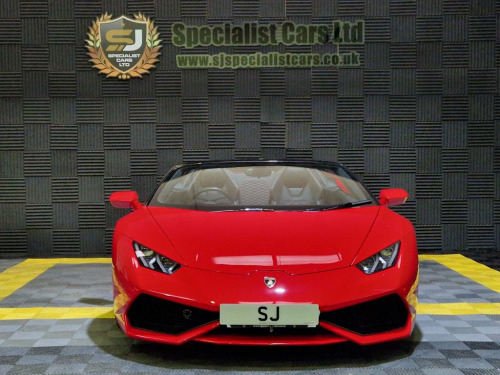 2017 67 Lamborghini Huracan Spyder LP 610-4 finished in special order Ferrari red Rosso Mars with just 18k miles. Fantastic spec which includes: Rosso Mars paintwork, Front lift, branding pack, rear camera, front and rear sensors, sports exhaust, style package, DAB radio, Sat Nav, heated seats, red callipers, carbon ceramic brakes, plus all standard features. The car was serviced by the Lamborghini main dealer in May and the vehicle comes with both keys plus relevant book packs/manuals. All usual dealer facilities are available, part exchange, finance and warranties. 20in Alloy Wheels - Rims Giano Silver, 3-points Seat Belts with Pre-tensioner-F, 4 Speakers - 2 Woofers and 2 Tweeters, Airbag - Front Dual Stage Driver, Airbag - Front Dual Stage Passenger, Alcantara Multilayer on Upper Dashboard , Autolock, Automatic Dual-Zone Air Conditioning Sys, Carbon Ceramic Brakes with Silver Painte, Collapsible Steering Column, Colour TFT Clima Display Showing Main In, Dark Tinted Glass in Windows and Windscr, Deformation Zones at Front and Rear with, Door Handles - Flush-mounted, Door Storage Compartments, Double Wishbone Independent Suspension w, Driving Dynamics Mode Selector on the St, EPS - Electric Power-Assisted Steering w, ESC - Electronic Stability Control