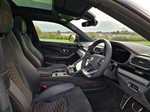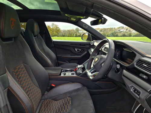 This 2021 Lamborghini Urus V8 BiTurbo Graphite Capsule boasts just 1 Previous Owner and a full dealership service history, offering peace of mind for its next owner. This exceptional example of the Graphite Capsule trim features a powerful 4.0L petrol engine paired with a four wheel drive drivetrain, ensuring dynamic performance and control. It meets Euro 6 emission standards. Inside, you will find a luxurious Bang and Olufsen Advanced 3D Audio System, heated rear seats, and a Multi Function Heated Steering Wheel with suede inserts for added comfort and style. The Urus is designed for exhilarating driving, highlighted by its impressive 0-62mph acceleration in just 3.6 seconds. This performance capability sets it apart from many other vehicles in its class. Furthermore, the Parking Assistant Package with a 360 degree top view camera provides enhanced visibility and ease when manoeuvring, demonstrating a commitment to both performance and practicality. 23in Tagine Alloy Wheels Finished in Shi, Acoustic and Insulated Glass, Alcantara with Q-Citura Stitching - Nero, Ambient Lighting Package, Arancio Borelais Colour Accent, Bang and Olufsen Advanced 3D Audio Syste, Brushed Exhaust Tailpipes - Ad Personam, Carbon Ceramic Brakes with Orange Painte, Electric Panoramam Roof, Graphite Capsule, Grigo Keres, Head Up Display, Multi Function Heated Steering Wheel wit, Offroad Modes, Optional Stitching, Parking Assistant Package with Top View , Rear Seat Entertainment, Rear Seats Heated, Side Steps, Soft Close, Soft Close Doors, Vehicle Tracking System VTS