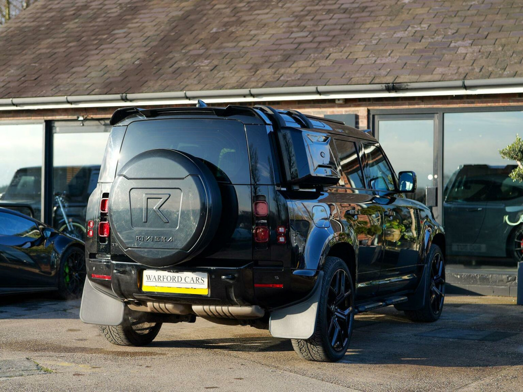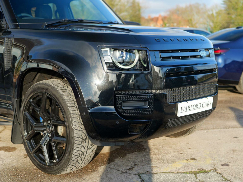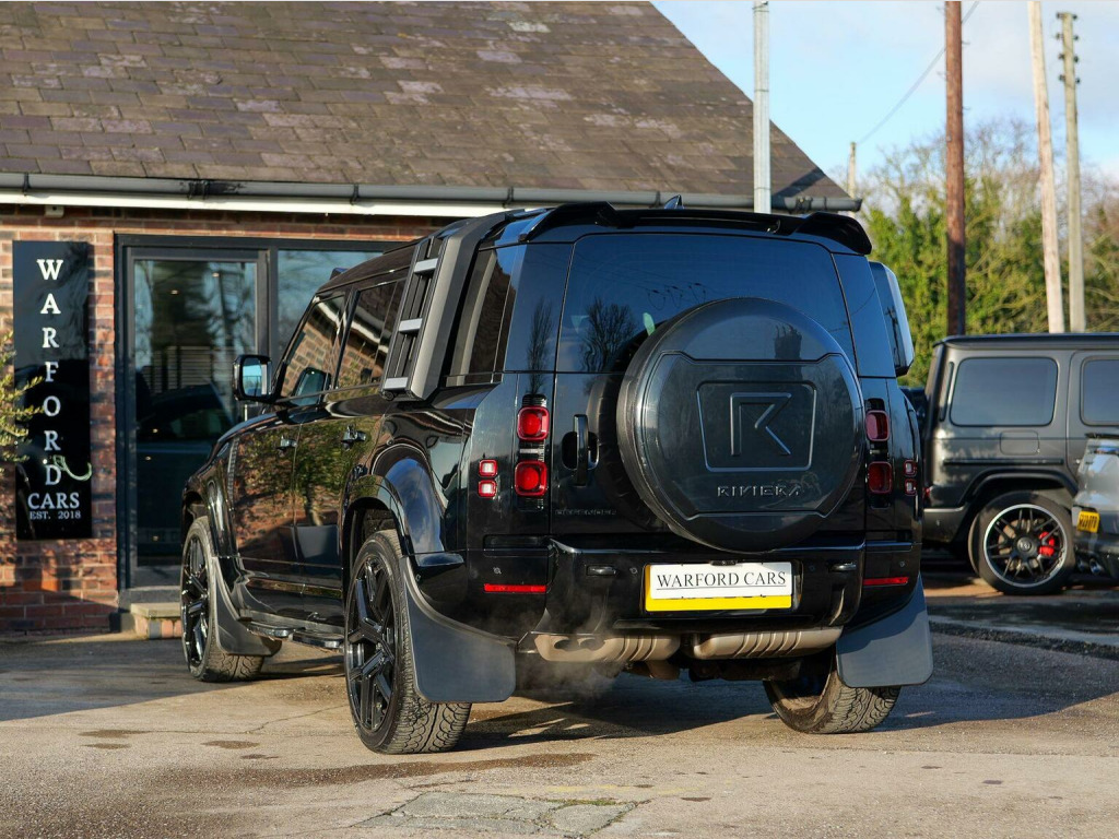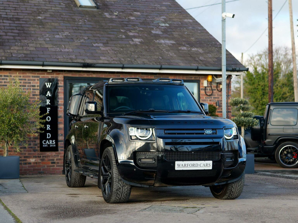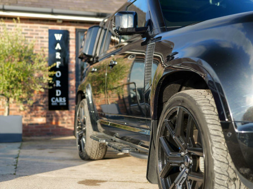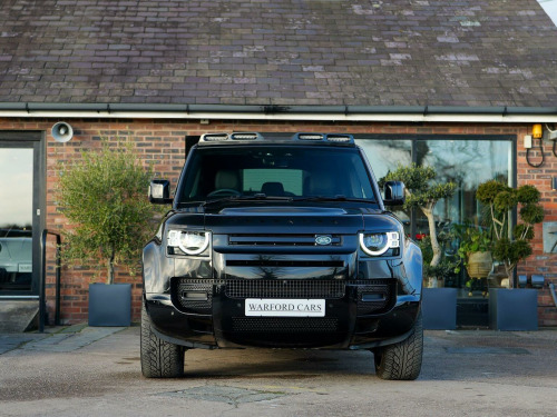 Warford Cars are proud to present stunning Land Rover Defender 110 D250 X-Dynamic SE in Santorini Black with Ultimate Black Interior. The car is optioned Extended Black Exterior Pack, Body Coloured Roof and 22-Inch Full Size Spare Wheel. Key features on the car include Wire Apple CarPlay / Android Auto, Opening Sunroof with Powered Blind, Heated Electric Memory Front Seats, Meridian Sound System, Front & Rear Sensors with 360 Camera, Fixed Side Steps, Dual Zone Climate Control, Cruise Control, Heated Front & Rear Windscreens, Privacy Glass and Power Folding Wing Mirrors. The car also features additional exterior extras from Riviera including 23-Inch Black Wheels, Carbon Effect Roof Pod Light Bar, Side Box and Lip Spoiler. The car has had its first service at Land Rover Knutsford on 05/02/2026 at 22395 miles and comes with Manufacturers Warranty until March 2027. Viewings Strictly by Appointment Only. Competitive Finance Options Available. Extended Warranty Available. Professional GTechniq Accredited Detailing Available. Call directly to arrange a viewing on 07537 165874