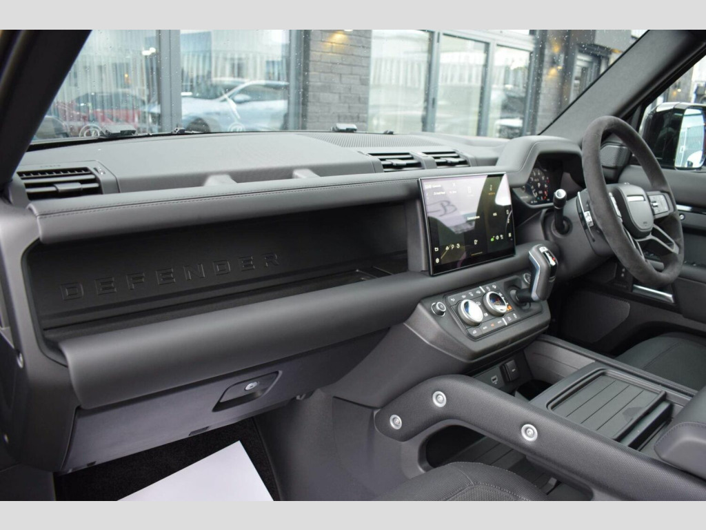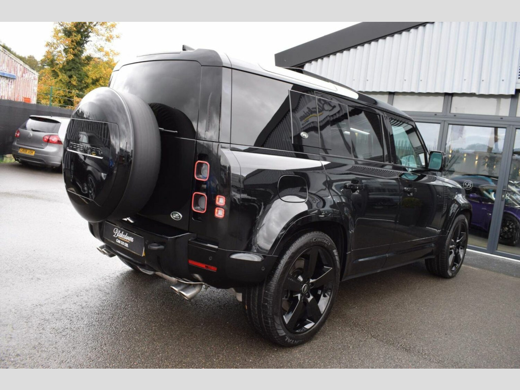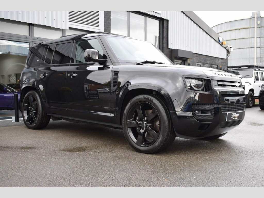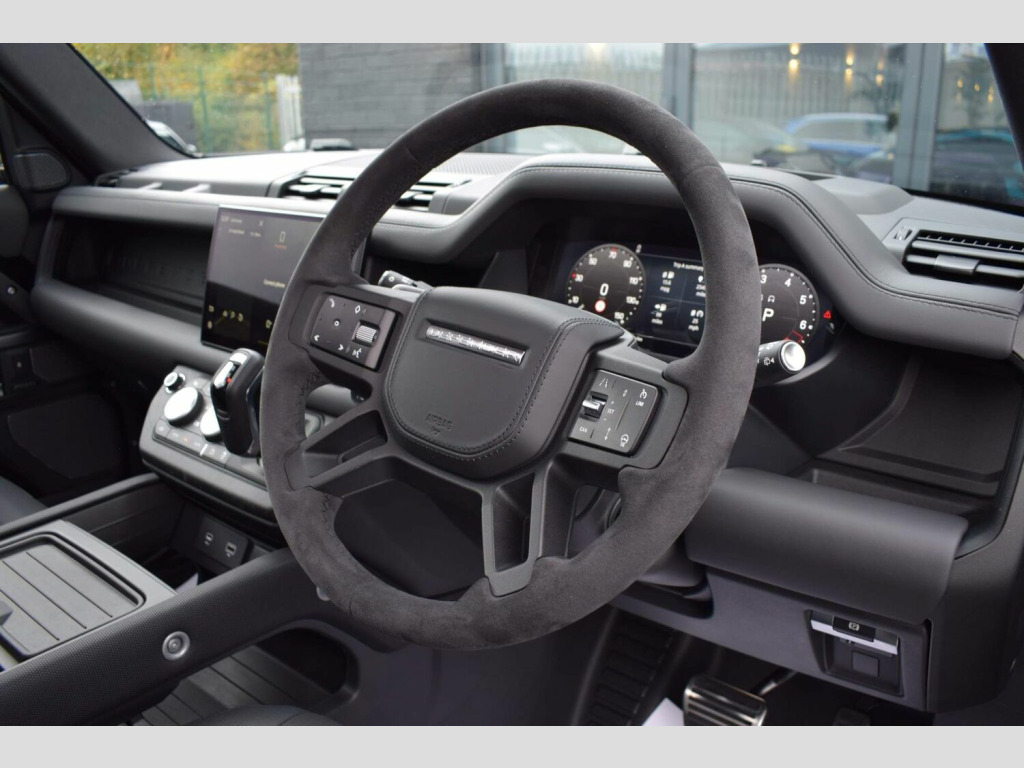 June 2022 22 Land Rover Defender 110 5.0 P525 V8 Auto 4WD finished in Santorini Black Metallic with Ebony Dinamica® suedecloth and Robustec interior. A mere 2400 miles covered by just one owner and supplied with Land Rover warranty in place until June 2025. As you would expect, this 110 is presented in flawless showroom condition inside and out. Supplied with all correct documentation, handbooks, accessories etc and this car has been subjected to our usual strict pre delivery inspection and preparation process ensuring all cosmetic and mechanical elements are in good order. This example benefits from a dog guard and optional painted spare wheel cover on top of the already impressive 5.0 V8 specification which includes: 22 Style 5098 Gloss Black Alloys, 22 full size spare wheel, Sliding panoramic roof, Privacy glass, Matrix LED headlights with signature DRL, 14-way heated and cooled electric memory front seats with 4-way manual headrests, 40:20:40 folding and heated rear seats with centre armrest, Front centre console refrigerator compartment, Ebony Morzine headlining, Heated steering wheel, Electrically adjustable steering column, Meridian™ Surround Sound System, Interactive Driver Display, 11.4 Touchscreen and more.