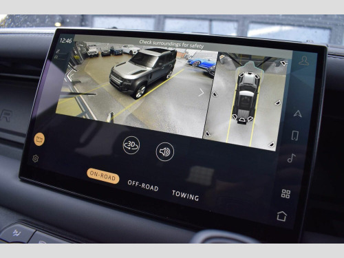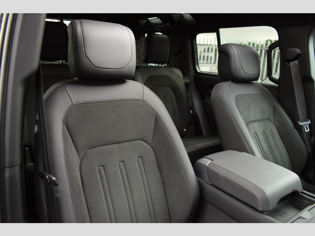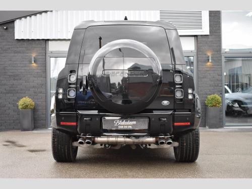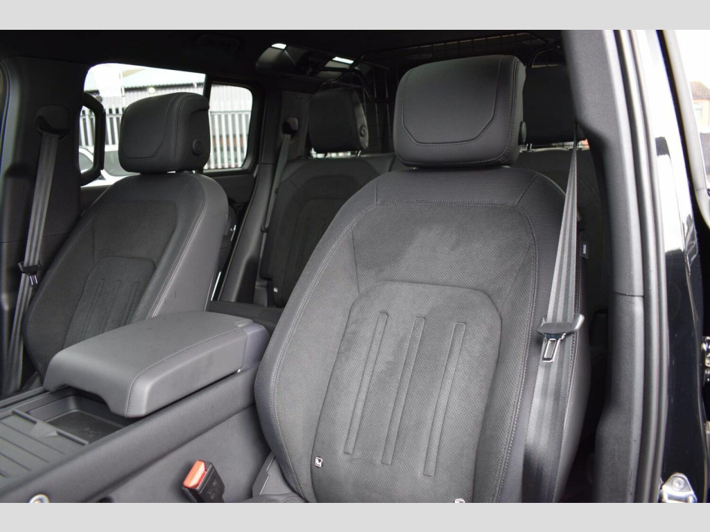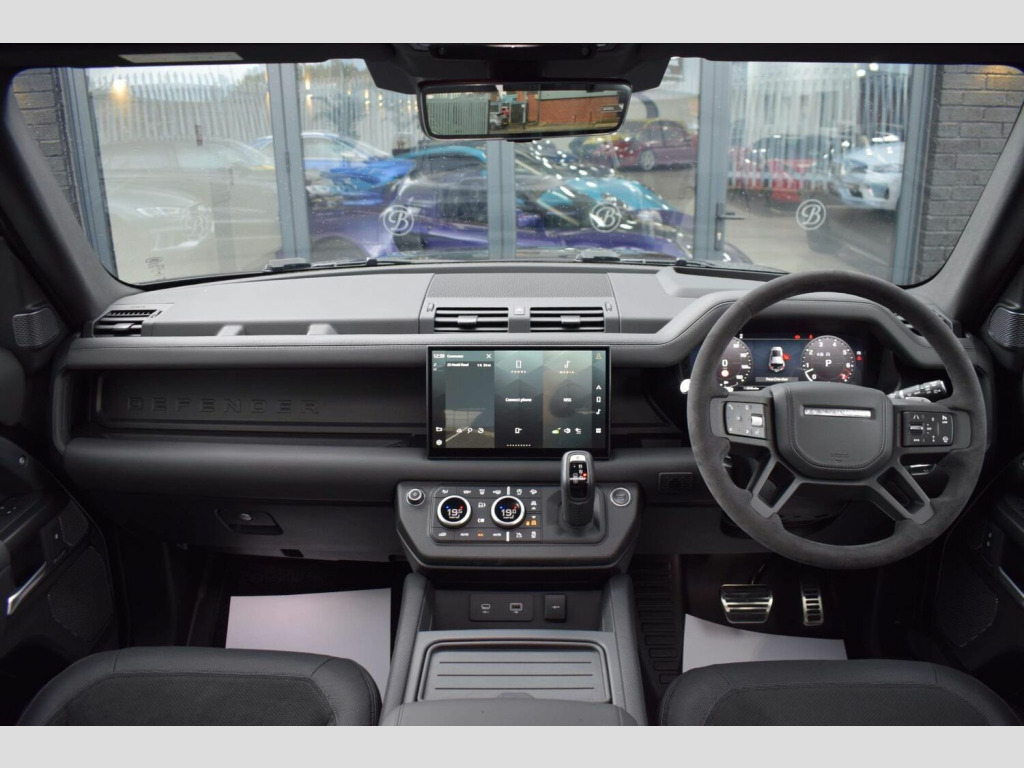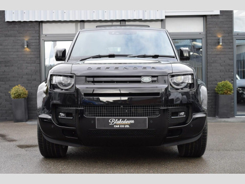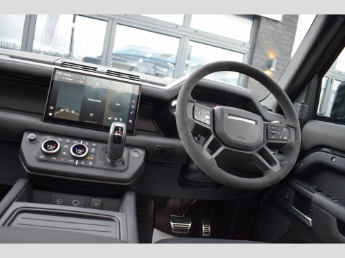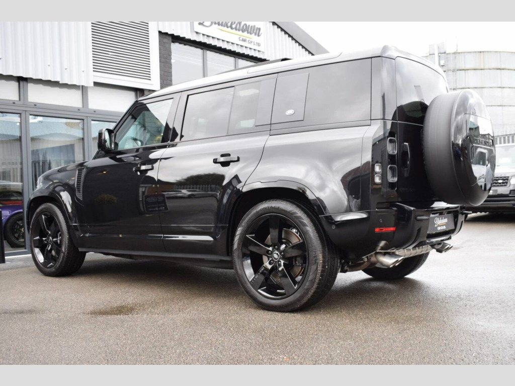 June 2022 22 Land Rover Defender 110 5.0 P525 V8 Auto 4WD finished in Santorini Black Metallic with Ebony Dinamica® suedecloth and Robustec interior. A mere 2400 miles covered by just one owner and supplied with Land Rover warranty in place until June 2025. As you would expect, this 110 is presented in flawless showroom condition inside and out. Supplied with all correct documentation, handbooks, accessories etc and this car has been subjected to our usual strict pre delivery inspection and preparation process ensuring all cosmetic and mechanical elements are in good order. This example benefits from a dog guard and optional painted spare wheel cover on top of the already impressive 5.0 V8 specification which includes: 22 Style 5098 Gloss Black Alloys, 22 full size spare wheel, Sliding panoramic roof, Privacy glass, Matrix LED headlights with signature DRL, 14-way heated and cooled electric memory front seats with 4-way manual headrests, 40:20:40 folding and heated rear seats with centre armrest, Front centre console refrigerator compartment, Ebony Morzine headlining, Heated steering wheel, Electrically adjustable steering column, Meridian™ Surround Sound System, Interactive Driver Display, 11.4 Touchscreen and more.