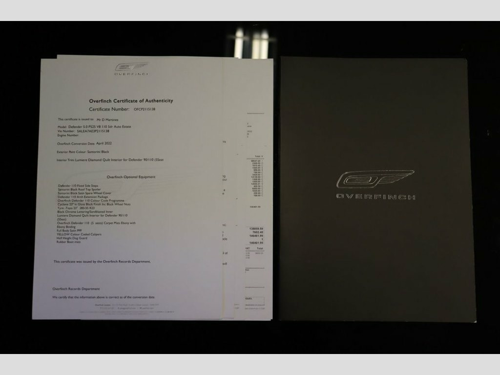 Just Arrived Into Stock - Here We Are Proud To Present The Land Rover Defender 5.0 P525 V8 - Overfinch! Previously Owned By A Premiership Footballer, This Impressive Example Is Equipped With A Powerful 5.0L Petrol Engine And A Robust Four Wheel Drive System, Ensuring Capability In All Conditions. As A Euro 6 Compliant Vehicle, It Meets Modern Emissions Standards, And Its Substantial Towing Weight Of 3500 Kg Makes It Ideal For A Variety Of Tasks. With Only One Former Keeper, Kitted With A Full Overfinch Kit Including Interior Conversion - This Is An Extremely Rare Example And Not One You Want To Miss Out On! OVERFINCH OPTIONAL EQUIPMENT: - Defender 110 Fixed Side Steps - Roof Top Spoiler In Santorini Black - Santorini Black Satin Spare Wheel Cover - Defender 110 Arch Extension Package - Overfinch Defender 110 Colour Code Programme - Cyclone 23" Alloys In Gloss Black (With Black Wheel Nuts) - Black Chrome Lettering - Lumiere Diamond Quilt Interior - Overfinch Defender Carpet Mats - Full Body Satin PPF - Yellow Colour Codes Calipers - Half Height Dog Guard - Rubber Boot Mats EXTERIOR SPECIFICATION: - Opening Panoramic Glass Roof - Rear Tinted Privacy Glass - Xenon Headlights - LED Daytime Running Lights - Electric Tow Bar - 360 Cameras - Reversing Camera - Electric Folding Wing Mirrors INTERIOR SPECIFICATION: - Electric Memory Seats - Front And Rear Heated Seats - Front Cooled Seats - Alcantara Steering Wheel - Heated Steering Wheel - Cruise C 11.4in Touchscreen, 12V Socket in Loadspace, 14-Way Heated and Cooled Electric Memory, 22in Alloy Wheels - Style 5098 - 5 Spoke, 22in Full Size Spare Wheel, 360 Degree Parking Aid, 3D Surround Camera, 40-20-40 Folding - Heated Rear Seats wit, ABS - Anti Lock Braking System, ACC - Adaptive Cruise Control, Activity Key, Adaptive Dynamics, Advanced Tow Assist, Air Quality Sensor, Airbags - Driver, Airbags - Front Passenger, All Season Tyres, Alpine Lights, Android Auto, Apple CarPlay, Assisted Tailgate with Soft Close, ATPC - All Terrain Progress Control, Automatic Headlight Levelling, Automatic Headlights and Rain Sensing Wi, Black Contrast Roof, Black Exposed Rear Recovery Eyes, Blind Spot As