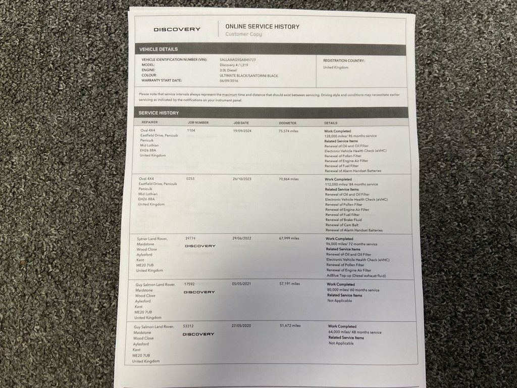 JAD MOTOR would like to proudly present this stunning 2016 LAND ROVER DISCOVERY 4 LANDMARK 3.0L V6! 1 Key. 4 Former Owners. SERVICE: FULL LR SERVICE HISTORY! ( see pics ) LAST SERVICED ON 09.24 AT 75574 MILES & MOT TILL OCT 26 TOO! CAM BELT WAS REPLACED IN 10.23 AT 70864 MILES! F/R PADS & REAR DISCS CHANGED IN 2025! DESCRIPTION: Exterior: This Discovery 4 exudes presence and purpose. Its strong bonnet line, bold silhouette and high-riding stance underscore its capability, while the Landmark trim adds refined detailing including premium body-coloured elements, chrome roof rails, and stylish 20" alloy wheels ( 4x Pirelli Scorpion tyres ) that enhance its refined appearance. The side-steps provide practicality, while privacy glass, bright finish roof rails and adaptive Xenon headlights integrate seamlessly into the upscale design. Whether navigating city streets or heading off on an adventure, this Discovery looks the part. Interior: Inside, the cabin surrounds you in comfort and elegance. Full leather upholstery with heating/memory & lumbar functions for driver, detailed stitching and quality trim surfaces lend a premium feel throughout. The second-row seats are heated too and fold to adapt to varying load and passenger needs, while the third-row seats ensure full seven-seat capability, ideal for families or groups. Features such as electric sunroof and rear entertainment package ( TV's, headphones & remote ) ensure a luxurious experience for all passe 20in Alloy Wheels - 5 Split-Spoke Style , 7in Touch Screen, 825W Meridian Surround Sound System with, Active Roll Mitigation - ARM, Adaptive Xenon Headlights, Adjustable Front Head Restraints, Airbags - Driver and Passenger Side, Airbags - Full Size Driver, Airbags - Full Size Passenger, Airbags - Row One and Two Head Curtain, Airbags - Third Row Curtain, All-Terrain ABS - Anti-Lock Braking Syst, Approach Lights, Audible Seat Belt Warning, Auto-Dimming Interior Mirror, Automatic Headlights, Bluetooth Telephone Connectivity, Bright Pack, Carpet Mats - Premium - Front and Rear w, Centre High Mounted Stop Light, Climate Control - Automatic with Air Fil, Colour Coded Front Bumper and Tailgate L,