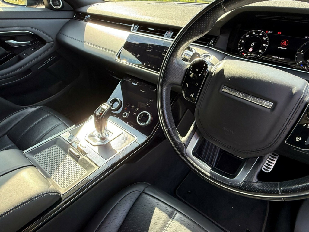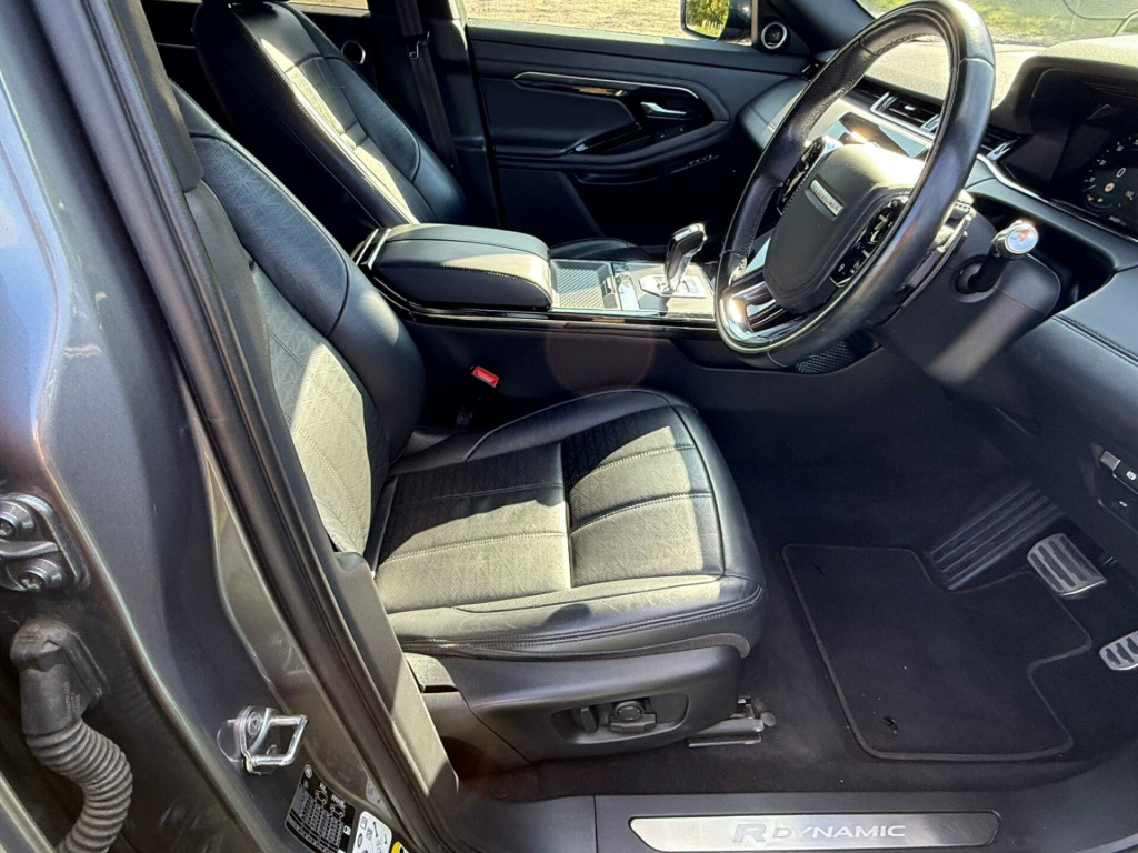 This 2019 Land Rover Range Rover Evoque D180 R Dynamic HSE is a superb example of a premium compact SUV, boasting a sophisticated 2.0L diesel engine and a robust Four Wheel Drive system. As a Euro 6 compliant vehicle, it meets stringent emission standards. This particular model comes equipped with desirable features such as Adaptive Cruise Control for effortless long journeys, Two Zone Climate Control to ensure comfort for all occupants, and a handy Rear View Camera to aid with parking. Connectivity is also a breeze with Bluetooth and Apple CarPlay integration, keeping you entertained and informed on the go.The performance of this Evoque is noteworthy, achieving 0-60mph in a brisk 8.8 seconds, demonstrating its responsive acceleration. This capability, combined with its advanced technology and the renowned Land Rover build quality, positions it as a compelling choice for those seeking a refined and capable vehicle that stands out from the crowd.WE OPERATE BY APPOINTMENT ONLY. PLEASE CALL THE SHOWROOM TO BOOK A TIME SLOT. SUPPLIED WITH 6 MONTHS RAC PLATINUM PLUS WARRANTY, 12 MONTH BREAKDOWN COVER AND RAC APPROVED 82 POINT COMPLIANT INSPECTION -way heated electric memory front seats, 20in alloy wheels - 5 split-spoke - style 5079 - gloss dark grey with contrast diamond turned finish, 360 degree parking aid, 40-20-40 split fold rear seat, abs - anti lock braking system, acc - adaptive cruise control, atpc - all terrain progress control, airbags - driver knee, airbags - front - driver and front passenger, all season tyres, android auto, apple carplay, auto-dimming power fold - heated door mirrors with memory and approach lights, automatic headlight levelling, autonomous emergency braking, black gearshift paddles, blind spot assist, bluetooth connectivity, body coloured roof, brake pad wear indicator, bright metal pedals, carpet mats, chrome treadplates, clear exit monitor, clearsight interior rear view mirror, climate control - rear vents, customer configurable autolock, d180 badge, dab - digital audio broadcast, dsc - dynamic stability control, driver condition monitor, eba - emergency brake assist, ebd - electronic brake-force distribution, epas - electronic power assisted steering, etc - electronic traction control, efficient driveline, electric parking brake, electric windows with one-touch open-close and anti-trap, evoque and r-dynamic badge, extended leather upgrade, flush deployable door handles, gesture tailgate, hdc - hill descent control, hse badge, headlights - automatic high beam assist, headlining - ebony morzine, heated rear window with timer, high speed emergency braking, hill launch assist, incontrol - remote app, incontrol apps, interactive driver display, interior lighting, intrusion sensor, keyless entry, lane keep assist, locking wheel nuts, low traction launch, manually adjustable steering column, meridian sound system 380w, navigation pro, overhead lighting console, overhead stowage for sunglasses, park assist, passive front headrests, passive suspension, perforated leather steering wheel with atlas bezel, power operated child locks, power socket pack 1, premium led headlights with signature drl, pro services and wi-fi hotspot, push button start, r-dynamic exterior pack, rsc - roll stability control, rain sensing windscreen wipers and automatic headlights - automatic, rear fog lights, rear isofix, rear traffic monitor, rear view camera, seat belt reminder, seats - rear centre head restraint, shadow atlas - range rover - bonnet and tailgate script, side curtain airbags and thorax, smart settings, sun visors - illuminated vanity mirrors, tpms - tyre pressure monitoring system, tailgate spoiler, terrain response 2, torque vectoring, touch pro duo, traffic sign recognition and adaptive speed limiter, trim finish - gradated linear dark aluminium, twin front cupholders with cover, twin sliding front centre armrest, two-zone climate control, tyre repair system, voice control, windscreen - heated, windscreen washer jets - heated