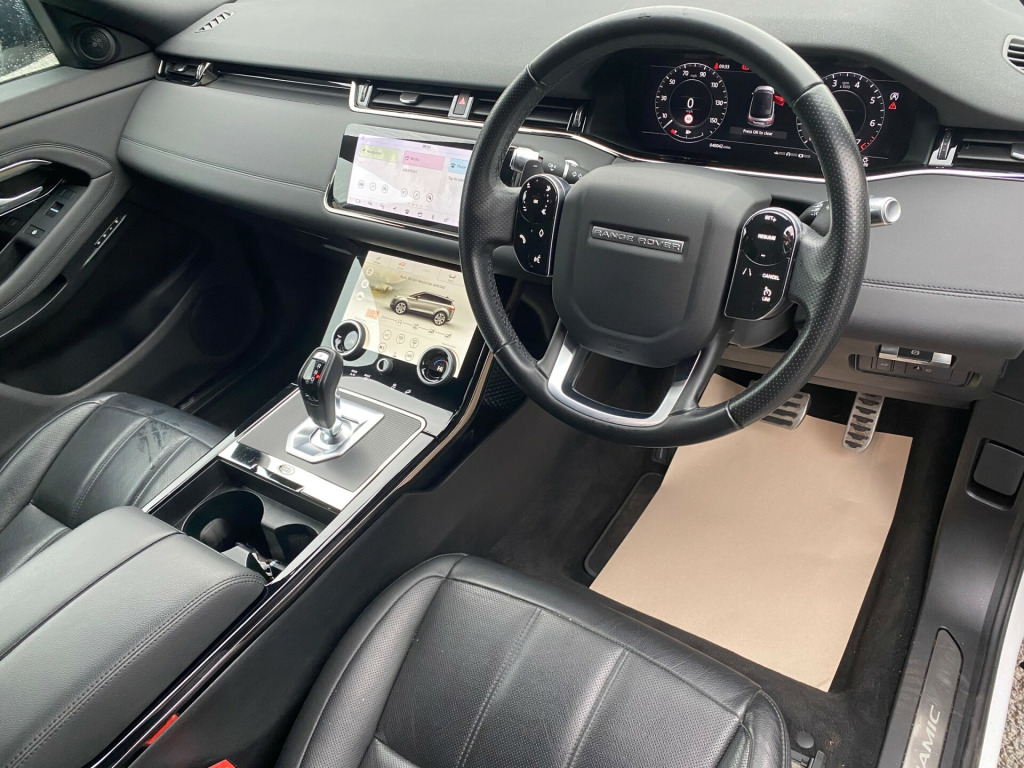 This 2019 Land Rover Range Rover Evoque 2.0 P250 MHEV R-Dynamic SE SUV with 40042 miles on the clock is a stylish and powerful vehicle. This SUV runs on Petrol and is ULEZ compliant, making it environmentally friendly. With 5 seats and 5 doors, it offers plenty of space for passengers and cargo. The MOT expires on 25/02/2027, providing peace of mind for the future. Equipped with features such as 14-way Heated Electric Memory Front Seats, 40-20-40 Split Fold Rear Seat, Auto-Dimming Interior Rear View Mirror, Black Gearshift Paddles, and Bright Metal Pedals, this car offers comfort and convenience for the driver and passengers. With its Euro 6 (s/s) (249 ps) engine and automatic 4WD transmission, this SUV delivers a smooth and powerful driving experience.- Service history - Supplied with 12 months MOT - Finance available - Part exchange welcome - Extended warranties available , -way - heated electric memory front seats, 40-20-40 split fold rear seat, auto-dimming interior rear view mirror, black gearshift paddles, bright metal pedals, carpet mats, chrome treadplates, climate control - rear vents, headlining - ebony morzine, interactive driver display, interior lighting, manually adjustable steering column, overhead lighting console, overhead stowage for sunglasses, passive front headrests, perforated leather steering wheel, powered tailgate, push button start, rain sensing windscreen wipers and automatic headlights - automatic, seats - rear centre head restraint, smart settings, sun visors - illuminated vanity mirrors, trim finish - gradated linear dark aluminium, twin front cupholders with cover, twin sliding front centre armrest, two-zone climate control, 20in alloy wheels - 5 split-spoke - style 5079 - gloss sparkle silver, all season tyres, auto-dimming power fold - heated door mirrors with memory and approach lights, body coloured roof, electric windows with one-touch open-close and anti-trap, evoque and r-dynamic badge, flush deployable door handles, heated rear window with timer, locking wheel nuts, p250 badge, r-dynamic exterior pack, rear fog lights, se badge, shadow atlas - range rover - bonnet and tailgate script, tailgate spoiler, tyre repair system, windscreen - heated, windscreen washer jets - heated, 360 degree parking aid, atpc - all terrain progress control, brake pad wear indicator, cruise control and speed limiter, driver condition monitor, epas - electronic power assisted steering, efficient driveline, park assist, passive suspension, rear view camera, tpms - tyre pressure monitoring system, terrain response 2, torque vectoring, traffic sign recognition and adaptive speed limiter, voice control, abs - anti lock braking system, airbags - driver knee, airbags - front - driver and front passenger, autonomous emergency braking, clear exit monitor, customer configurable autolock, dsc - dynamic stability control, eba - emergency brake assist, ebd - electronic brake-force distribution, etc - electronic traction control, electric parking brake, hdc - hill descent control, hill launch assist, intrusion sensor, lane keep assist, low traction launch, power operated child locks, rsc - roll stability control, rear isofix, rear traffic monitor, seat belt reminder, side curtain airbags and thorax, android auto, apple carplay, bluetooth connectivity, dab - digital audio broadcast, incontrol - remote app, incontrol apps, navigation pro, power socket pack 1, pro services and wi-fi hotspot, sound system, touch pro duo, automatic headlight levelling, headlights - automatic high beam assist, premium led headlights with signature drl