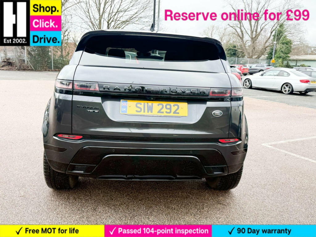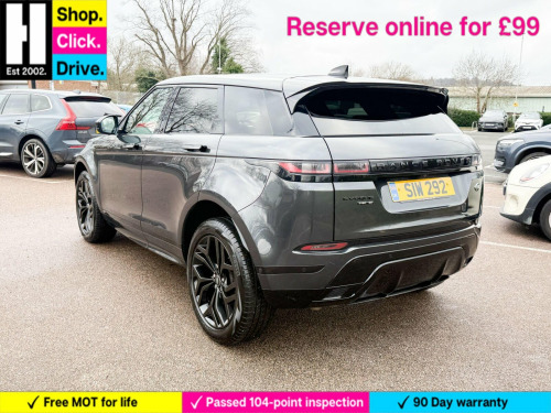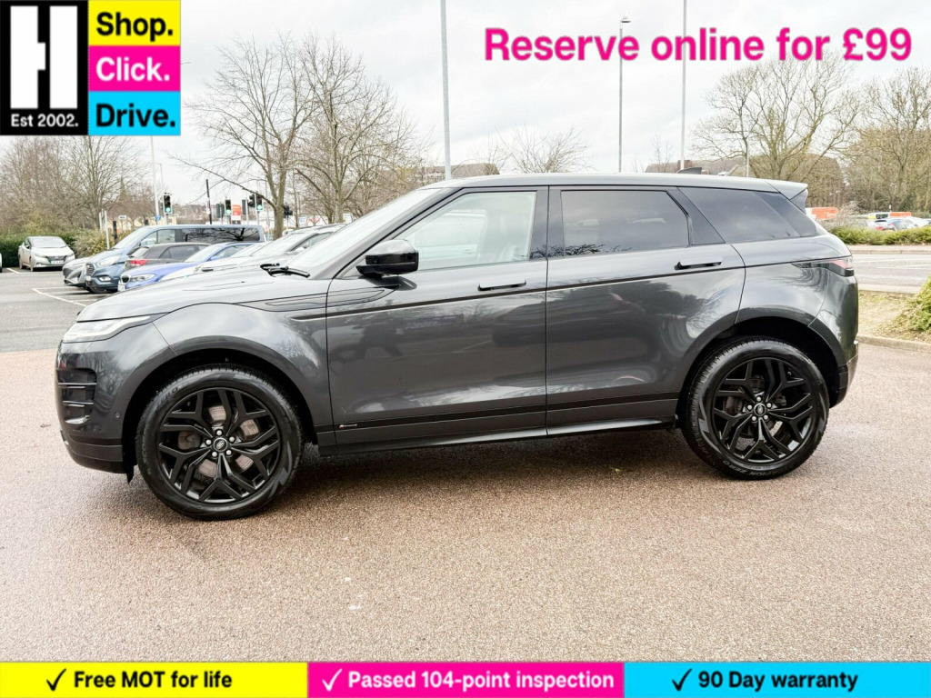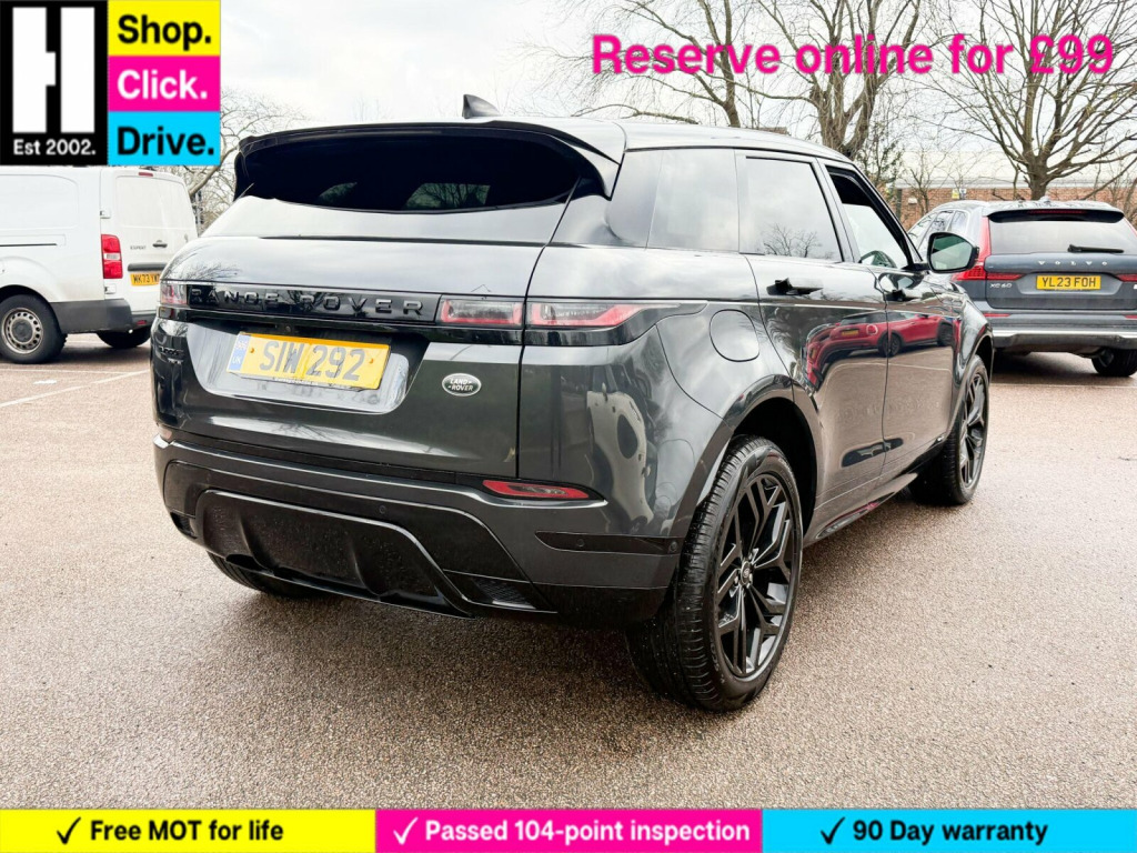20in Alloy Wheels - 5 Split-Spoke - Style 5079 - Gloss Black, Black Exterior Pack, Fixed Panoramic Roof Including Powered Blind, Privacy Glass, Steering Wheel - Heated, Grained Leather - Ebony with Ebony-Ebony Interior, 14-way - Heated Electric Memory Front Seats, 20in Alloy Wheels - 5 Split-Spoke - Style 5079 - Gloss Sparkle Silver, 360 Degree Parking Aid, 40-20-40 Split Fold Rear Seat, ABS - Anti Lock Braking System, ATPC - All Terrain Progress Control, Airbags - Driver Knee, Airbags - Front - Driver and Front Passenger, All Season Tyres, Ambient Interior Lighting, Android Auto, Apple CarPlay, Auto-Dimming Interior Rear View Mirror, Auto-Dimming Power Fold - Heated Door Mirrors with Memory and Approach Lights, Automatic Headlight Levelling, Automatic Headlights, Autonomous Emergency Braking, Black Gearshift Paddles, Bluetooth Connectivity, Body Coloured Roof, Brake Pad Wear Indicator, Bright Metal Pedals, Carpet Mats, Chrome Treadplates, Clear Exit Monitor, Cruise Control and Speed Limiter, Customer Configurable Autolock, D180 Badge, DAB - Digital Audio Broadcast, DSC - Dynamic Stability Control, Driver Condition Monitor, EBA - Emergency Brake Assist, EBD - Electronic Brake-Force Distribution, EPAS - Electronic Power Assisted Steering, ETC - Electronic Traction Control, Efficient Driveline, Electric Parking Brake, Electric Windows with One-Touch Open-Close and Anti-Trap, Evoque and R-Dynamic Badge, Flush Deployable Door Handles, Front and Rear Animated Directional Indicators, HDC - Hill Descent Control, Headlights - Automatic High Beam Assist, Headlining - Ebony Morzine, Heated Rear Window with Timer, Hill Launch Assist, InControl - Remote App, InControl Apps, Interactive Driver Display, Intrusion Sensor, Lane Keep Assist, Leather Steering Wheel, Locking Wheel Nuts, Low Traction Launch, Manually Adjustable Steering Column, Navigation Pro, Overhead Lighting Console, Overhead Stowage for Sunglasses, Park Assist, Passive Front Headrests, Passive Suspension, Power Operated Child Locks, Power Socket Pack 1, Powered Tailgate, Premium LED Headlights with Signature DRL, Pro Services and Wi-Fi Hotspot, Push Button Start, R-Dynamic Exterior Pack, RSC - Roll Stability Control, Rain Sensing Windscreen Wipers, Rear Air Vents, Rear Fog Lights, Rear ISOFIX, Rear Traffic Monitor, Rear View Camera, SE Badge, Seat Belt Reminder, Seats - Rear Centre Head Restraint, Side Curtain Airbags and Thorax, Smart Settings, Sound System, Standard Roof, Sun Visors - Illuminated Vanity Mirrors, TPMS - Tyre Pressure Monitoring System, Tailgate Spoiler, Terrain Response 2, Torque Vectoring, Touch Pro Duo, Traffic Sign Recognition and Adaptive Speed Limiter, Trim Finish - Gradated Linear Dark Aluminium, Twin Front Cupholders with Cover, Twin Sliding Front Centre Armrest, Two-Zone Climate Control, Tyre Repair System, Voice Control, Windscreen - Heated, Windscreen Washer Jets - Heated