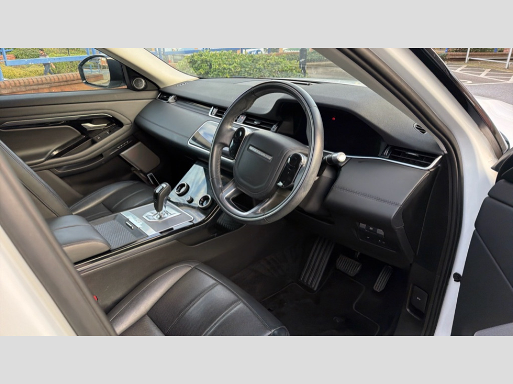 Windscreen - Heated 360 degree parking aid, Android Auto, Apple car play, Blind spot assist, Bluetooth connectivity, Brake pad wear indicator warning light, Clear exit monitor, Driver condition monitor, Duo touch pro, Electronic power assisted steering (EPAS), InControl remote, Interactive Driver display instrument cluster, Land Rover InControl apps, Lane keep assist, Navigation pro system, Park assist - Parallel, perpendicular and parking exit, Powered gesture tailgate/boot lid, Pro services and wifi hotspot, Push button starter, Rear traffic monitor, Smart settings, Traffic sign recognition with adaptive speed limiter, Voice control system, All terrain progress control, Efficient Driveline, Passive suspension, Terrain Response 2 Auto, Digital Audio Broadcast radio-DAB, Steering wheel mounted controls, Automatic headlight levelling, ClearSight interior rear view mirror, Electric windows with one touch open/close and anti trap, Evoque badge, Flush deployable exterior door handles, Heated rear window with timer, Heated washer jets, Heated windscreen, Power fold, auto-dimming, heated door mirrors with memory and approach lights, Rain sensing windscreen wipers, Rear fog lights, Tailgate spoiler, 40:20:40 split folding rear seats, Isofix system on outer rear seats, Overhead lighting console, Overhead stowage for sunglasses, Passive front head restraints, Rear air vents, Rear centre headrest, Sunvisors with illuminated vanity mirrors, Twin front cupholders with cover, Twin sliding front centre armrest, 3 rear 3 point seatbelts, Anti-lock braking system (ABS), Customer configurable autolock, DSC - Dynamic Stability Control, Electronic brake force distribution, Electronic parking brake, Electronic traction control, Front and rear seatbelt reminder, High speed emergency braking, Hill descent control, Hill launch assist, Low traction launch, Power operated child locks, Roll stability control, Six airbags - Driver and passenger airbags/driver knee airbag/front side airbag and curtain airbags, Torque vectoring brake, Tyre pressure monitoring system, Alarm, Immobiliser, Intrusion sensor, Keyless entry, Locking wheel nuts