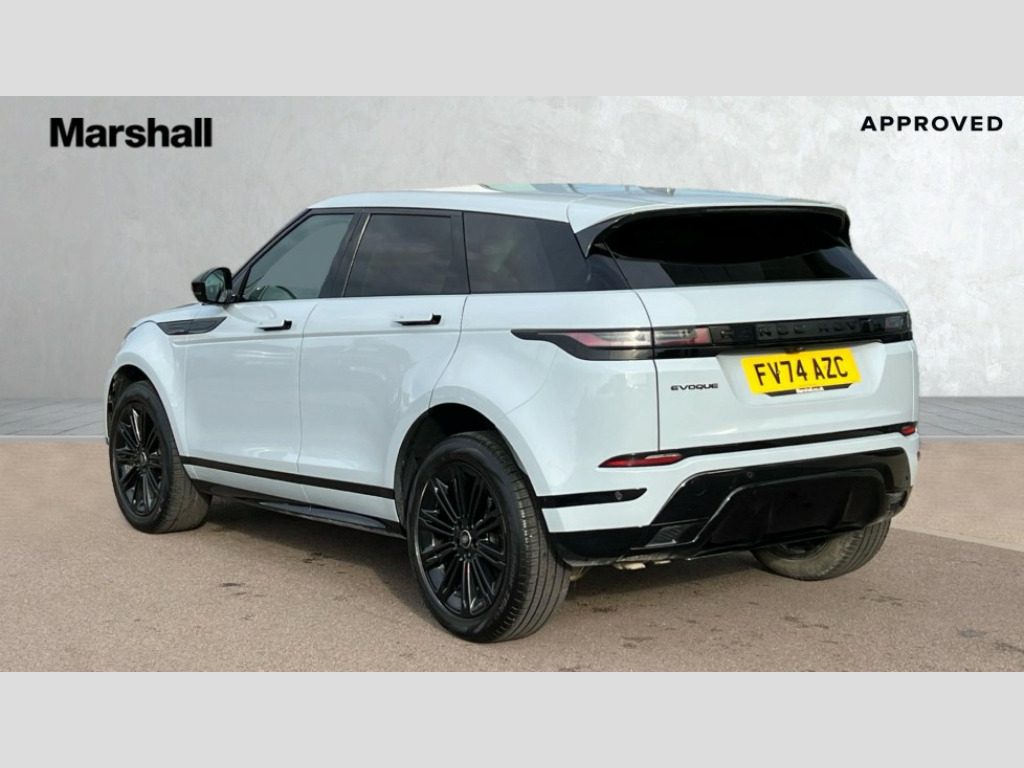 Land Rover Range Rover Evoque 2.0 D200 Dynamic SE 5dr Auto 11.4" touch screen, 3D 360 degree surround camera with wade sensing, Adaptive cruise control, Android Auto, Apple car play, Blind spot assist, Bluetooth connectivity, Brake pad wear indicator warning light, Driver condition monitor, eCall emergency system, Eco mode, Electronic power assisted steering (EPAS), Front and rear parking aid, InControl remote, Interactive driver display, Land Rover InControl apps, Lane keep assist, Pivi pro connected includes diamond pivi variant, smart settings, connected navigation pro, nuance speech licence, Powered tailgate/boot lid, Rear collision monitor, Rear traffic monitor, Tailgate, Traffic sign recognition with adaptive speed limiter, Voice control system, Wireless device charging, All terrain progress control, Diesel exhaust fluid (DEF) large tank, Efficient Driveline, Large fuel tank, Terrain Response 2, Digital Audio Broadcast radio-DAB, Steering wheel mounted controls, Acoustic laminated windscreen, Auto headlights, Auto high beam assist, Automatic headlight levelling, Electric windows with one touch open/close and anti trap, Flush deployable exterior door handles, Front and rear recovery eyes, Heated rear window with timer, Heated washer jets, Heated windscreen, LED headlights with signature DRL and LED tail Lights, Power fold, auto-dimming, heated door mirrors with approach lights and auto dimming driver side, Rain sensing windscreen wipers, Rear animated directional indicators, Rear fog lights, Rear side wing doors, Rear wiper, Side repeater indicators in mirror, Tailgate spoiler, Third brake light, Winter wiper park position, 12 way driver memory and 10 way passenger electric front seats with 2 way manual headrest + 4 way lumbar support, 40:20:40 split folding rear seats with centre headrest and armrest, Ambient interior lighting, Bright metal pedals, Carpet mats, Chrome tread plates with range rover branding Includes stainless steel loadspace scuff plate with etched graphic, Customer configurable single point entry, Front and rear cupholders, Heated front seats, Heated steering wheel, Isofix system on outer rear seats, Manually adjustable steering column, Overhead lighting console, Overhead stowage for sunglasses, Passive front head restraints, Rear air vents, Rear head restraints, Satin chrome gearshift paddles, SE Grained leather upholstery, Single passenger seat, Standard steering wheel with Moonlight Bezel, Sunvisors with illuminated vanity mirrors, Twin sliding front centre armrest, Power socket pack 2 - Evoque, 3 rear 3 point seatbelts, Anti-lock braking system (ABS), Brake hold function, Customer configurable autolock, DSC - Dynamic Stability Control, Electronic brake force distribution, Electronic parking brake, Electronic traction control, Emergency braking, Front and rear seatbelt reminder, Hill descent control, Hill launch assist, Low traction launch, Occupant protection assist, Passenger seat occupant detector, Power operated child locks, Roll stability control, Six airbags - Driver and passenger airbags/driver knee airbag/front side airbag and curtain airbags, Torque vectoring brake, Tyre pressure monitoring system, Alarm, Immobiliser, Intrusion sensor, Keyless entry, Locking wheel nuts, All season tyres