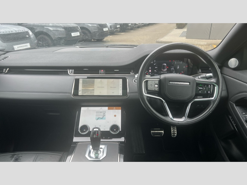 Land Rover Range Rover Evoque 2.0 D200 R-Dynamic HSE 5dr Auto 3D 360 degree surround camera, Adaptive cruise control, Android Auto, Apple car play, Blind spot assist, Bluetooth connectivity, Brake pad wear indicator warning light, Clear exit monitor, Driver condition monitor, Duo touch pro, Electronic power assisted steering (EPAS), InControl remote, Interactive Driver display instrument cluster, Land Rover InControl apps, Lane keep assist, Pivi pro connected includes upgraded infotainment, connected navigation pro, Nuance speech licence, Powered gesture tailgate/boot lid, Push button starter, Rear collision monitor, Rear traffic monitor, Traffic sign recognition with adaptive speed limiter, Voice control system, Wade Sensing, All terrain progress control, Efficient Driveline, Passive suspension, Terrain Response 2 Auto, Digital Audio Broadcast radio-DAB, Steering wheel mounted controls, Automatic headlight levelling, ClearSight interior rear view mirror, Electric windows with one touch open/close and anti trap, Evoque and R-Dynamic badge, Flush deployable exterior door handles, Heated rear window with timer, Heated washer jets, Heated windscreen, Power fold, auto-dimming, heated door mirrors with approach lights and auto dimming driver side, R-Dynamic branding illuminated metal tread plates in loadspace and row 1 with brand name script and non illuminated metal in row 2, Rain sensing windscreen wipers, Rear fog lights, Shadow atlas bonnet and tailgate script, Tailgate spoiler, 40:20:40 split folding rear seats with centre headrest and armrest, Ambient interior lighting, Bright metal pedals, Isofix system on outer rear seats, Overhead lighting console, Overhead stowage for sunglasses, Passive front head restraints, Rear air vents, Rear centre headrest, Satin chrome gearshift paddles, Sunvisors with illuminated vanity mirrors, Twin sliding front centre armrest, 3 rear 3 point seatbelts, Anti-lock braking system (ABS), Customer configurable autolock, DSC - Dynamic Stability Control, Electronic brake force distribution, Electronic parking brake, Electronic traction control, Emergency braking, Front and rear seatbelt reminder, Hill descent control, Hill launch assist, Low traction launch, Power operated child locks, Roll stability control, Six airbags - Driver and passenger airbags/driver knee airbag/front side airbag and curtain airbags, Torque vectoring brake, Tyre pressure monitoring system, Alarm, Immobiliser, Intrusion sensor, Keyless entry, Locking wheel nuts
